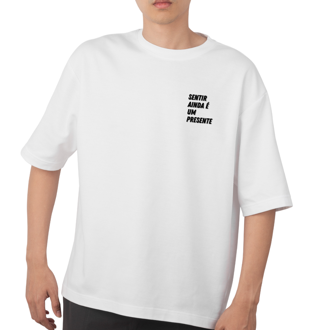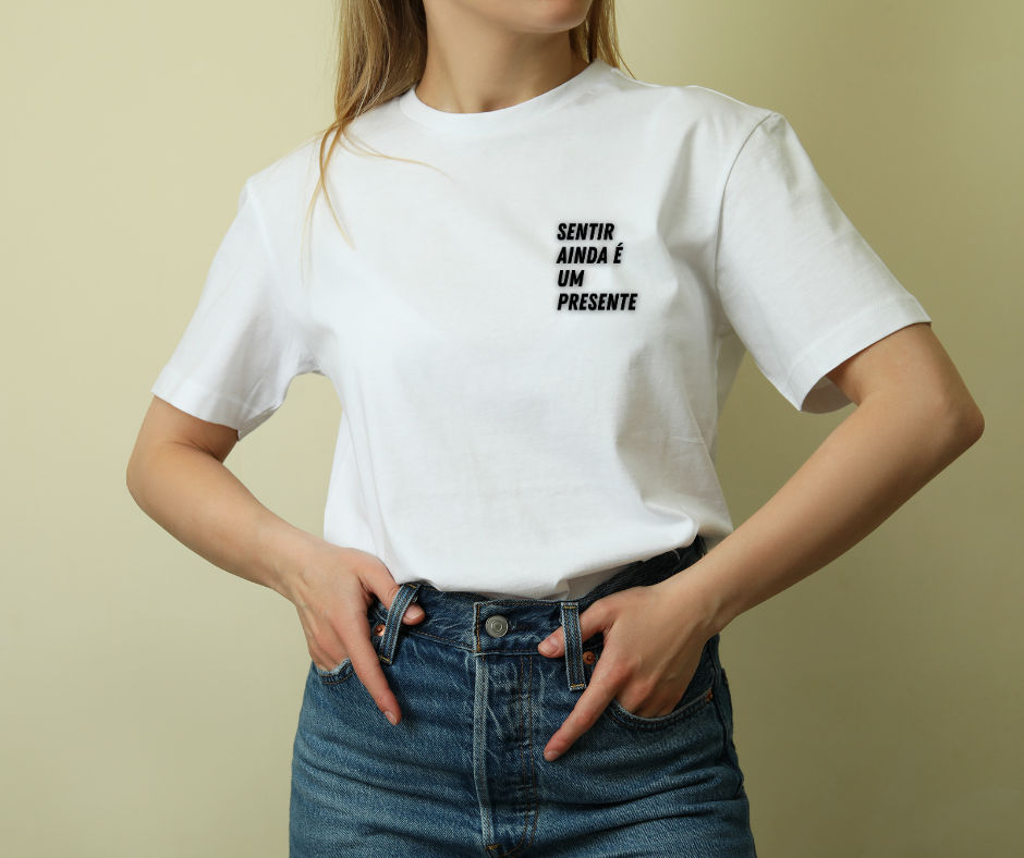 Camiseta inspirada no poema "Um presente", de 2019, e que consta nas fotos das camisetas.