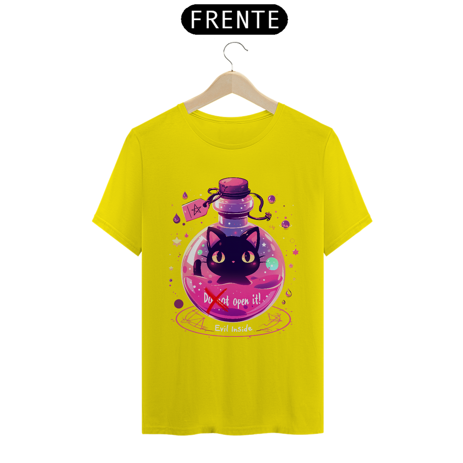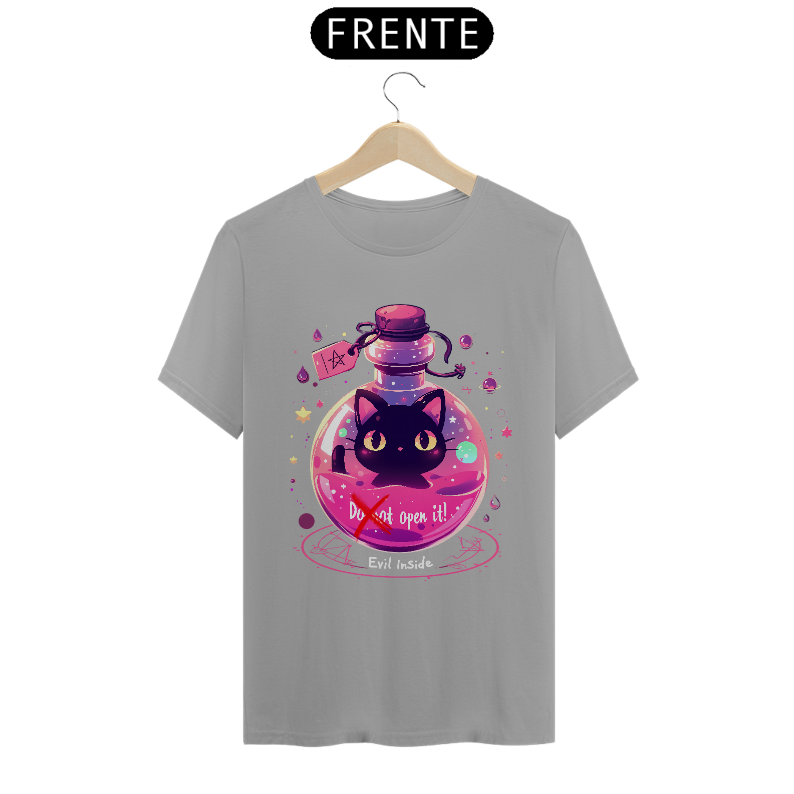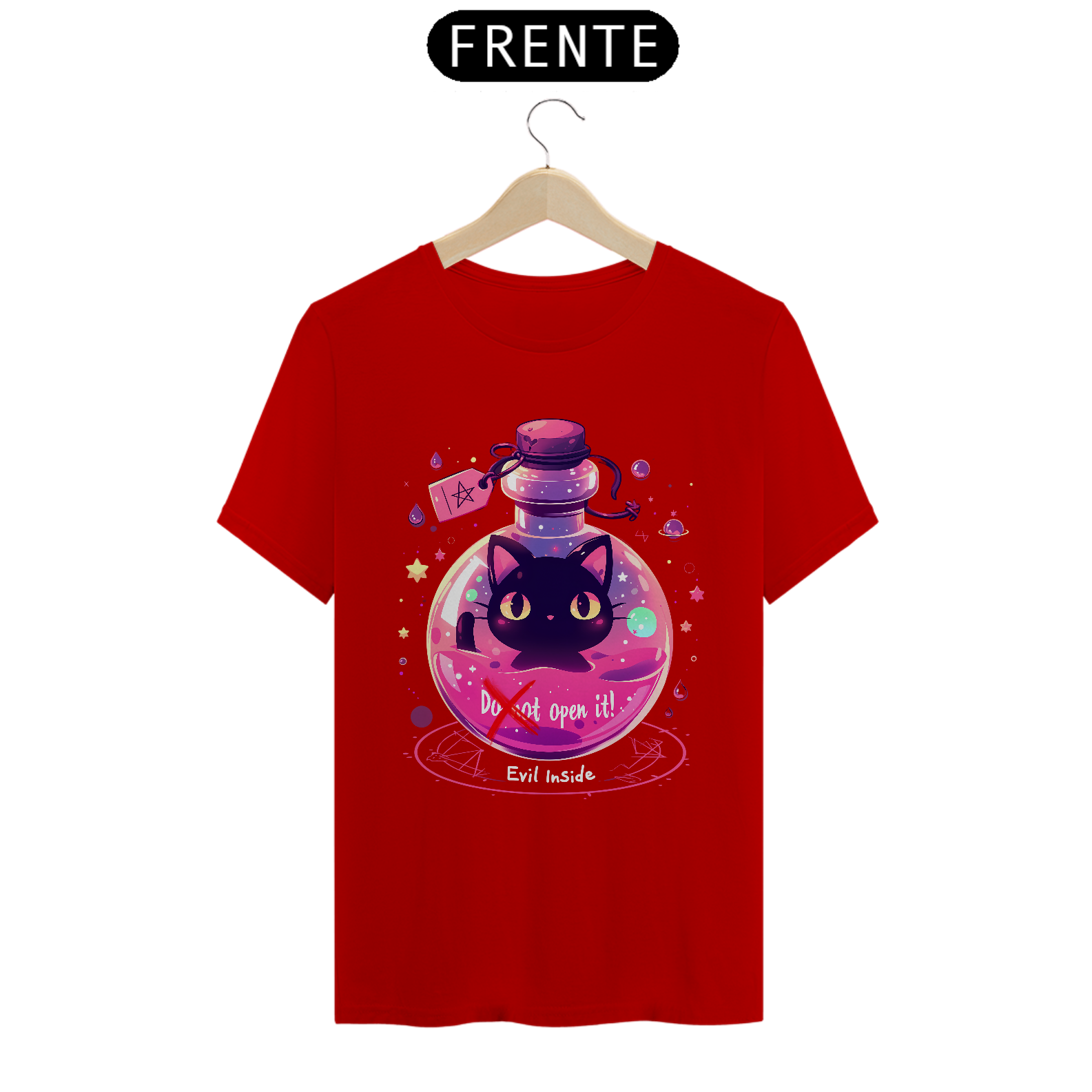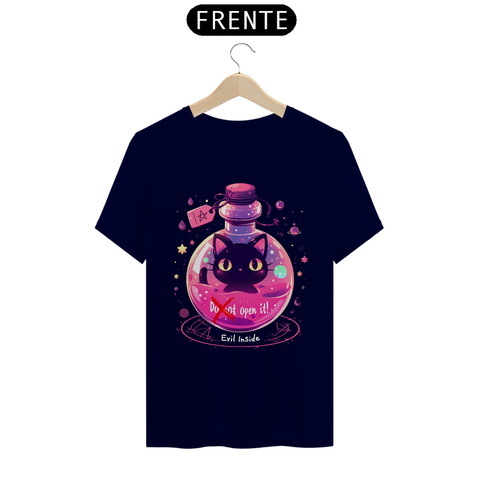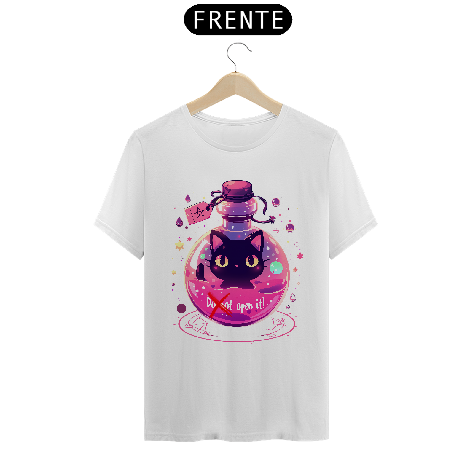 Desafie o destino com esta camiseta que retrata um gato maligno aprisionado em um frasco, com um aviso para não abrir - mas com sua fofura irresistível, quem pode resistir à tentação? Vista-se com humor e mistério, capturando a dualidade entre o perigo e a adorabilidade neste design único.