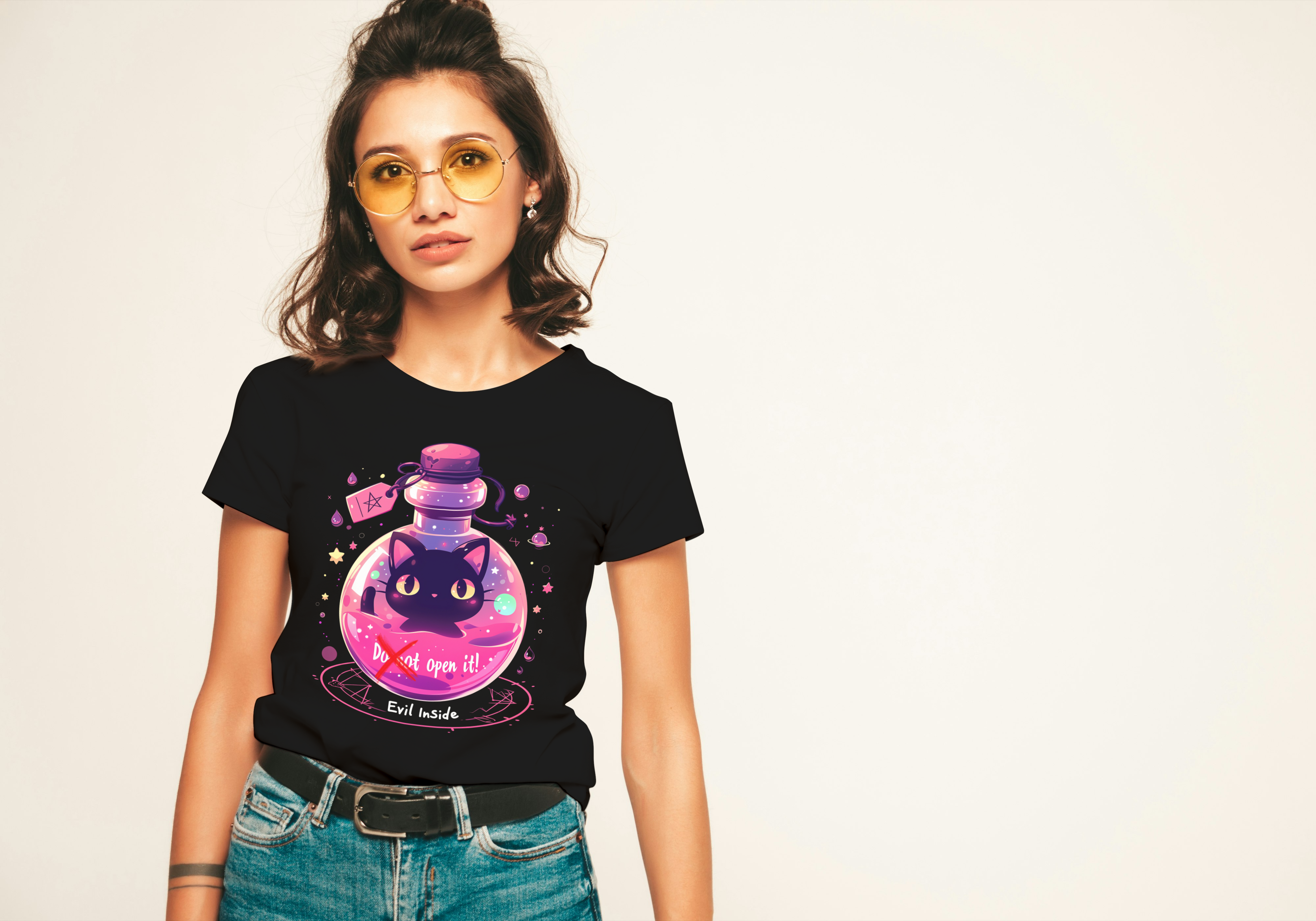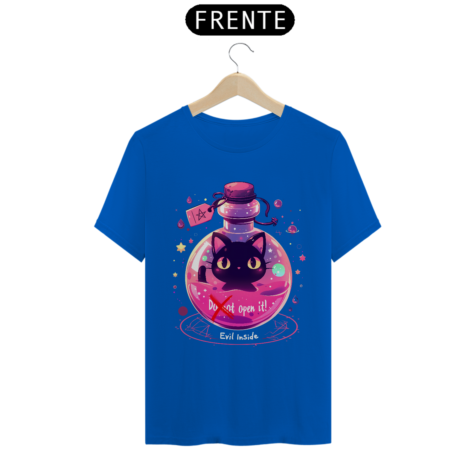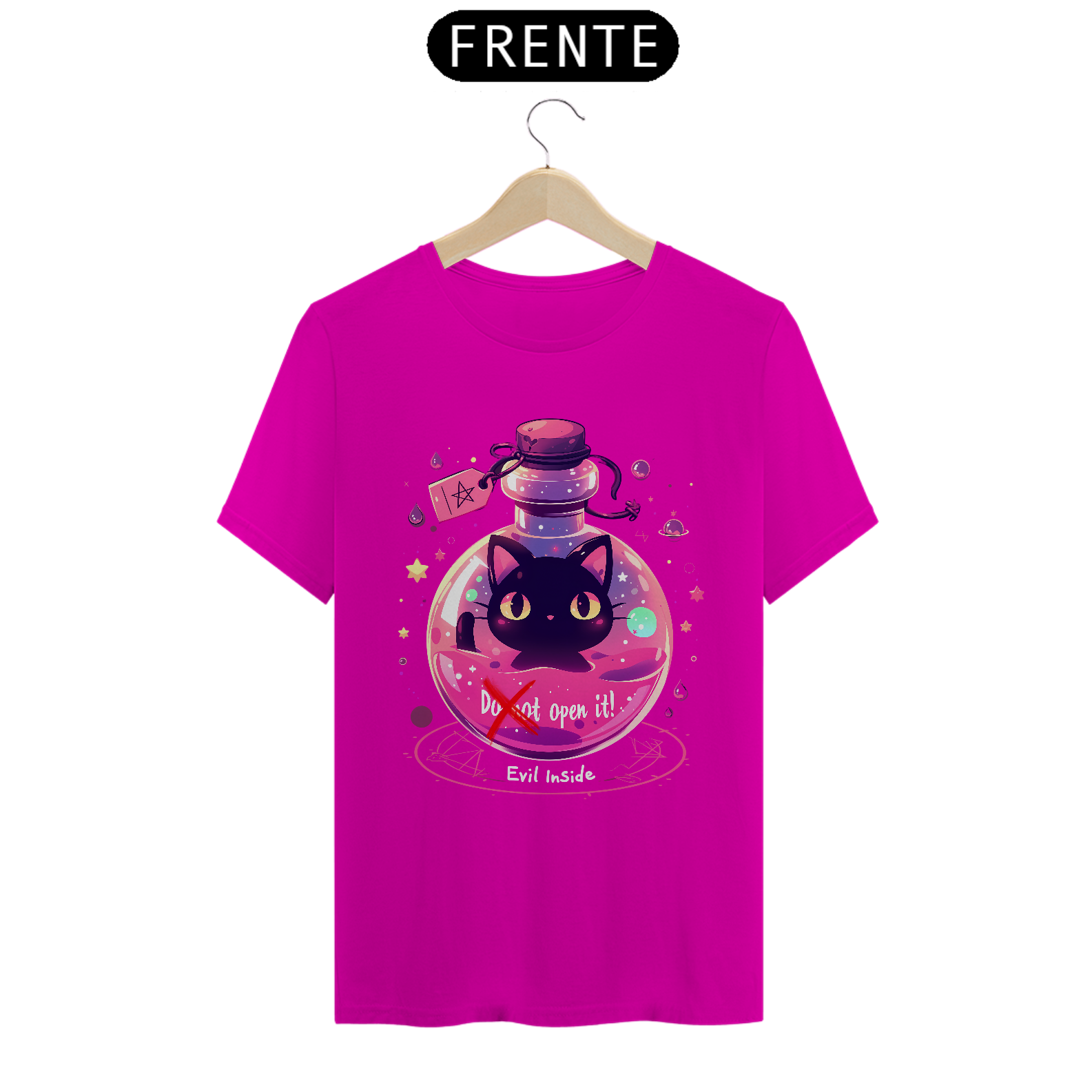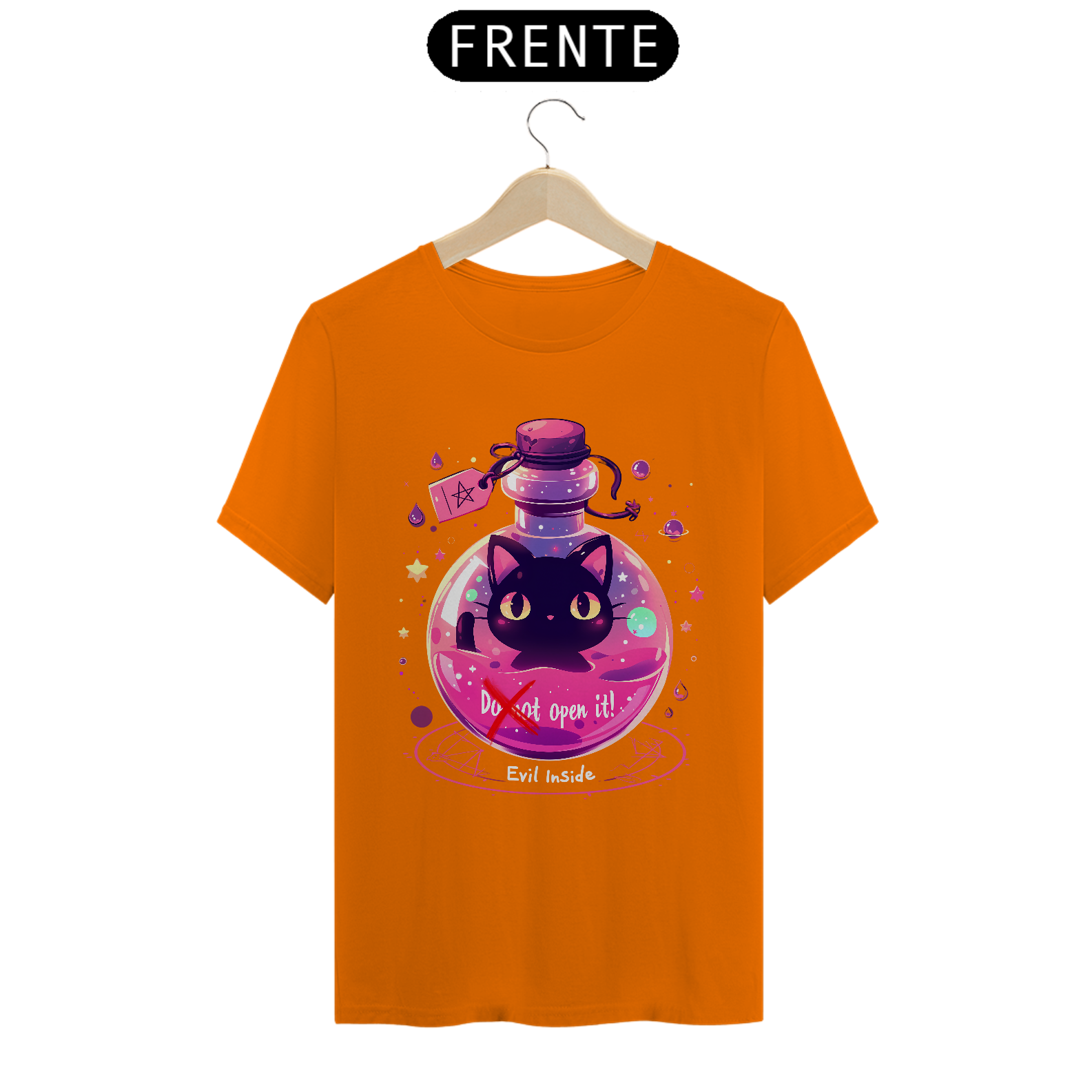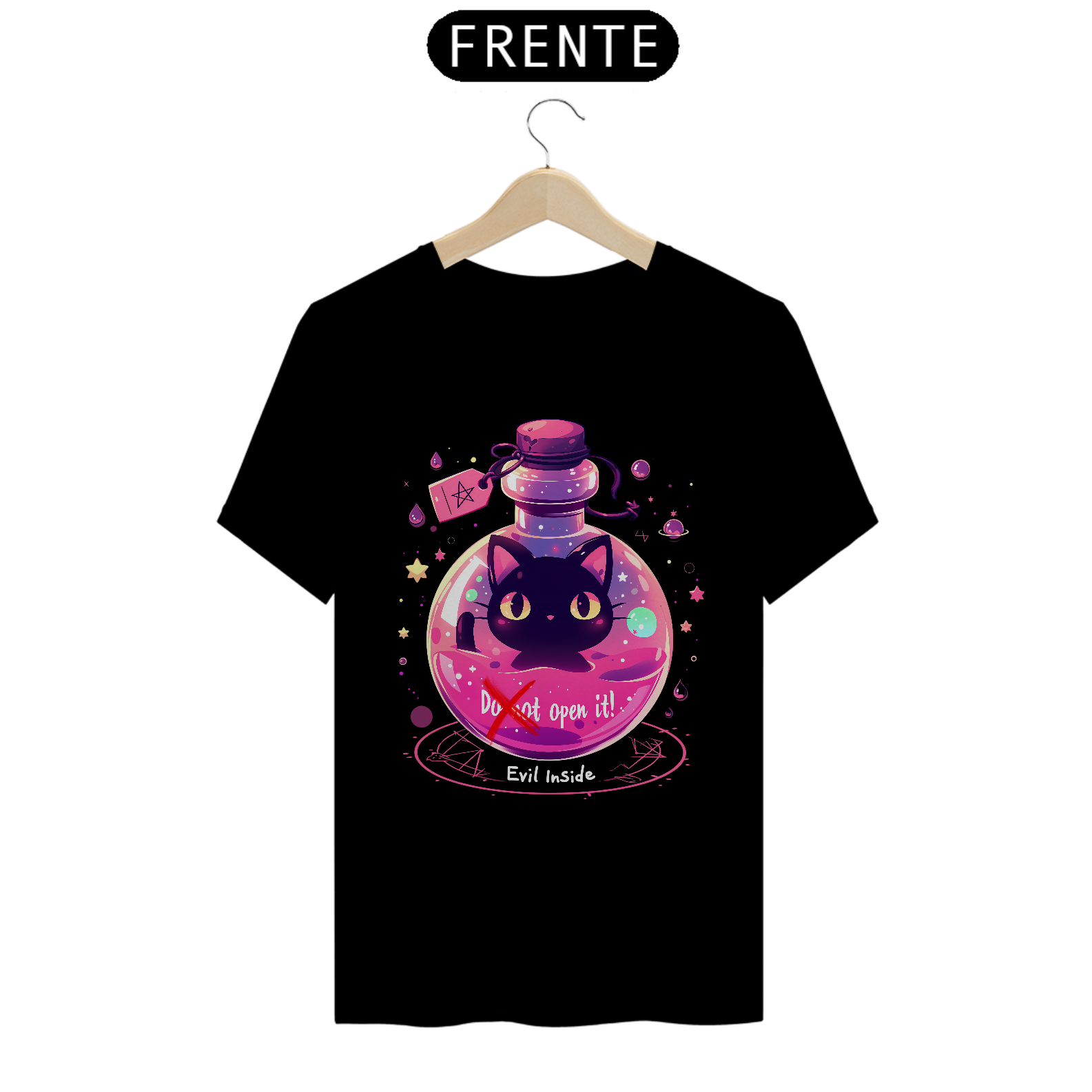 Desafie o destino com esta camiseta que retrata um gato maligno aprisionado em um frasco, com um aviso para não abrir - mas com sua fofura irresistível, quem pode resistir à tentação? Vista-se com humor e mistério, capturando a dualidade entre o perigo e a adorabilidade neste design único.