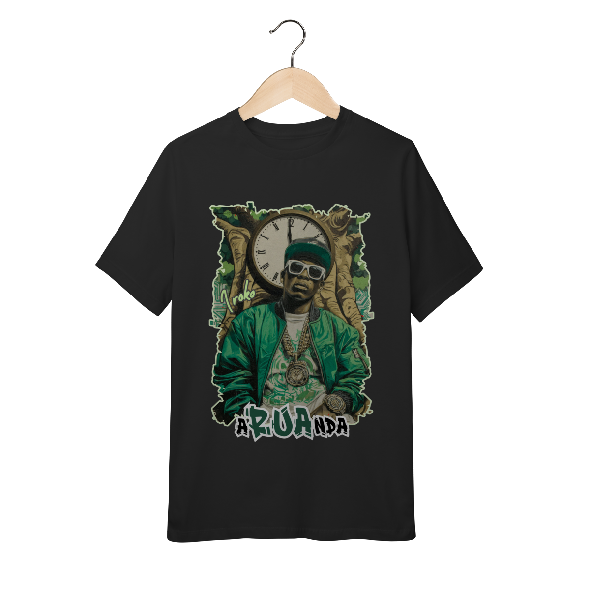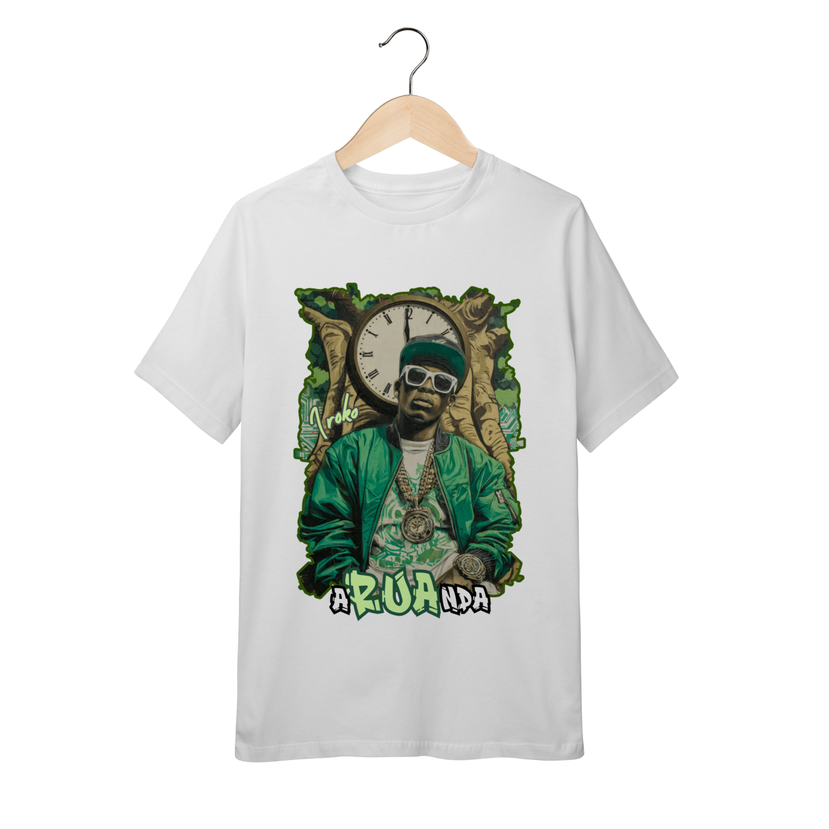 Pensada para crianças e pré-adolescentes que já têm personalidade, gostam de se expressar, curtem hip hop, arte, música e valorizam suas raízes, essa camiseta fortalece o orgulho de ser quem se é. Iroko surge com roupas de rapper, simbolizando resistência, sabedoria e movimento, mostrando que o tempo também anda de tênis, fala poesia e ocupa as ruas.