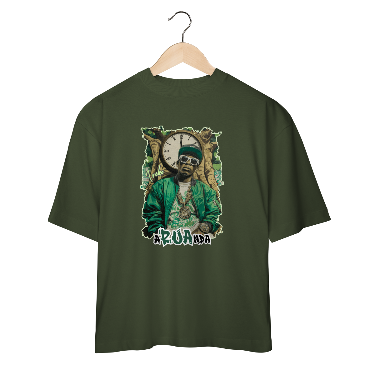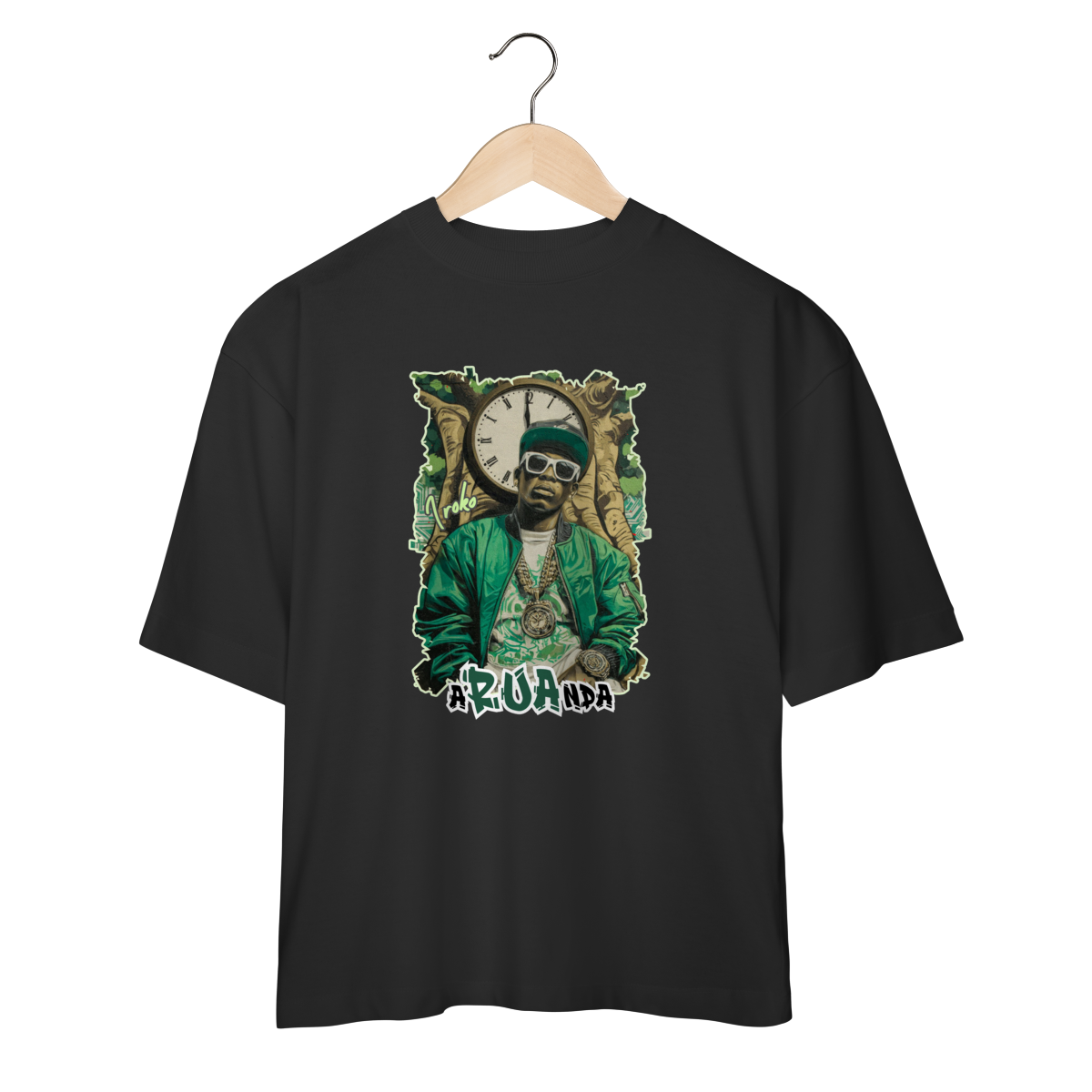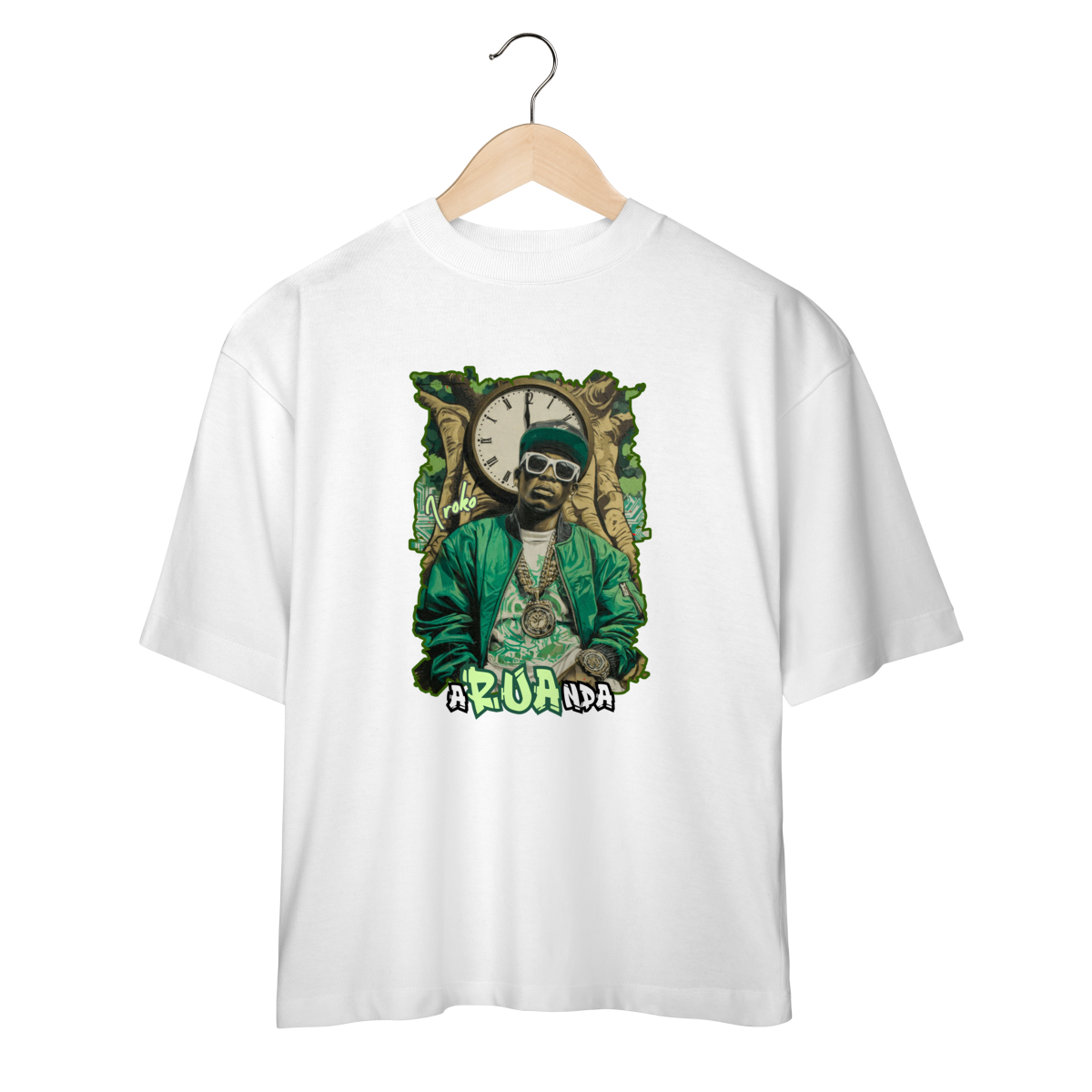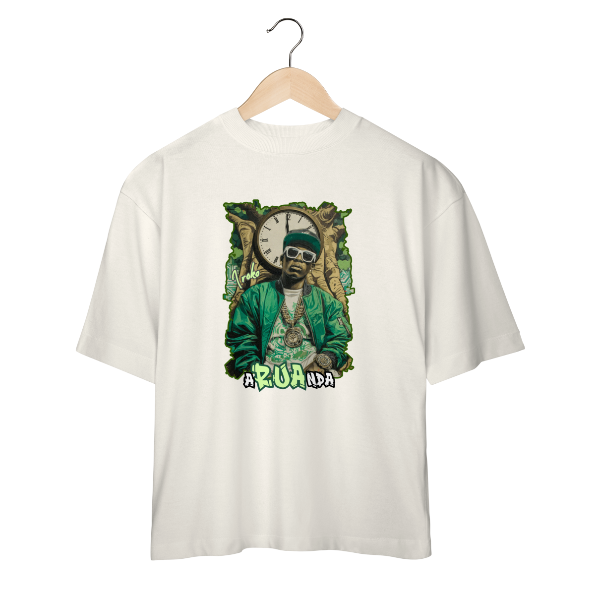 A Camiseta Oversized Iroko 01 da Loja Fala Poeta! não é só roupa: é manifesto. Com modelagem ampla, caimento pesado e atitude urbana, ela traduz o encontro entre ancestralidade africana e cultura hip hop. A estampa traz Iroko, o orixá do tempo, representado com roupas de rapper, simbolizando quem entende que o passado constrói o agora e projeta o futuro.
