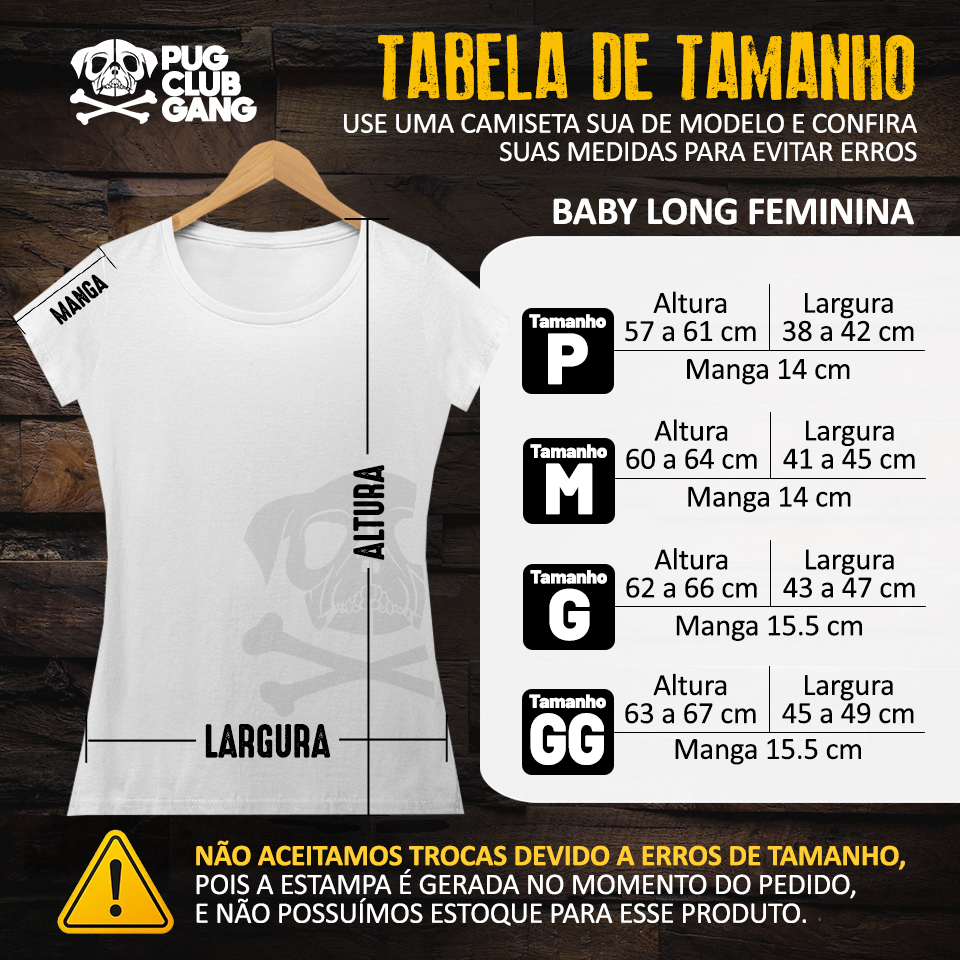 Cores do produto: Como cada tela de computador ou celular tem seu próprio jeito de mostrar cores, então a cor da sua camiseta e da estampa pode ser um pouco diferente do que você viu online.
