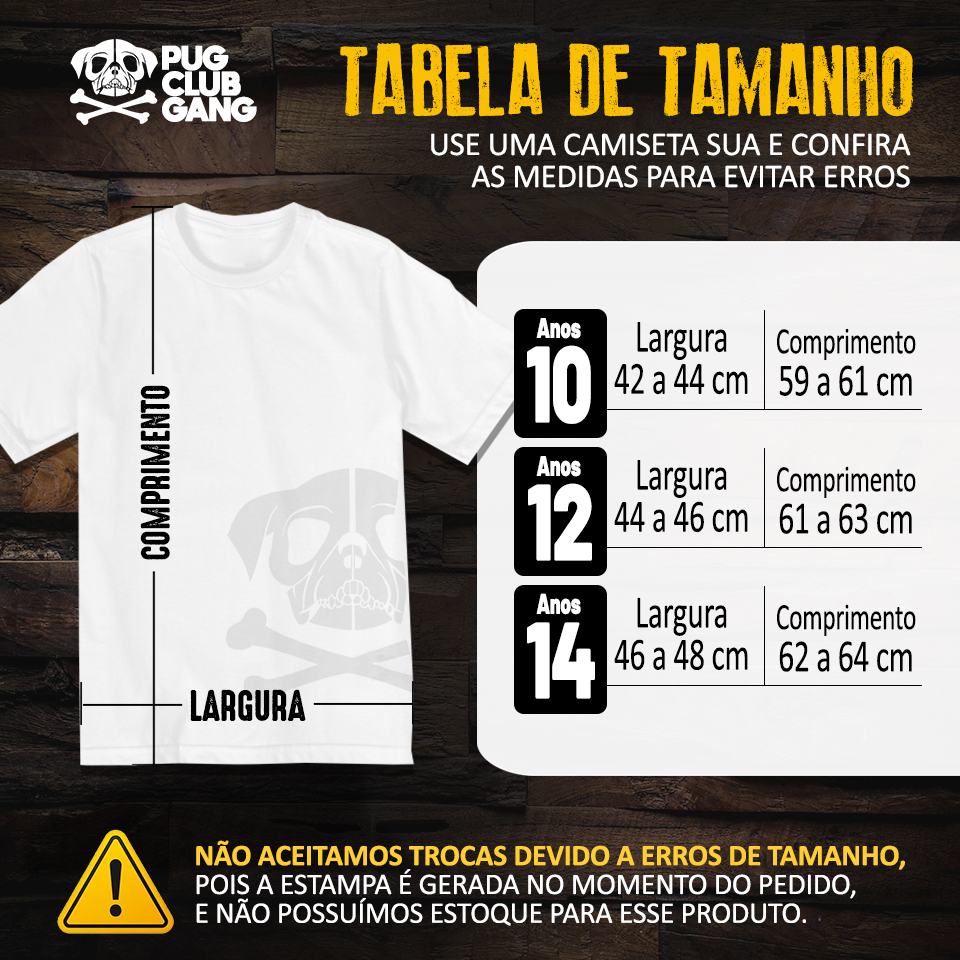 Cores do produto: Como cada tela de computador ou celular tem seu próprio jeito de mostrar cores, então a cor da sua camiseta e da estampa pode ser um pouco diferente do que você viu online.