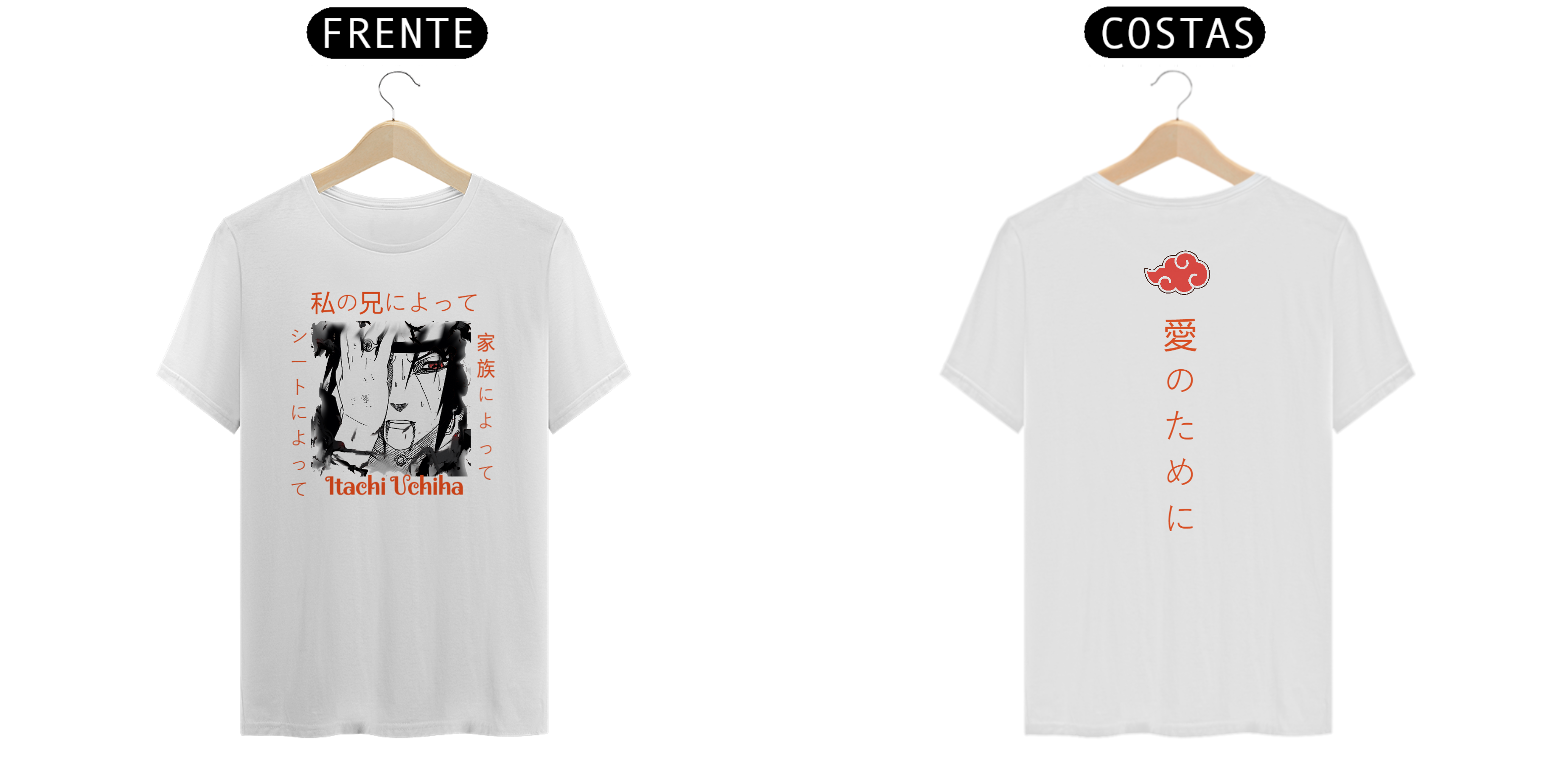 camiseta do Itachi Uchiha, que incluem as palavras  "pela folha", "pela família", "pelo meu irmão", "por amor".  escritas em japonês.