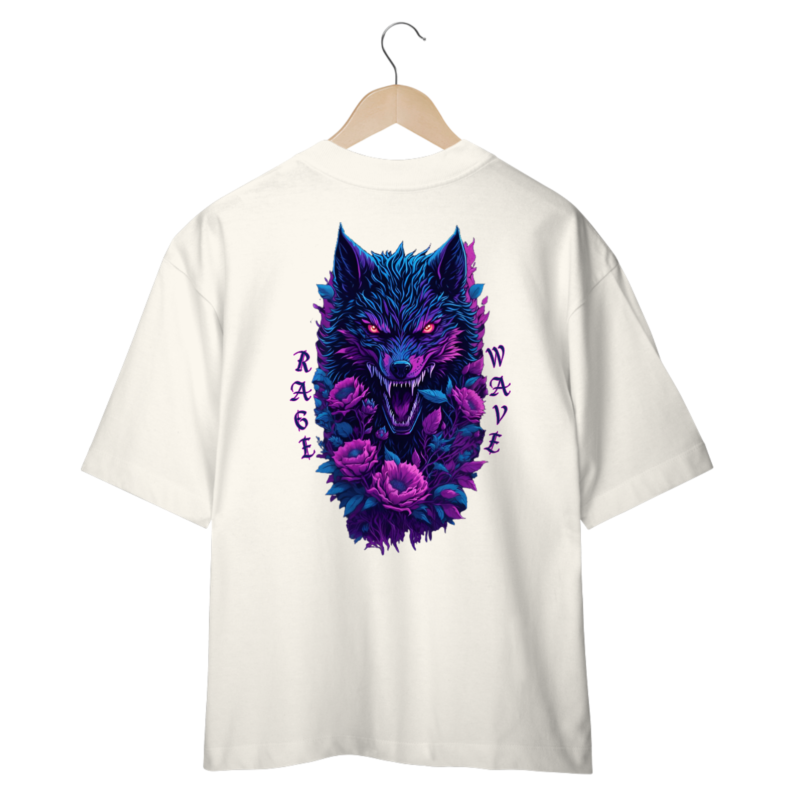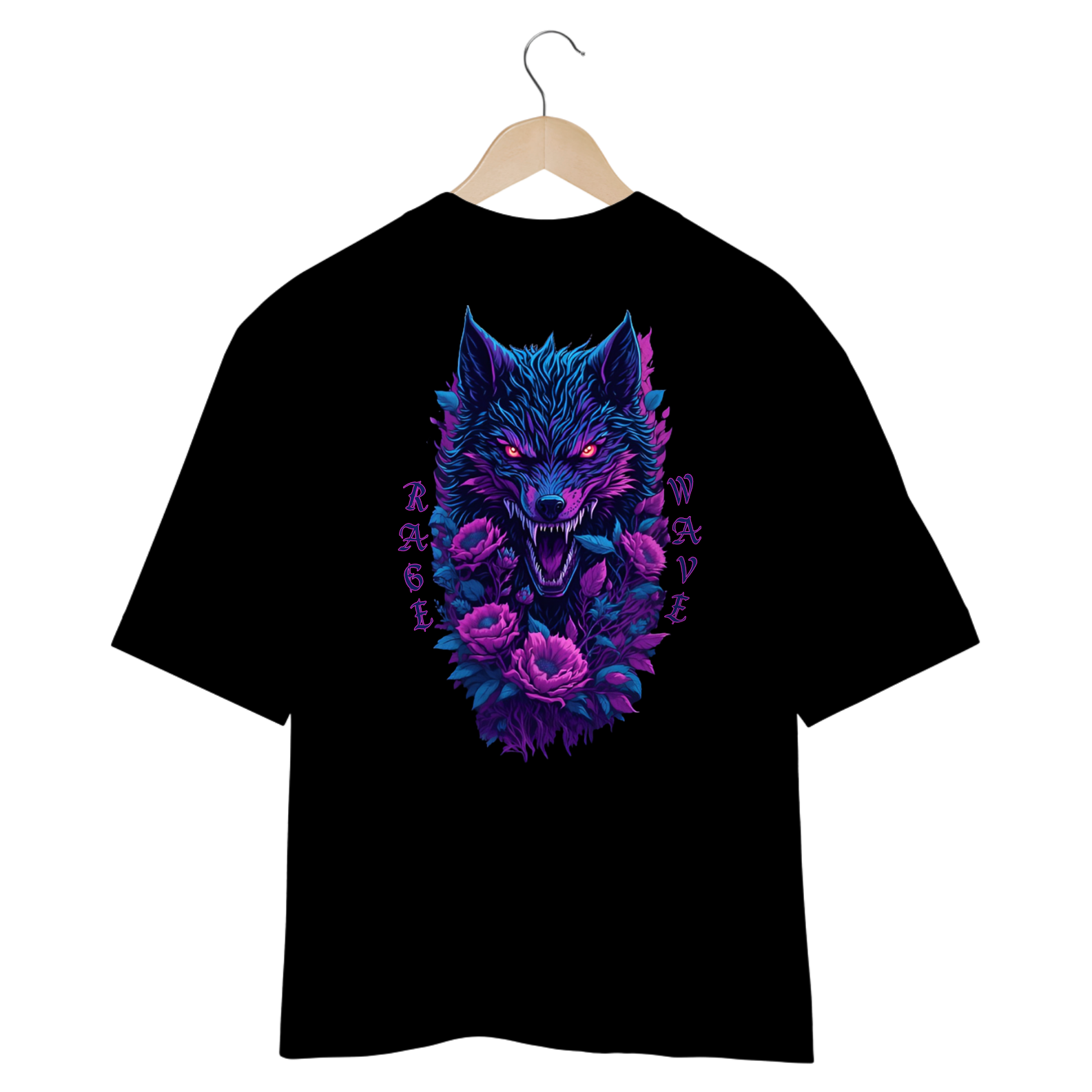 Liberte o espírito selvagem com a camiseta "Fenrir". RAGE WAVE – autenticidade e atitude garantidas. A imagem, em cores vibrantes de rosa neon e azul neon, captura a essência feroz de Fenrir, o lendário lobo da mitologia nórdica.
