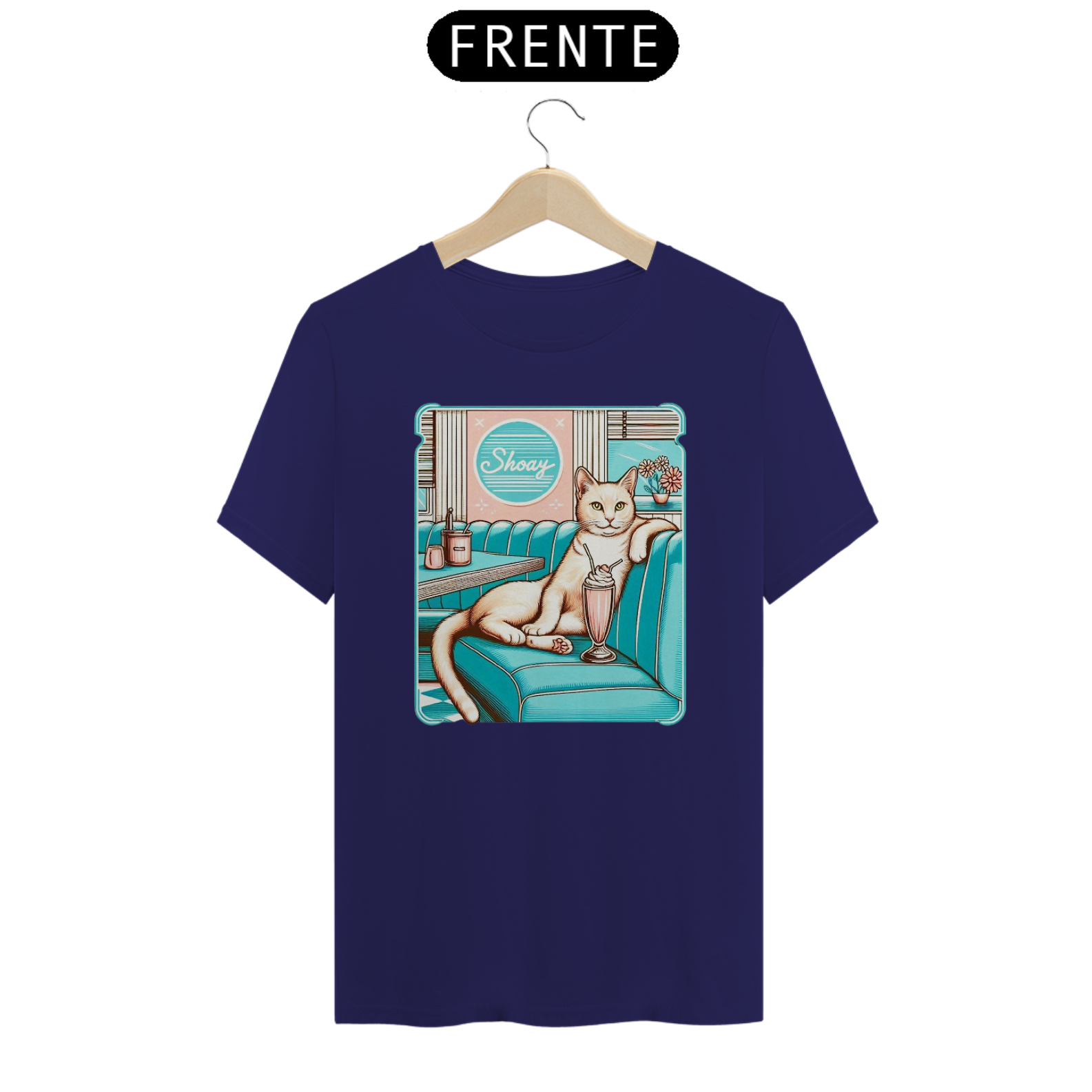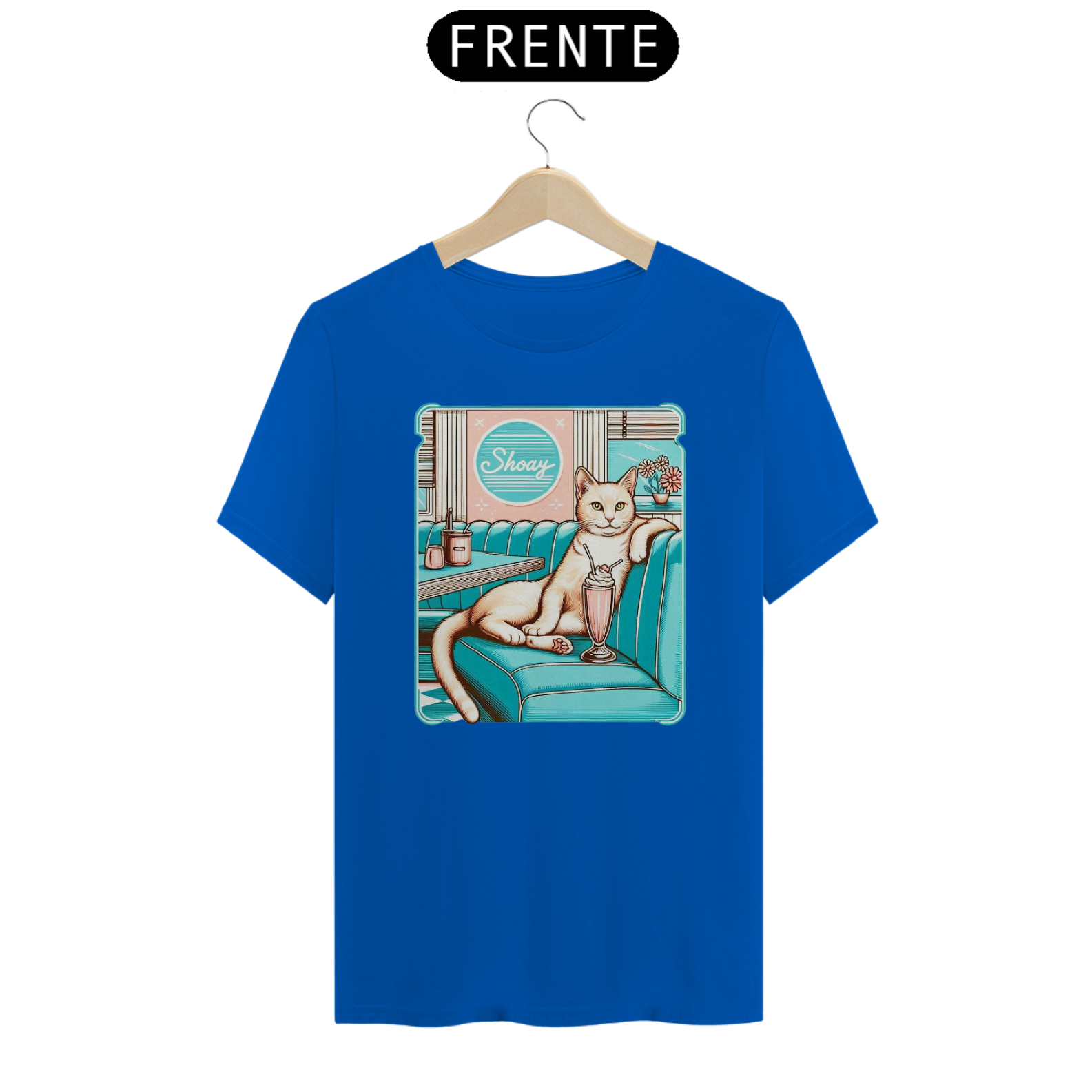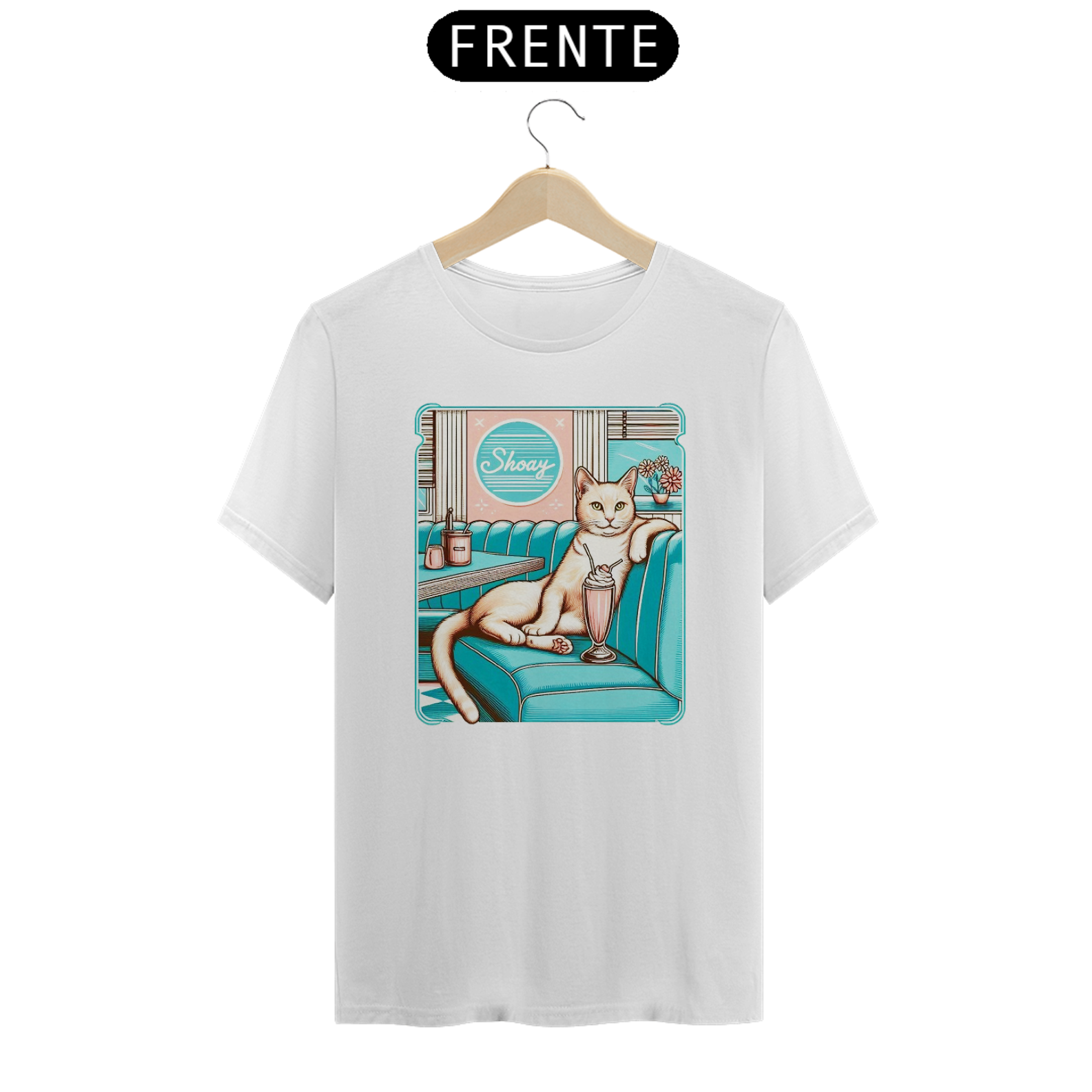 A imagem retrata um gato estilizado, com uma expressão confiante, sentado em um booth de uma lanchonete retrô, apreciando um milkshake. O ambiente é colorido e evoca nostalgia dos anos 50. O nome "Shoay" aparece em um letreiro acima do balcão, sugerindo o nome do gato ou da lanchonete.