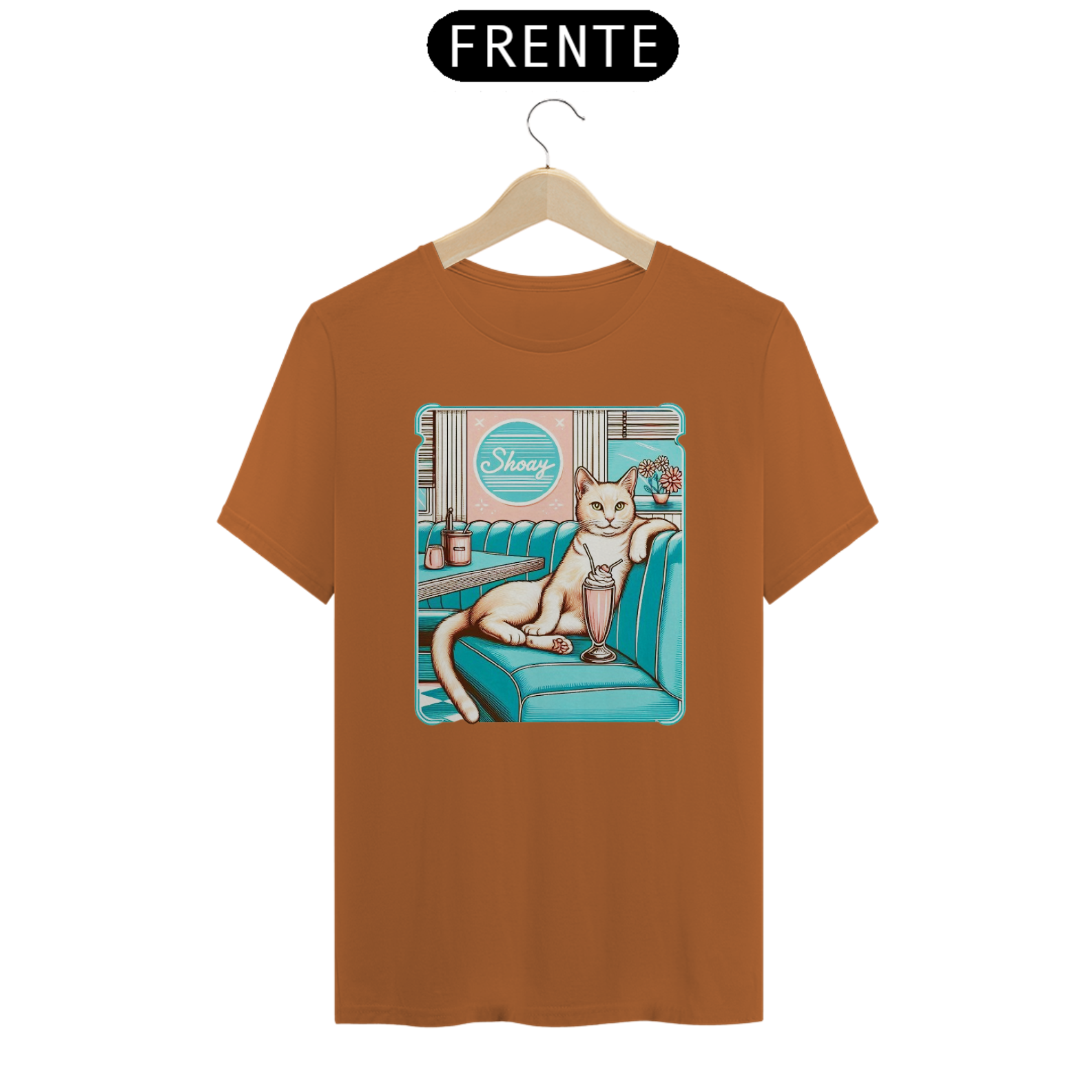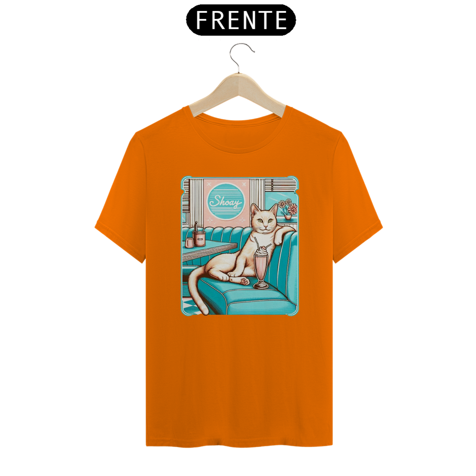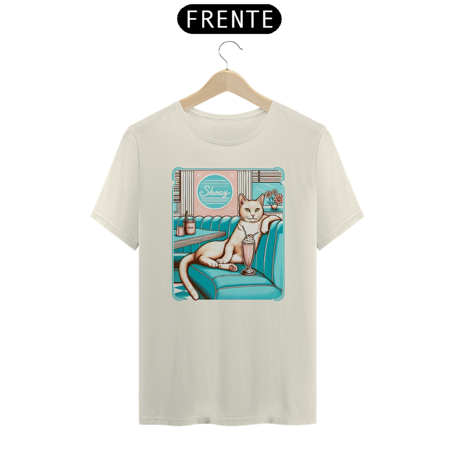 A imagem retrata um gato estilizado, com uma expressão confiante, sentado em um booth de uma lanchonete retrô, apreciando um milkshake. O ambiente é colorido e evoca nostalgia dos anos 50. O nome "Shoay" aparece em um letreiro acima do balcão, sugerindo o nome do gato ou da lanchonete.