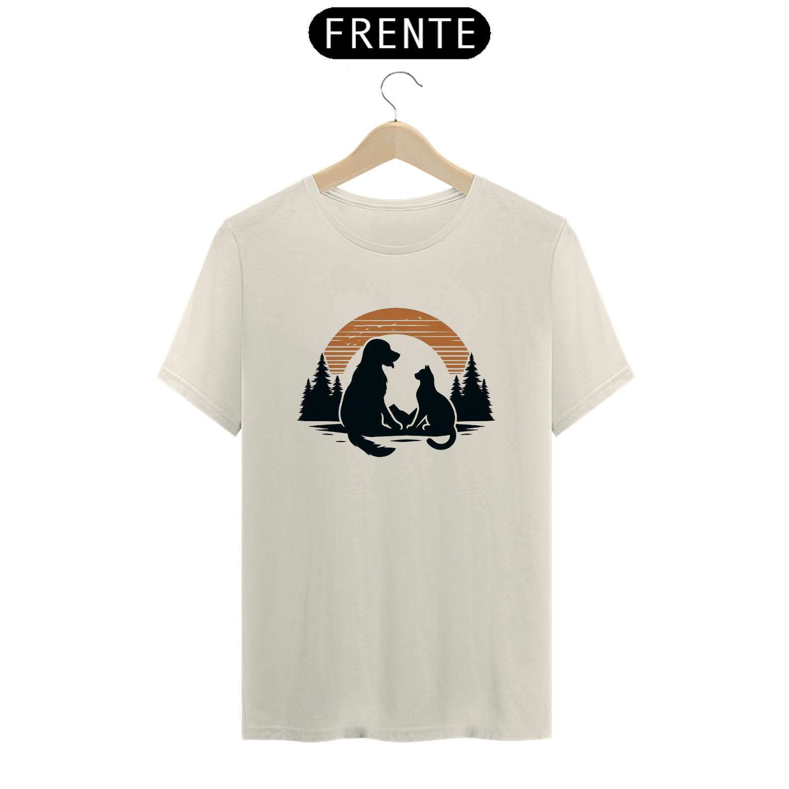 Esta estampa apresenta a silhueta de um cachorro e um gato sentados juntos, cercados por árvores de pinheiro, com um pôr do sol ao fundo. A imagem transmite uma sensação de amizade e harmonia entre os animais e a natureza, perfeita para amantes de pets e da vida ao ar livre.