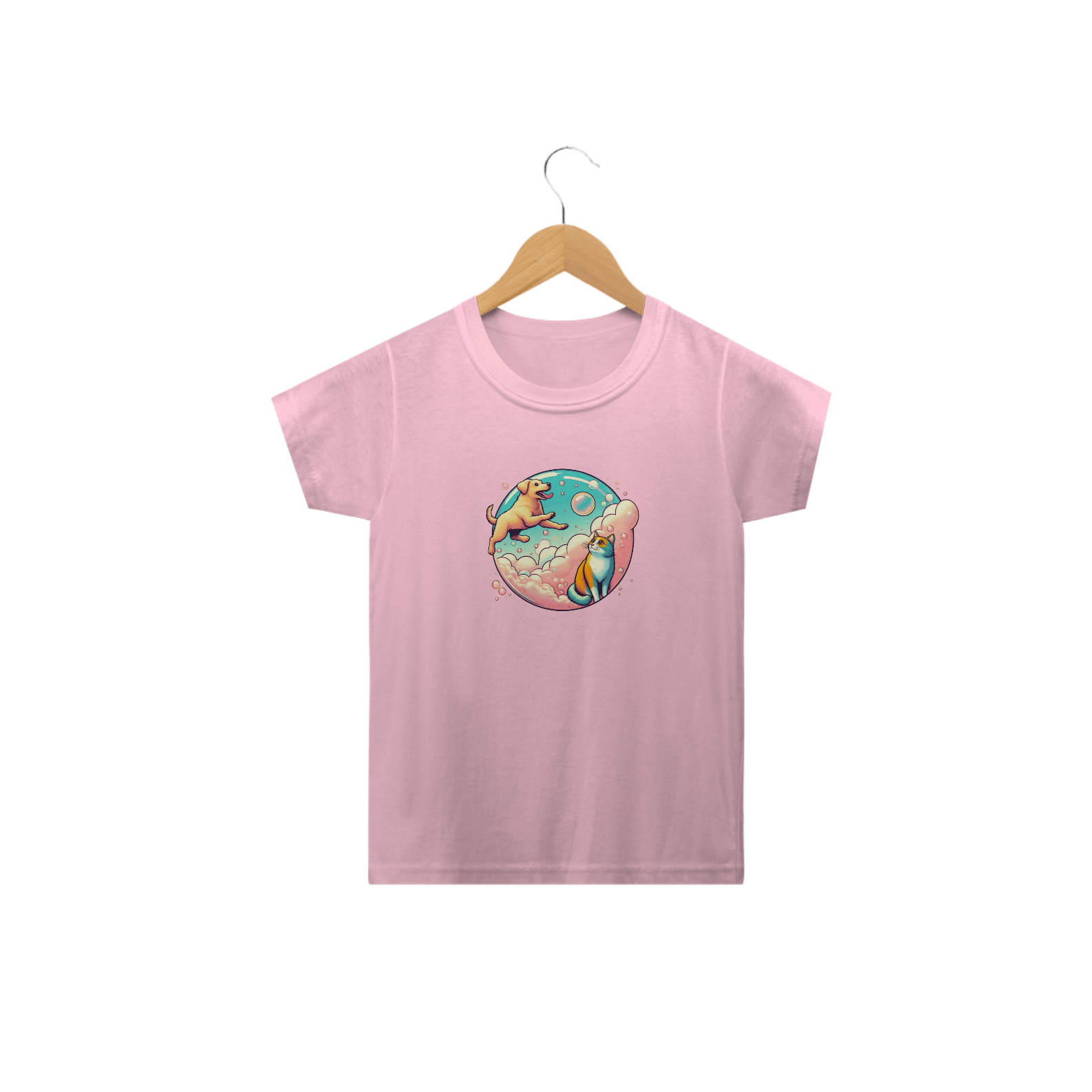 Esta estampa encantadora para camiseta infantil apresenta um cãozinho alegre e um gatinho curioso em um mundo mágico de bolhas. O cãozinho está saltando animadamente para pegar uma bolha, enquanto o gatinho observa com fascínio. O fundo é composto por nuvens fofas em tons de rosa e azul, criando uma atmosfera de sonho e diversão. Esta estampa é perfeita para crianças que amam animais e aventuras imaginativas.