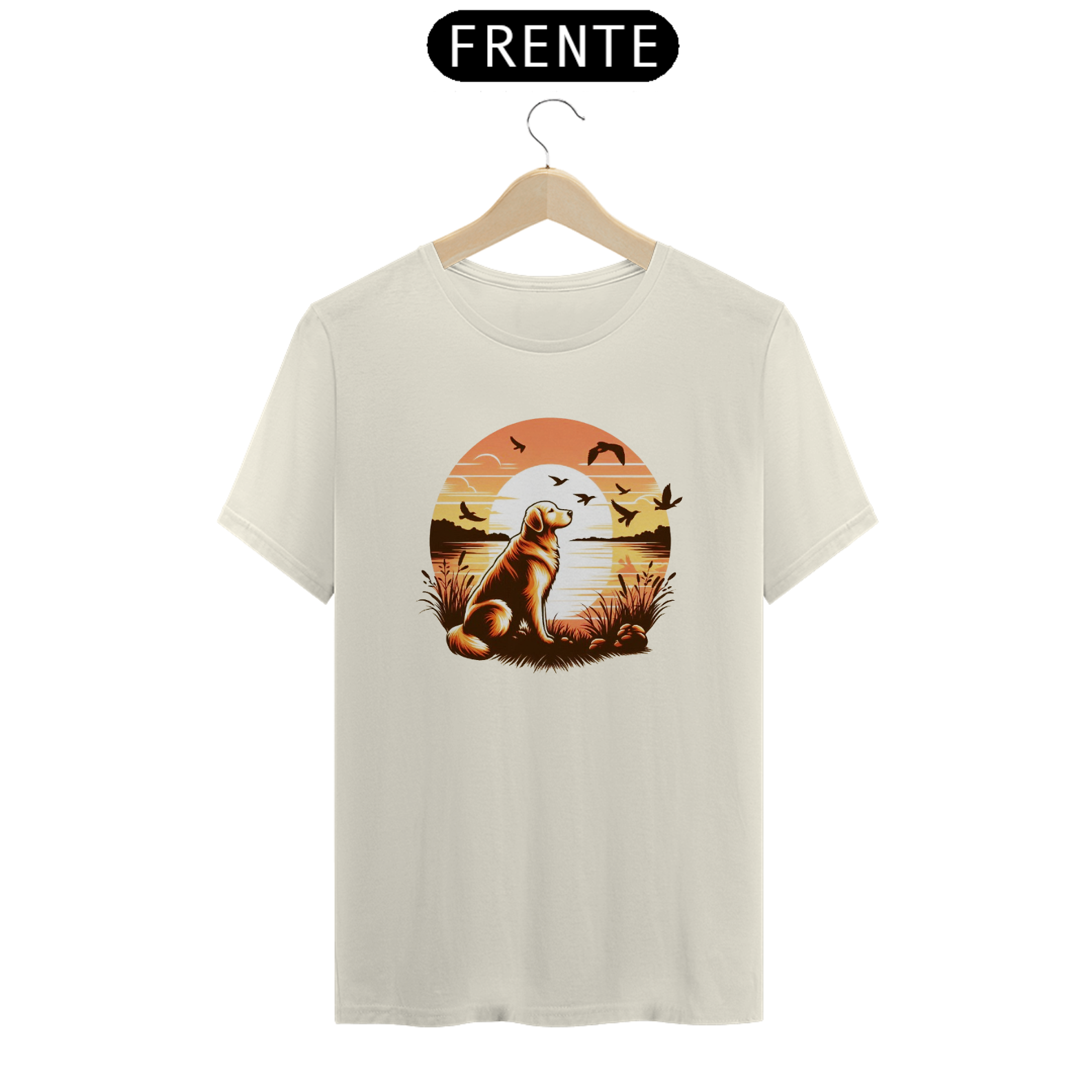 Esta estampa vibrante e serena apresenta um cachorro sentado à beira de um lago, contemplando o pôr do sol. O céu alaranjado e as aves voando ao redor criam uma atmosfera de paz e tranquilidade. A imagem captura um momento de reflexão e conexão com a natureza, perfeito para amantes de cães e da vida ao ar livre.