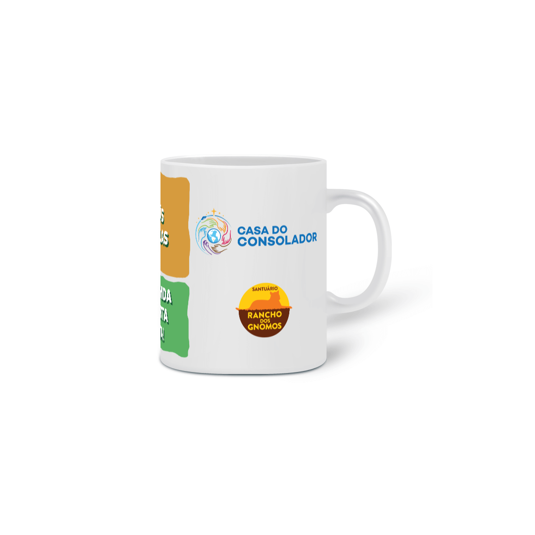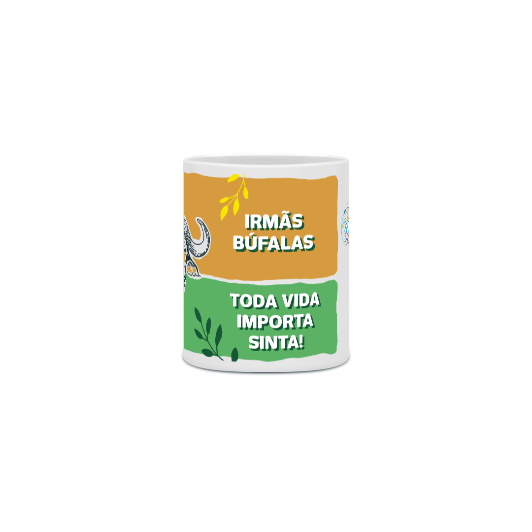 Caneca da Coleção Irmãs Búfalas - Nature - inclui uma linda ilustração de Búfala com detalhes de folhas, fundo amarelo e verde, a frase "Toda Vida Importa - Sinta!" e os logotipos da Casa do Consolador e do Santuário Rancho dos Gnomos.