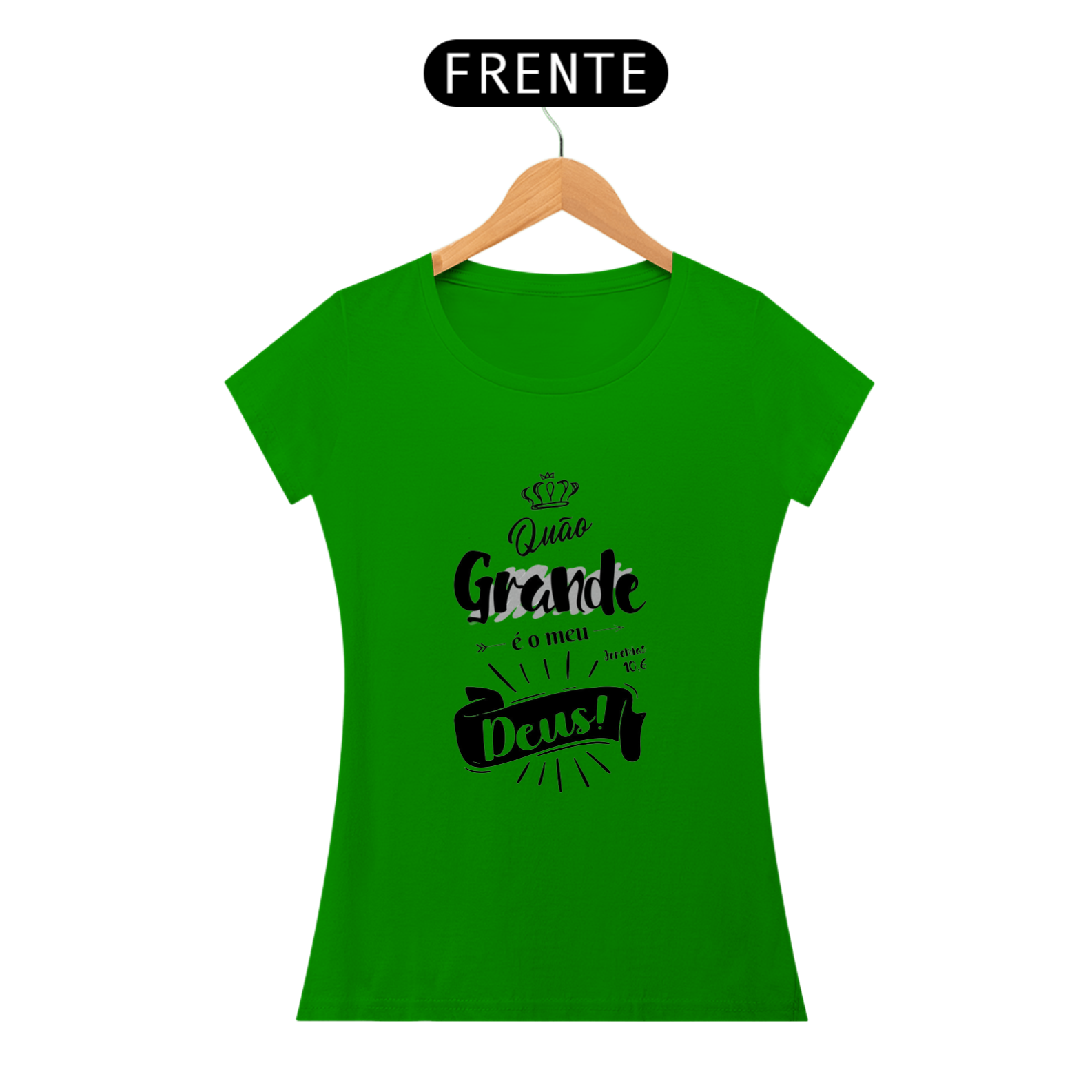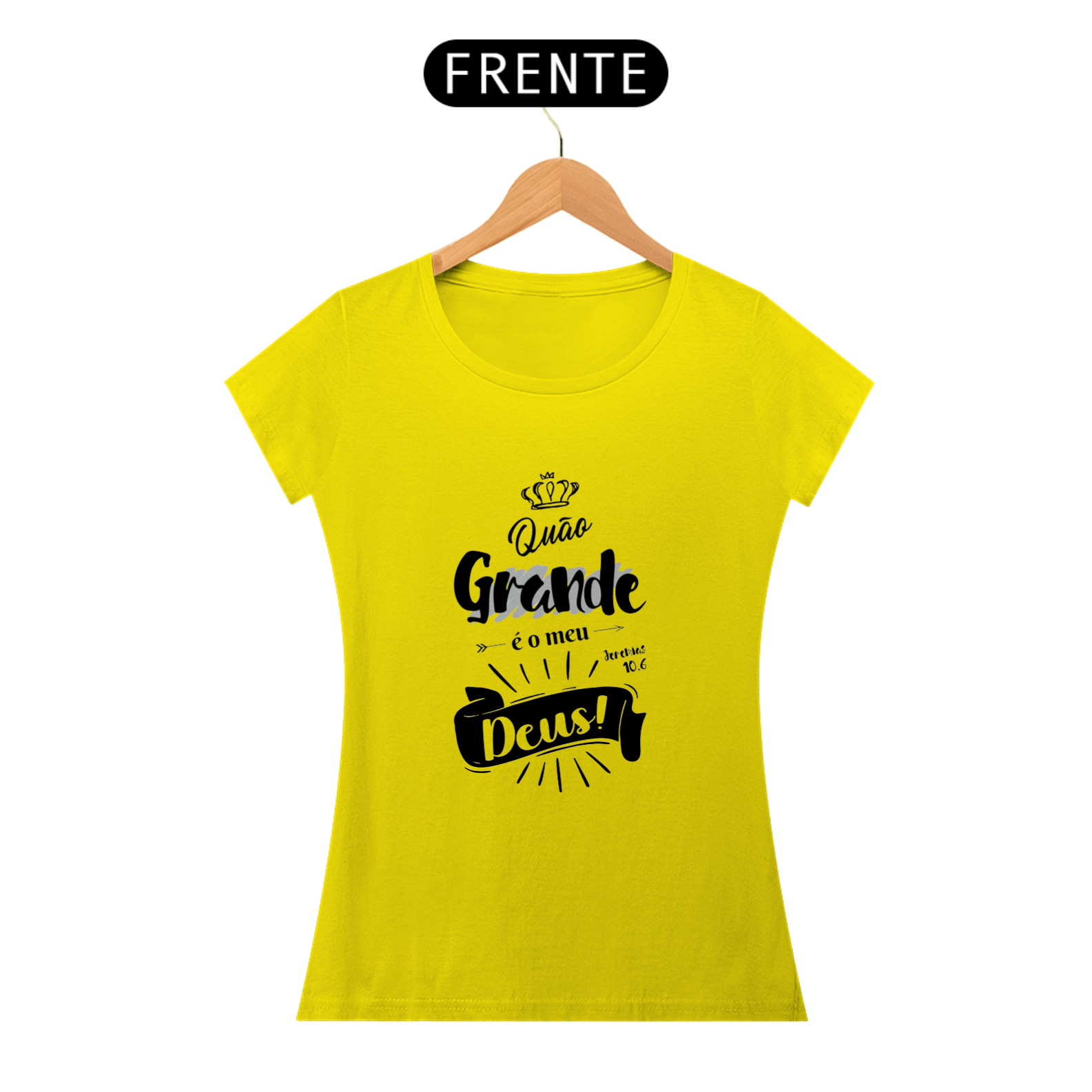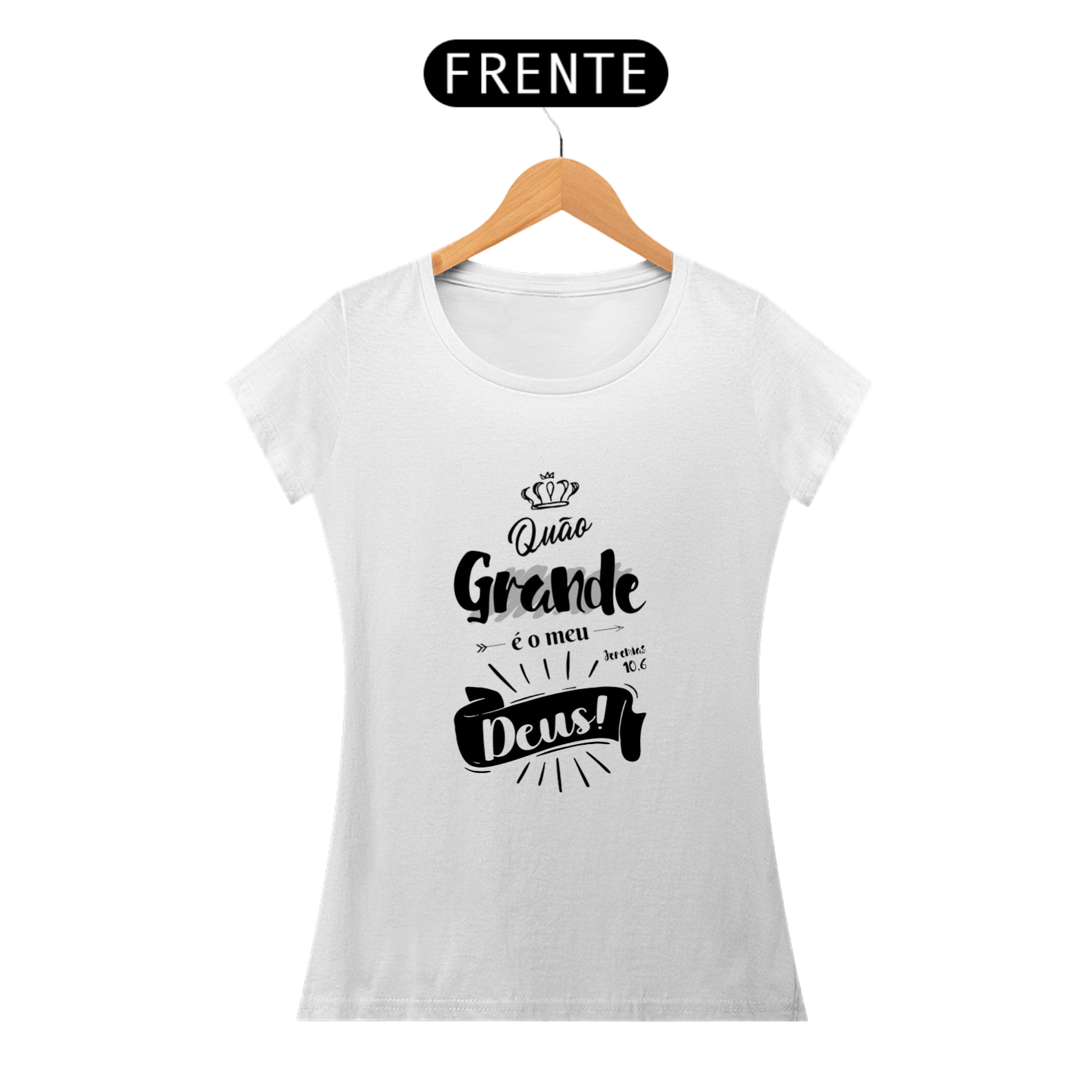 A blusa feminina com a frase "Quão Grande é o Meu Deus", inspirada em Jeremias 10:6. A estampa apresenta um design moderno e cheio de detalhes, com tipografia artística, uma coroa no topo e uma faixa destacando a palavra "Deus!", acompanhada de elementos gráficos como setas e raios de luz que enfatizam a grandeza divina.