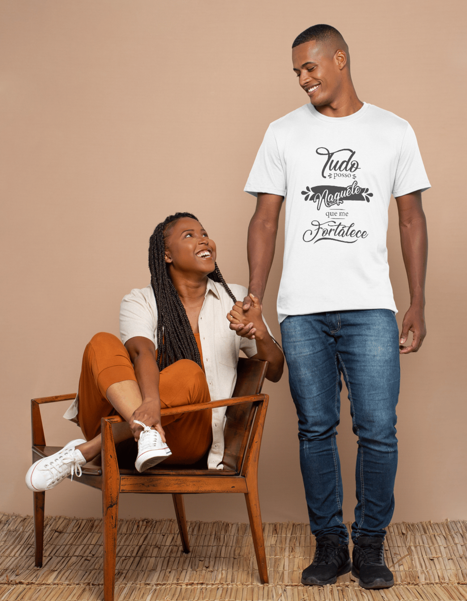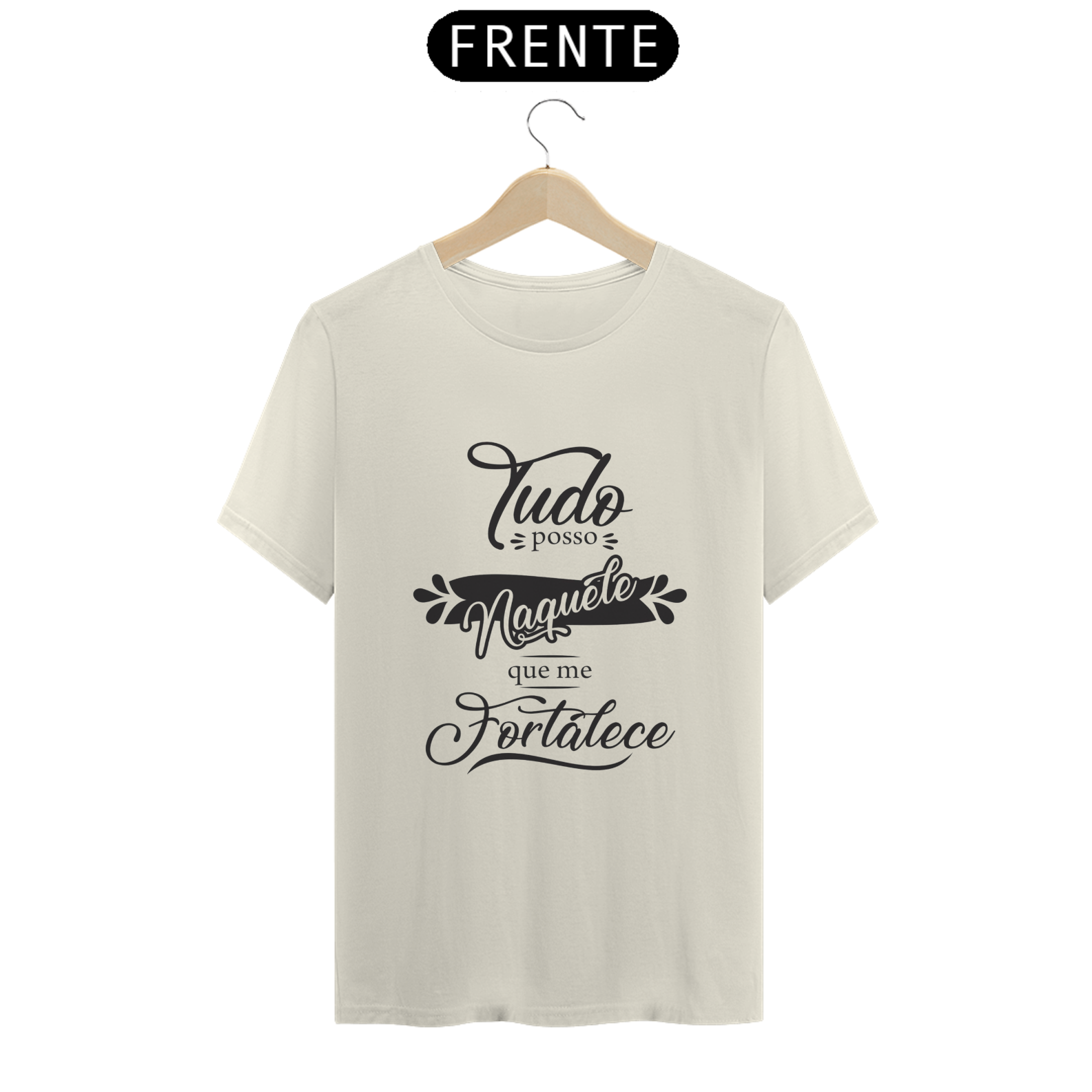 A camiseta masculina com a frase "Tudo Posso Naquele que me Fortalece", baseada em Filipenses 4:13. O design apresenta uma composição tipográfica elegante e harmônica, com elementos decorativos que destacam a mensagem de fé e força interior.