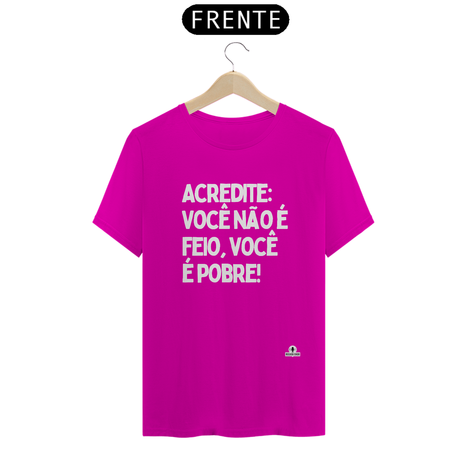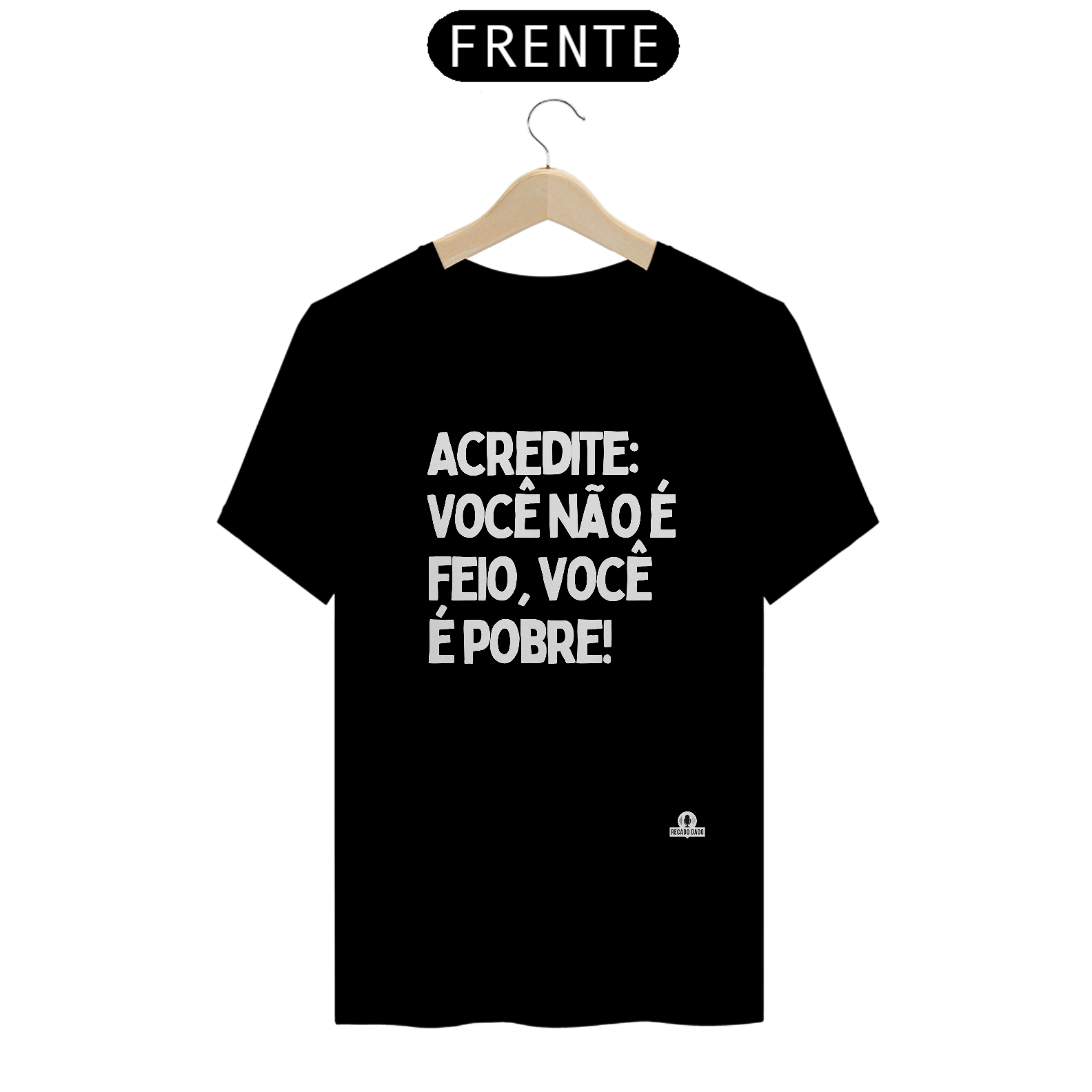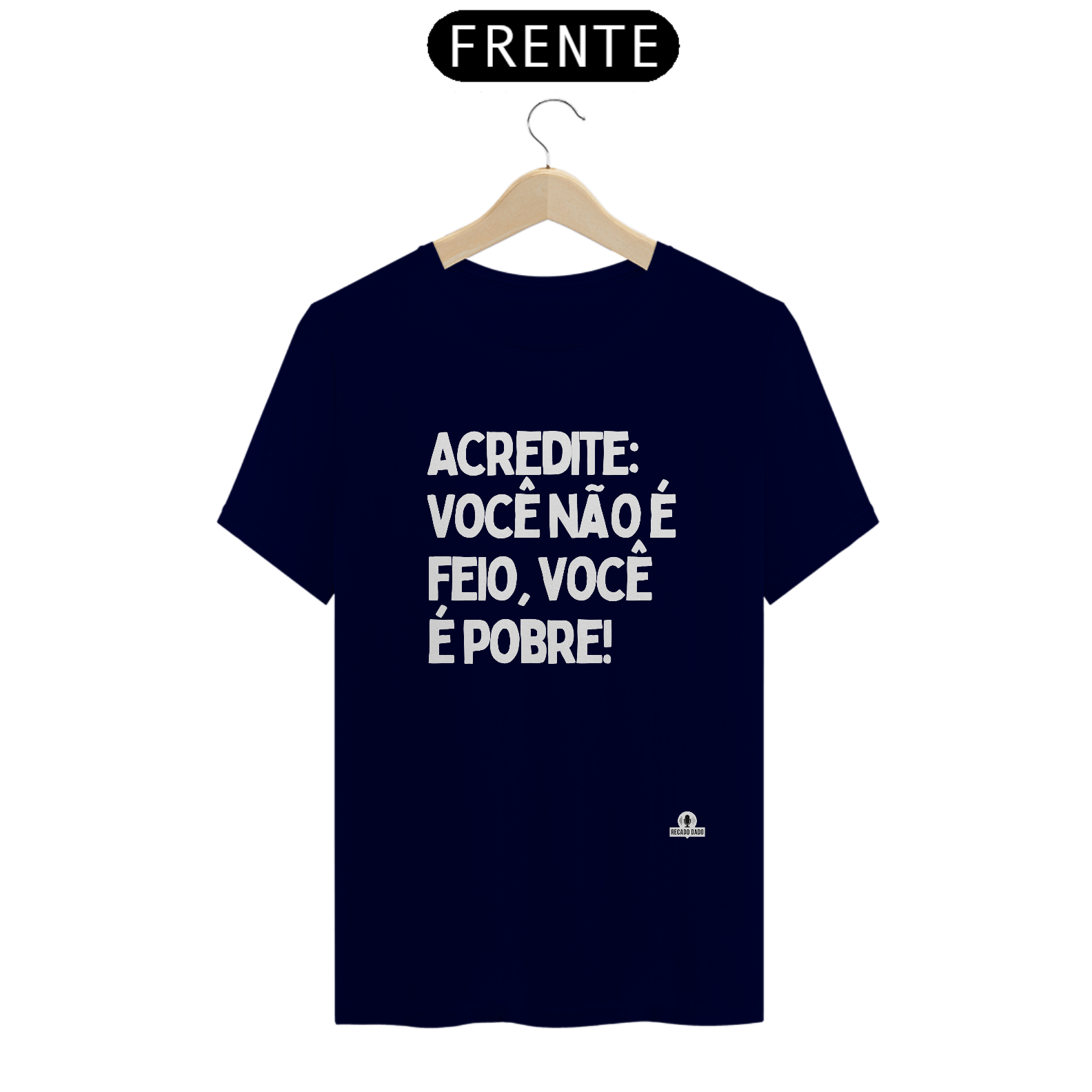 Divirta-se com estilo e personalidade com a nossa camiseta com humor "Acredite: você não é feio, você é pobre!". Feita com algodão macio e confortável, esta camiseta é perfeita para quem gosta de peças únicas e divertidas. Com frases únicas e engraçadas, nossas camisetas engraçadas masculinas vão garantir muitas risadas e bons momentos. Além disso, também é uma ótima opção de camisetas engraçadas para casal, para surpreender o seu par com um presente criativo e descontraído. Se você está em busca de camisetas engraçadas femininas, esta peça é perfeita para adicionar um toque de humor ao seu guarda-roupa. As frases para camisetas engraçadas são sempre uma escolha divertida e descolada, e esta camiseta não decepciona. Então, se você procura por camisetas divertidas e cheias de personalidade, não deixe de garantir a sua! "Recado Dado: camisetas criativas que falam por você!"