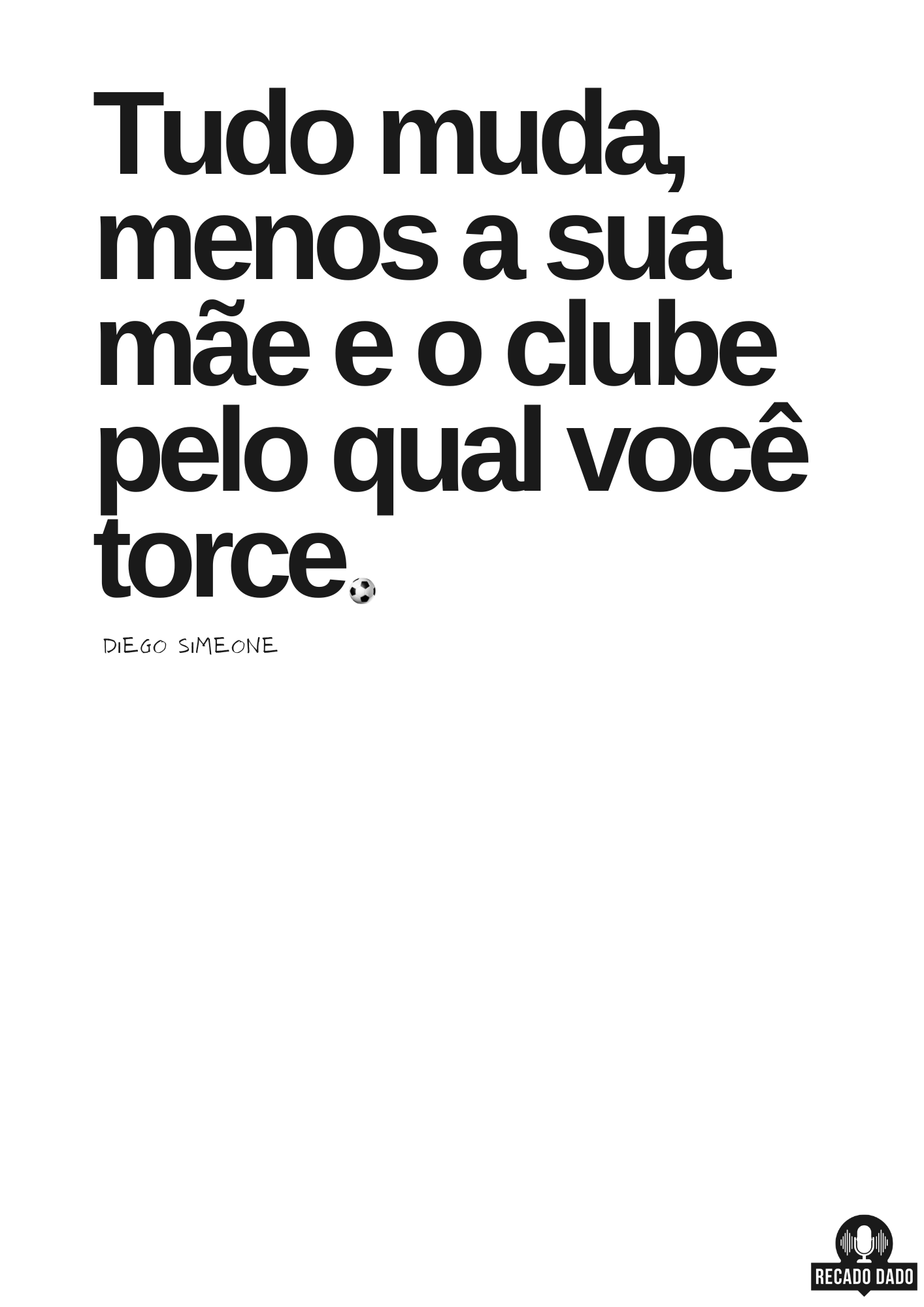 Mostre todo o seu amor pelo seu time de coração com esta camiseta com frase de futebol exclusiva! Com a frase 'Tudo muda, menos a sua mãe e o time pelo qual você torce!', você vai arrasar nos estádios e nas ruas. Feita com tecido de alta qualidade, esta camiseta é perfeita para os verdadeiros torcedores que não abrem mão de expressar sua paixão pelo futebol. Garanta já a sua CAMISETA FRASES FUTEBOL e mostre para todos o seu orgulho pelo seu time com muito estilo!  "Recado Dado: camisetas criativas que falam por você!"