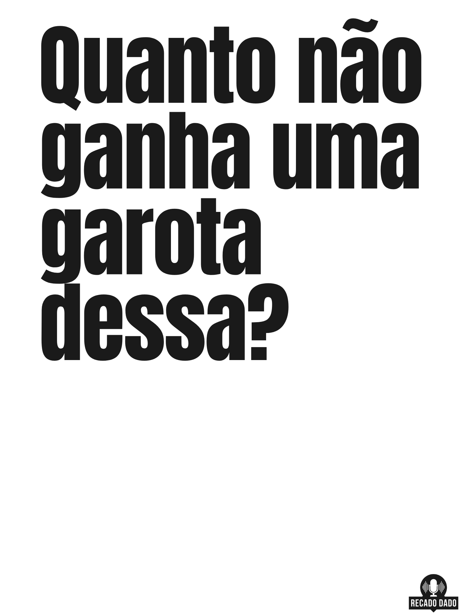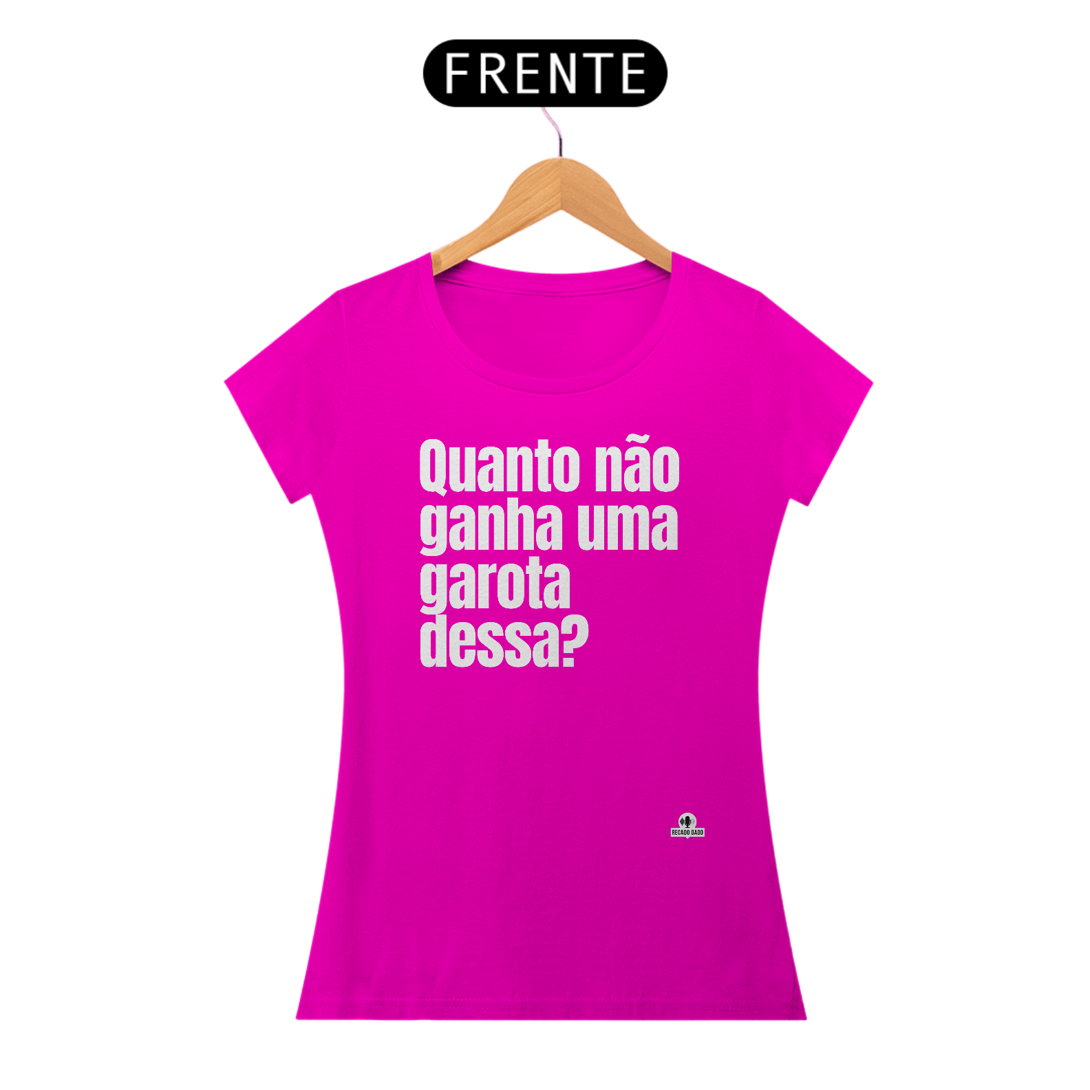 Venha conferir a nossa irresistível camiseta com a frase de humor "Quanto não ganha uma garota dessa?". Perfeita para quem adora camisetas com frases engraçadas e busca uma forma divertida de expressar o seu bom humor. Esta camiseta é ideal para quem adora rir e alegrar o dia de todos ao redor. Além disso, é uma ótima opção para quem procura camisetas divertidas femininas ou camisetas engraçadas para casal. Não perca a oportunidade de adquirir esta peça única e cheia de personalidade na Recado Dado! "Recado Dado: camisetas criativas que falam por você!"