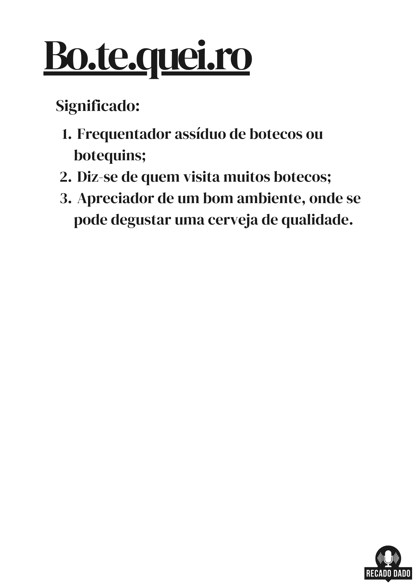 Se você é um verdadeiro amante de cerveja e da cultura boêmia, esta camiseta é perfeita para você! Com o significado da palavra "botequeiro" pelo dicionário dos boêmios estampado, esta camiseta é a escolha ideal para os amantes da bebida mais apreciada do mundo. Feita com material de alta qualidade, esta camiseta masculina cervejeira é a reserva perfeita para os momentos de descontração com os amigos. Adquira já a sua camiseta de cerveja e mostre para todos o seu amor pela bebida dos deuses. Seja um verdadeiro botequeiro com estilo com esta camiseta masculina beer! "Recado Dado: camisetas criativas que falam por você!"