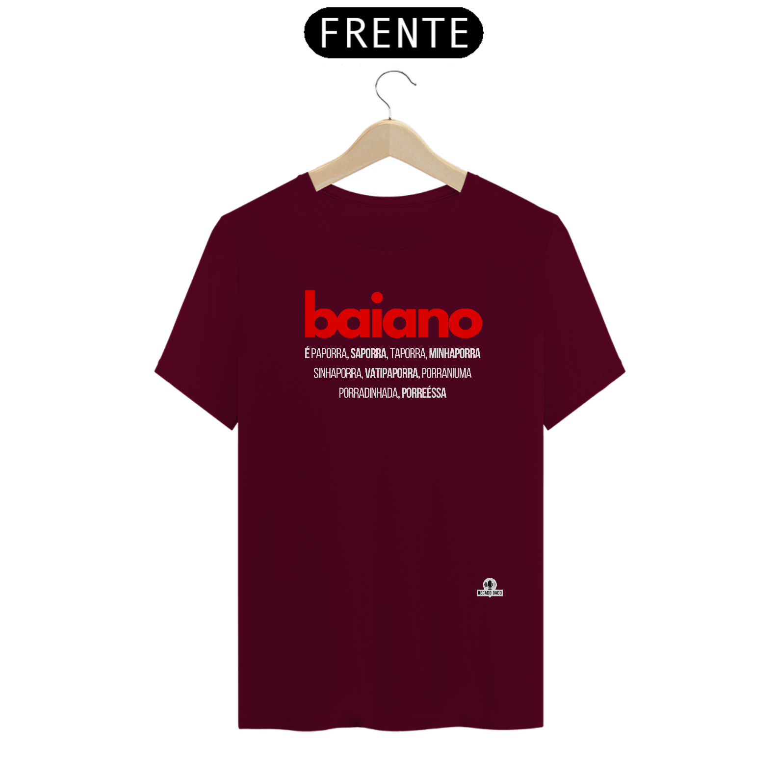 A camiseta traz estampado o nome "baiano", em uma fonte descontraída, que representa toda a alegria e energia contagiante desse povo. Mas o grande destaque fica por conta das gírias típicas da Bahia, que estão presentes em letras garrafais ao redor do nome.