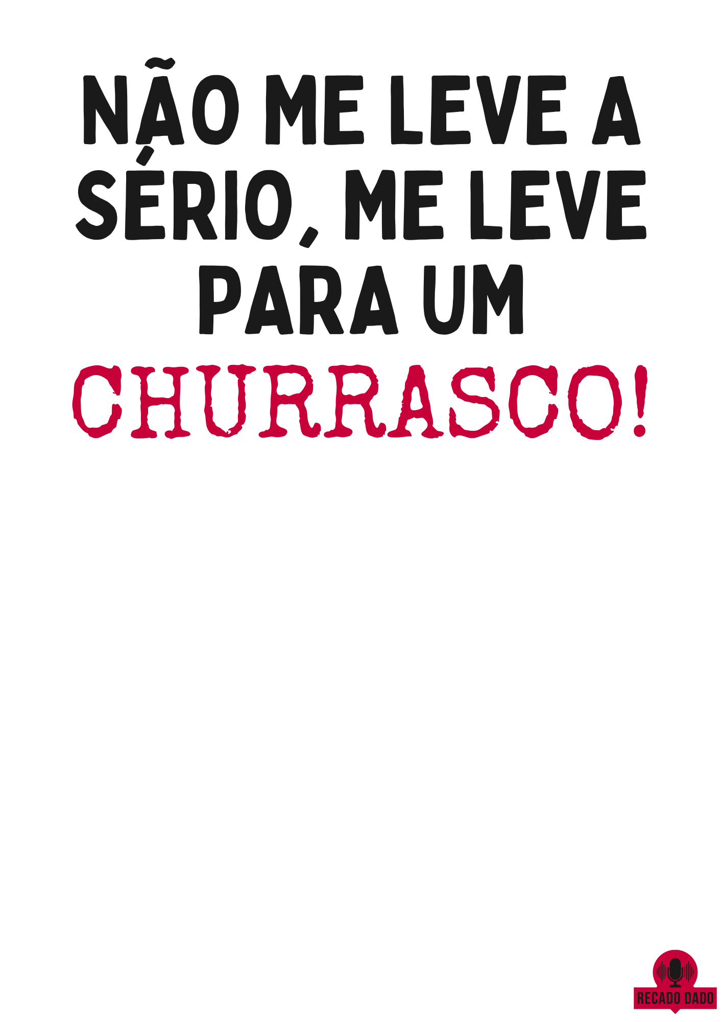 A camiseta de Churrasco com a frase "Não me leve a sério, me leve para um churrasco!" é perfeita para os amantes de humor descontraído e deliciosas confraternizações. Com uma mensagem engraçada e irreverente, essa camiseta é garantia de boas risadas e um visual descontraído em qualquer ocasião relacionada a churrascos.