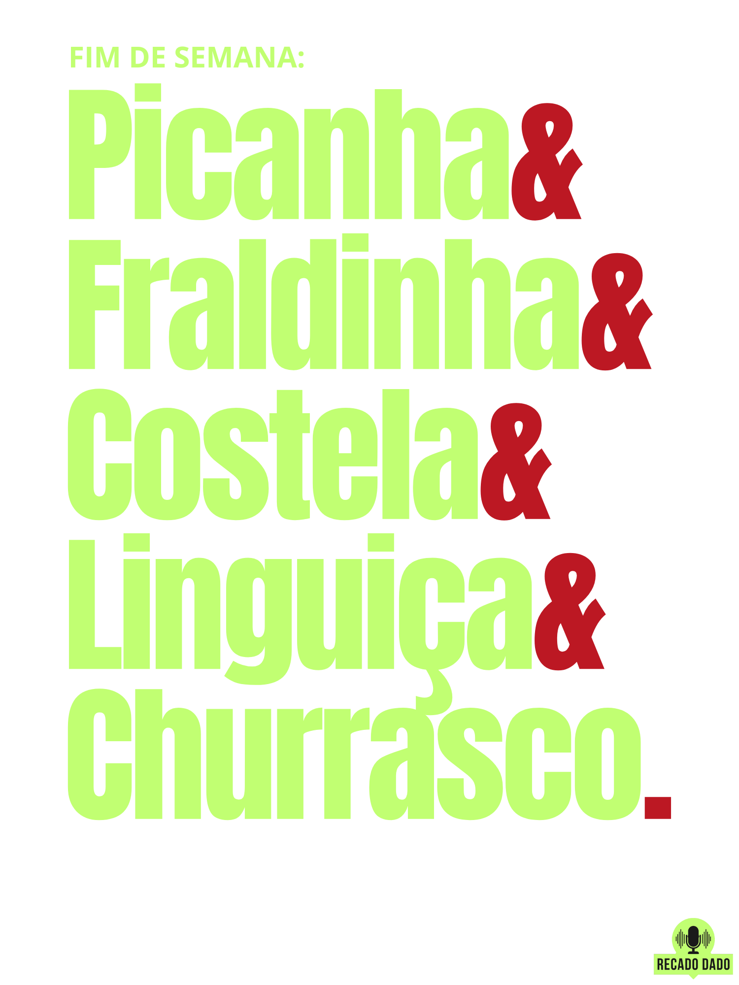 A camiseta frase "Fim de semana: picanha, fraldinha, costela, linguiça e churrasco" é perfeita para os amantes de churrasco! Feita com material de alta qualidade, ela é confortável e durável, ideal para usar durante os preparativos e celebrações dos seus churrascos favoritos. Com seu design exclusivo, essa camiseta tem tudo para se tornar a peça favorita do churrasqueiro de plantão. Seja você um mestre das brasas ou alguém que simplesmente adora comer um bom churrasco, essa camiseta vai mostrar ao mundo a sua paixão e estilo únicos. Garanta a sua agora mesmo e torne seus fins de semana ainda mais saborosos e estilosos com a camiseta frase "Fim de semana: picanha, fraldinha, costela, linguiça e churrasco".