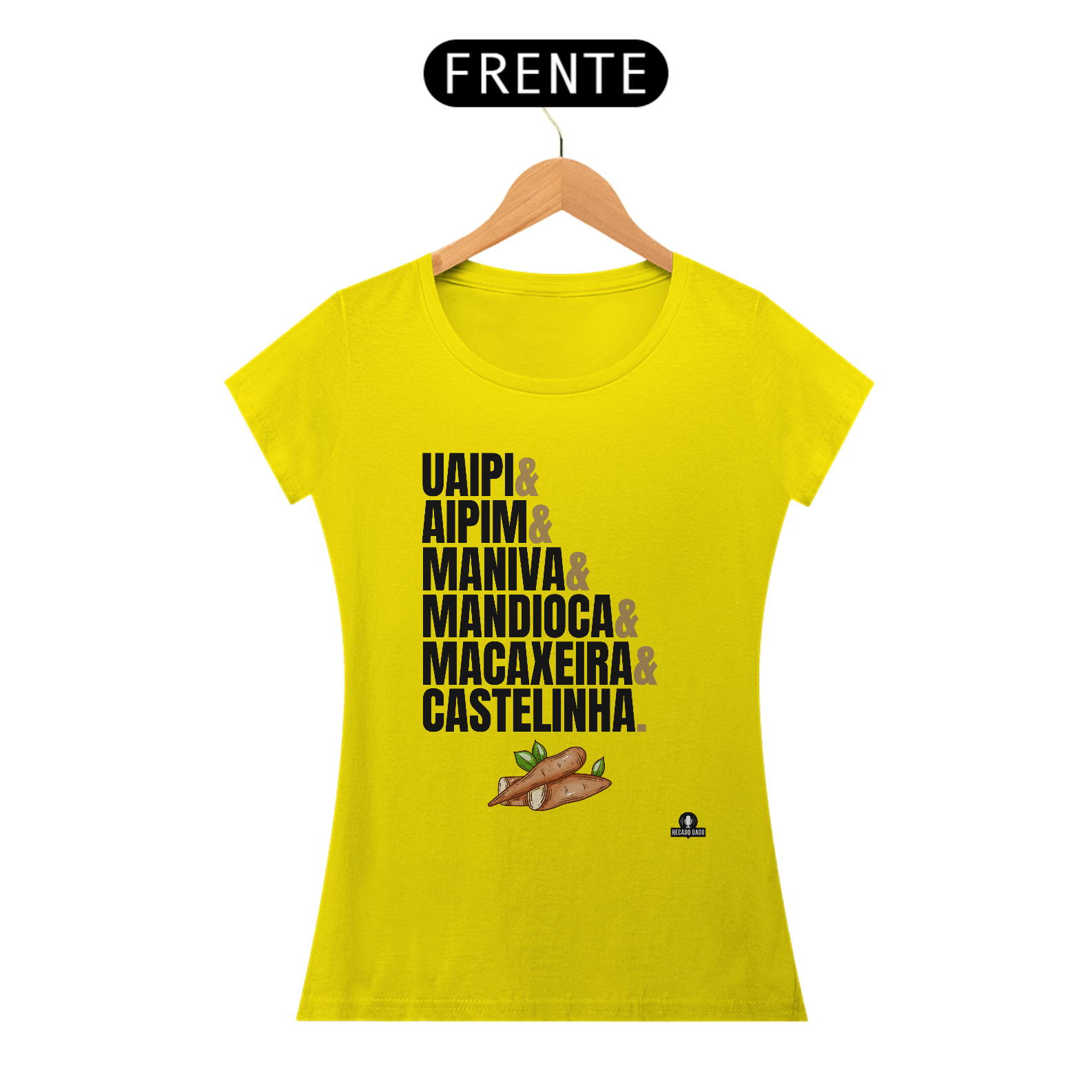 Com um design exclusivo, a camiseta possui estampado diversos apelidos da mandioca, como macaxeira, aipim, uaipi, maniva e castelinha. Além disso, ela é perfeita para chefs de cozinha e pessoas que adoram preparar deliciosos pratos com mandioca.