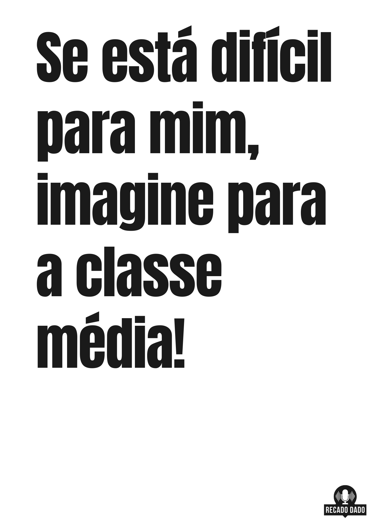 Apresentando a camiseta de humor negro "Se está difícil pra mim, imagine pra classe média!" da Recado Dado. Esta peça exclusiva é perfeita para aqueles que buscam camisetas com estampas engraçadas e um toque de sarcasmo inteligente. Com um design criativo e contemporâneo, essa camiseta irá com certeza levantar o astral de qualquer um!