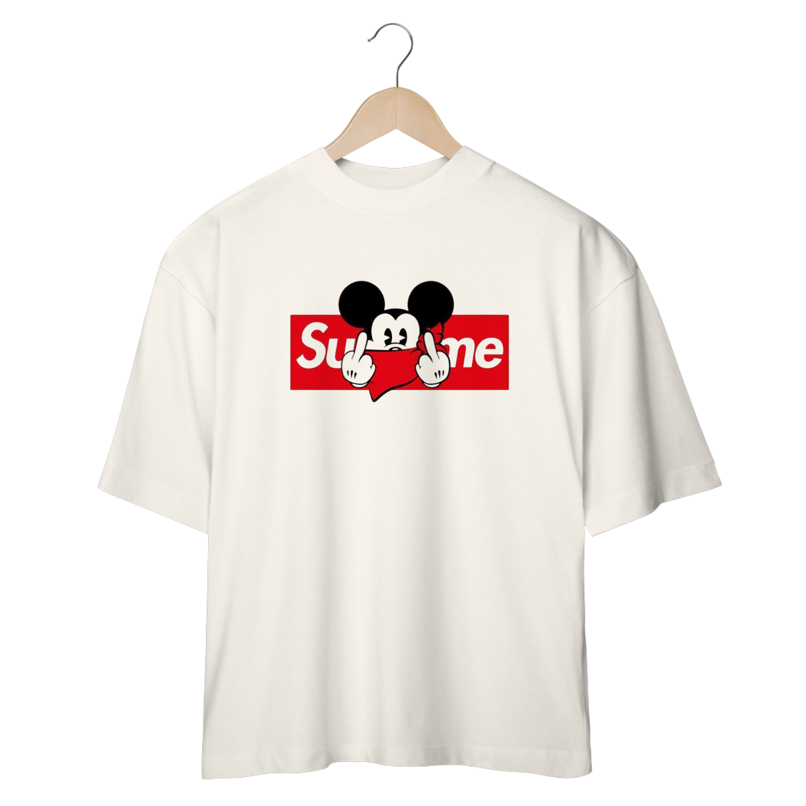 Uma camisa oversized com temática do Mickey Mouse e o logo da Supreme seria uma combinação perfeita entre o clássico e o contemporâneo.