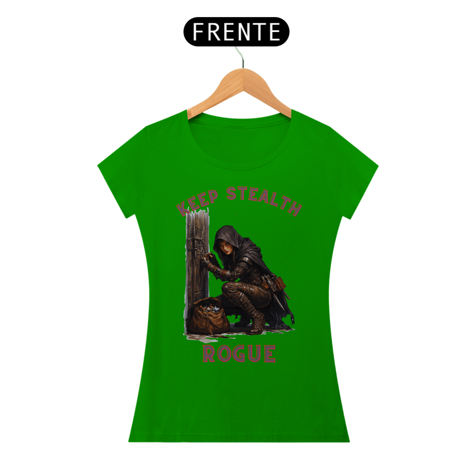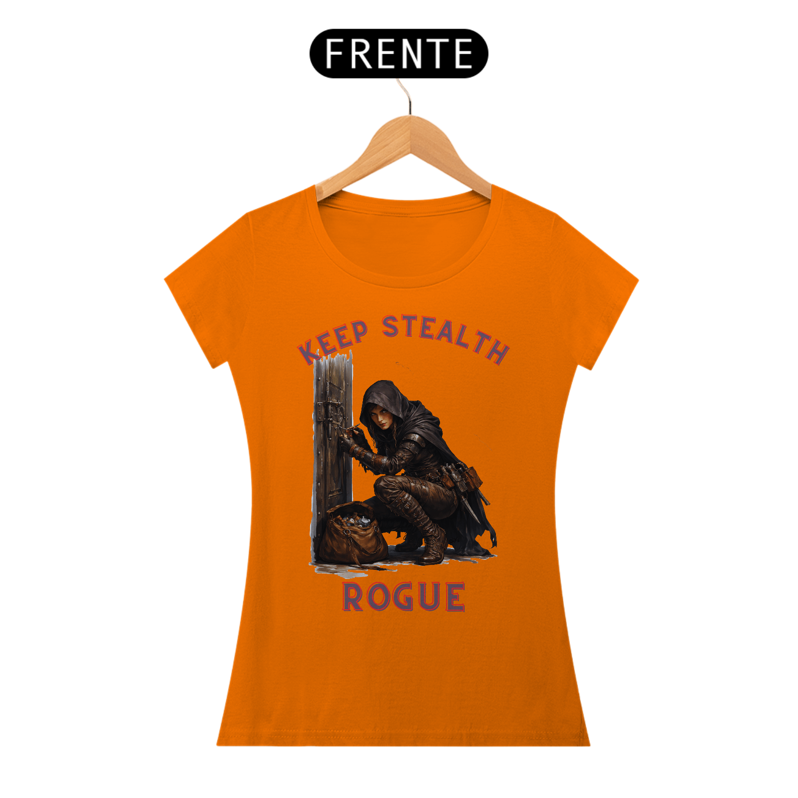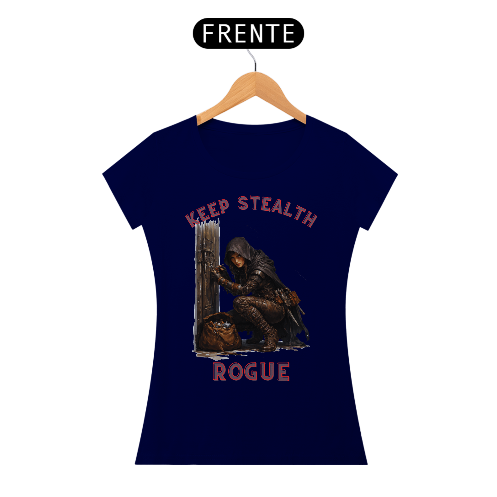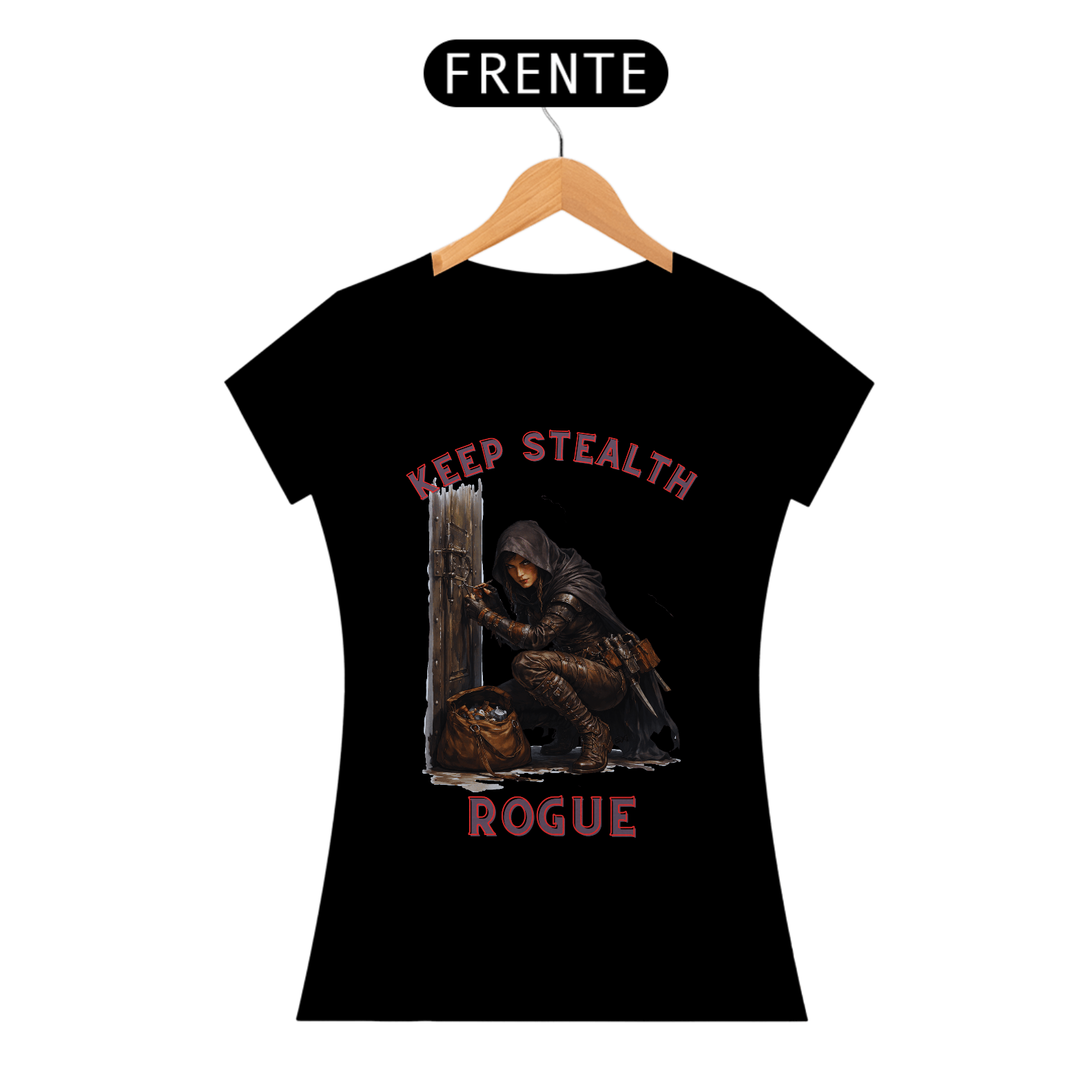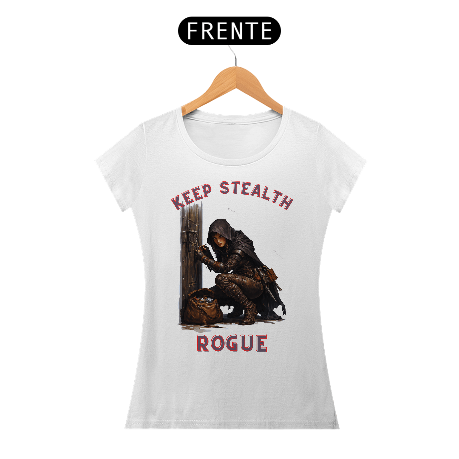 Esta camisa retrata uma rogue ladra em pleno ato de arrombar uma porta, ferramentas em mãos e concentração absoluta no olhar. A estampa captura o instante tenso antes da fechadura ceder, transmitindo habilidade, audácia e precisão. Uma peça para quem vive pela adrenalina, pela astúcia e pelo desafio de abrir qualquer caminho.