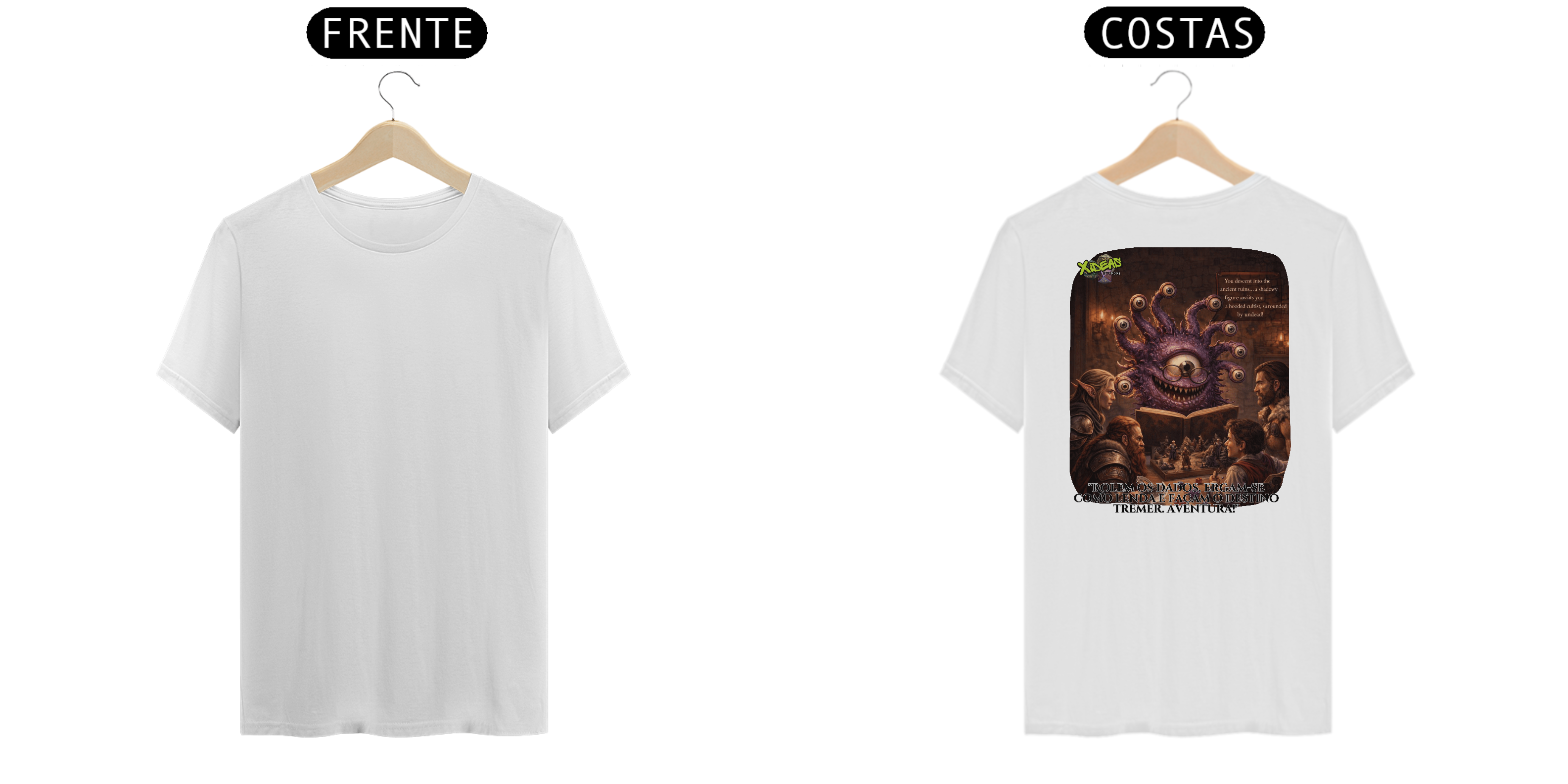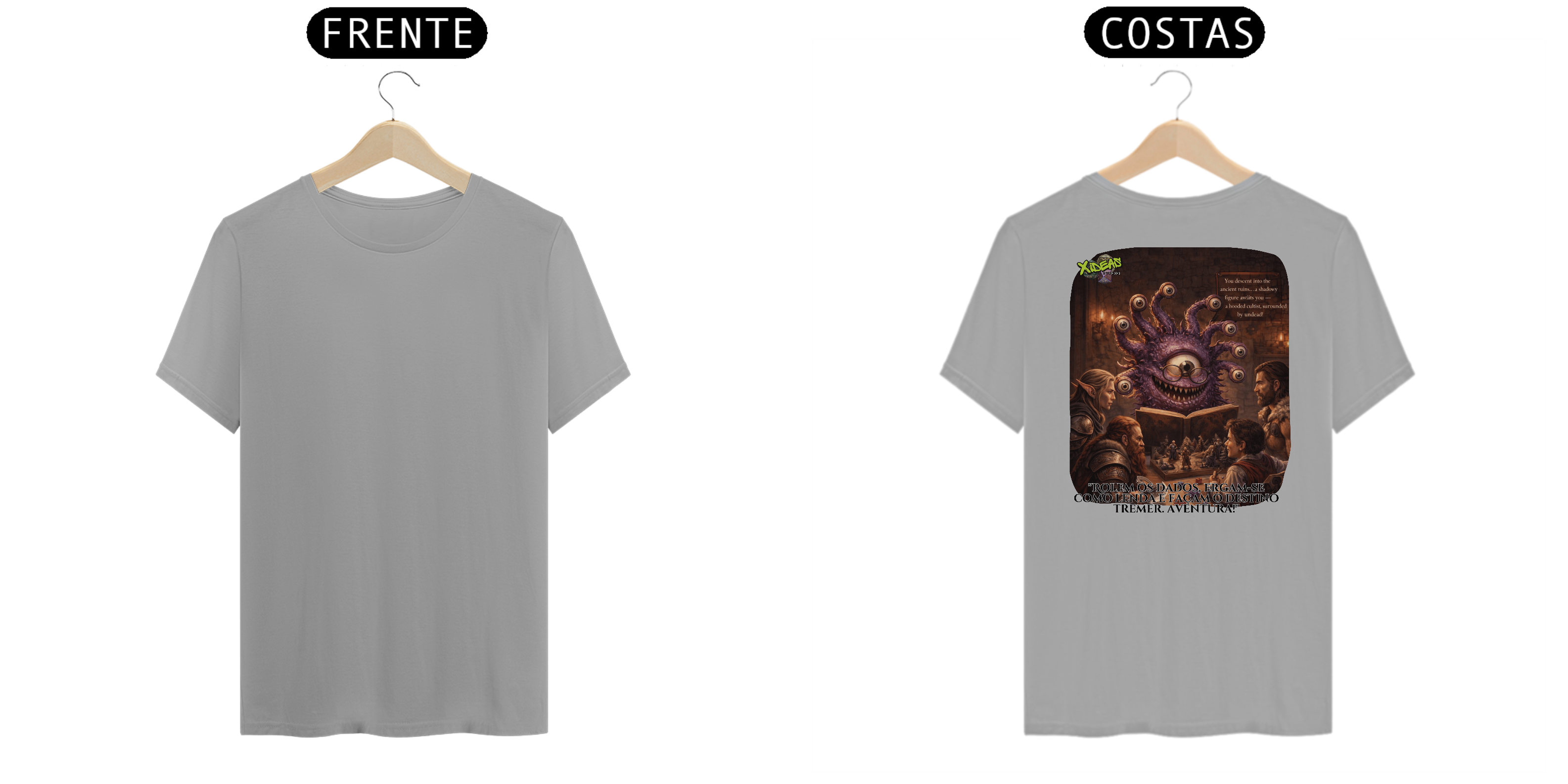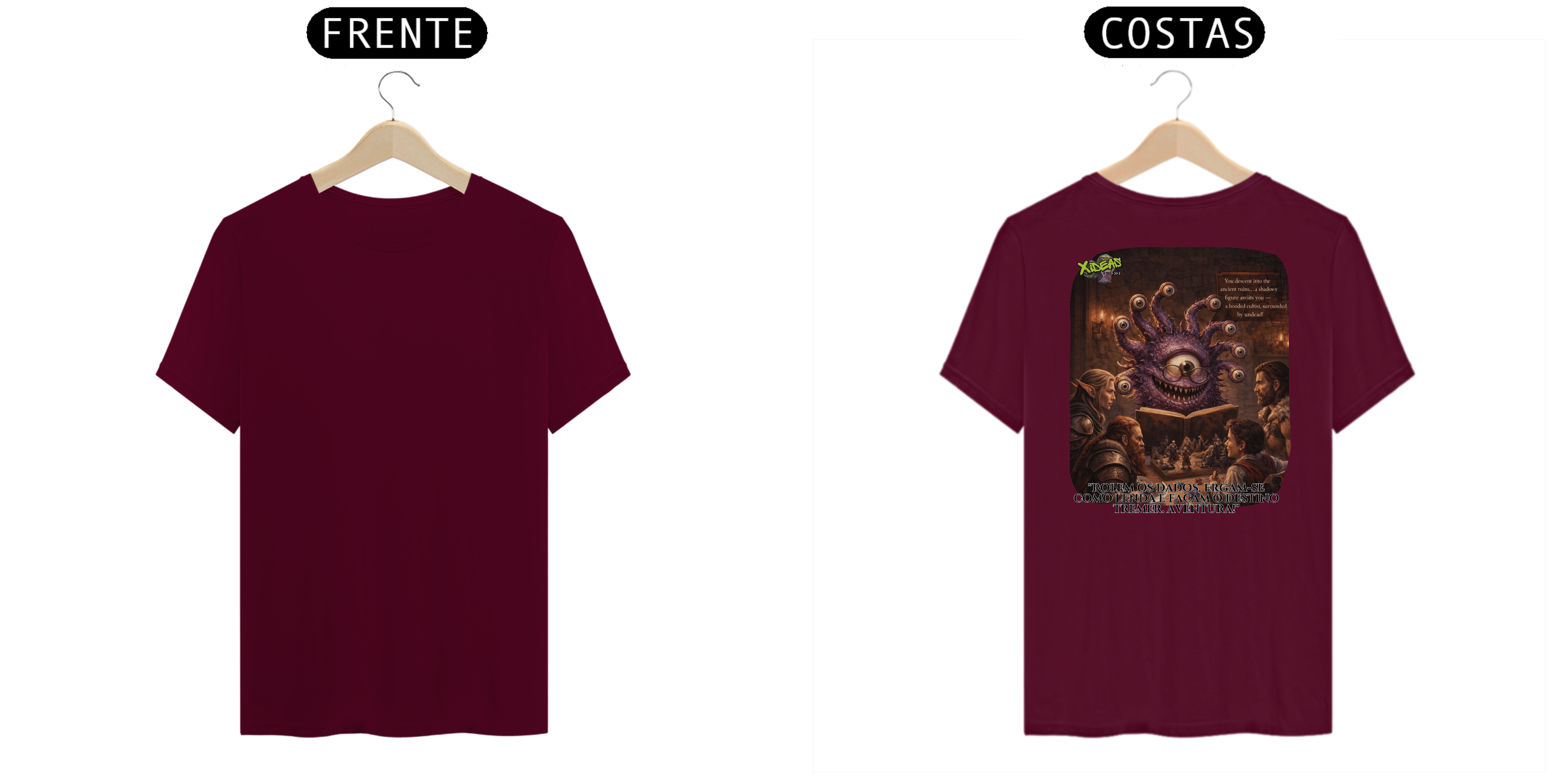Esta camisa exibe a essência épica do RPG: heróis reunidos à luz de tochas, dados lançados como relíquias sagradas e mapas marcados por destinos ainda não escritos. Cada detalhe da estampa evoca batalhas lendárias, juramentos antigos e a chama da imaginação. Não é apenas uma camisa, é um estandarte para quem carrega mundos inteiros na mente.