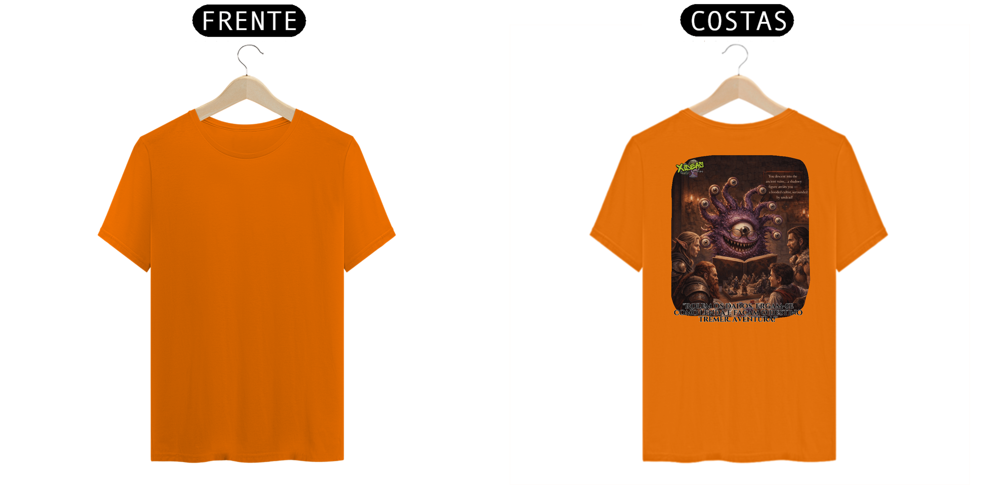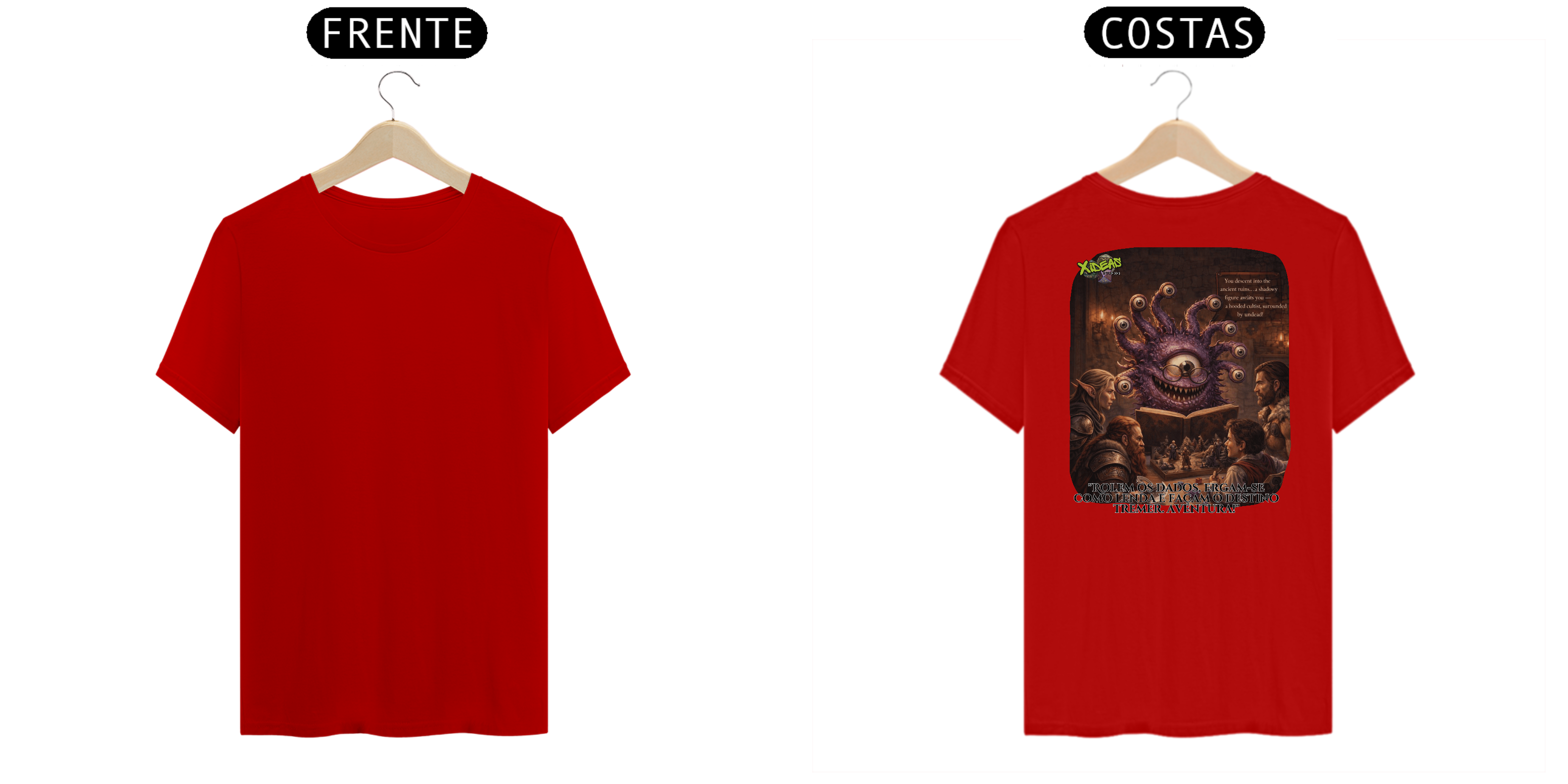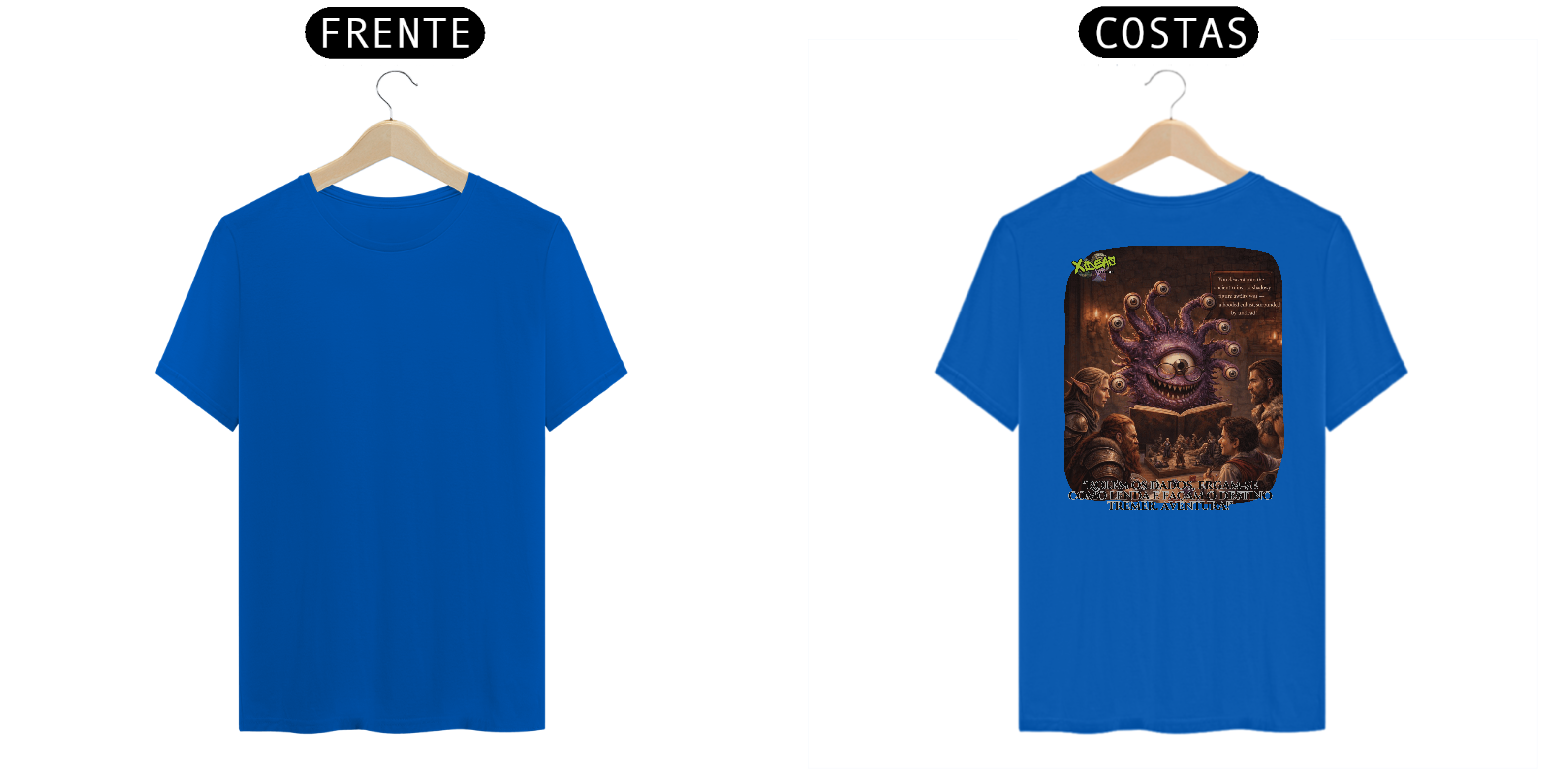 Esta camisa exibe a essência épica do RPG: heróis reunidos à luz de tochas, dados lançados como relíquias sagradas e mapas marcados por destinos ainda não escritos. Cada detalhe da estampa evoca batalhas lendárias, juramentos antigos e a chama da imaginação. Não é apenas uma camisa, é um estandarte para quem carrega mundos inteiros na mente.