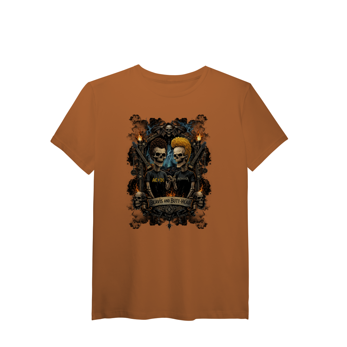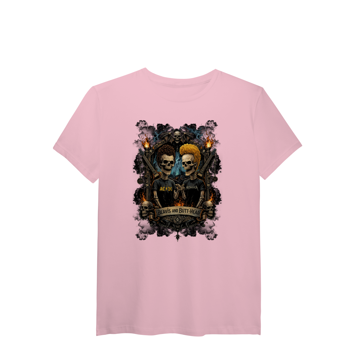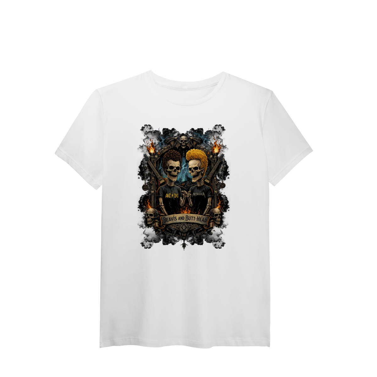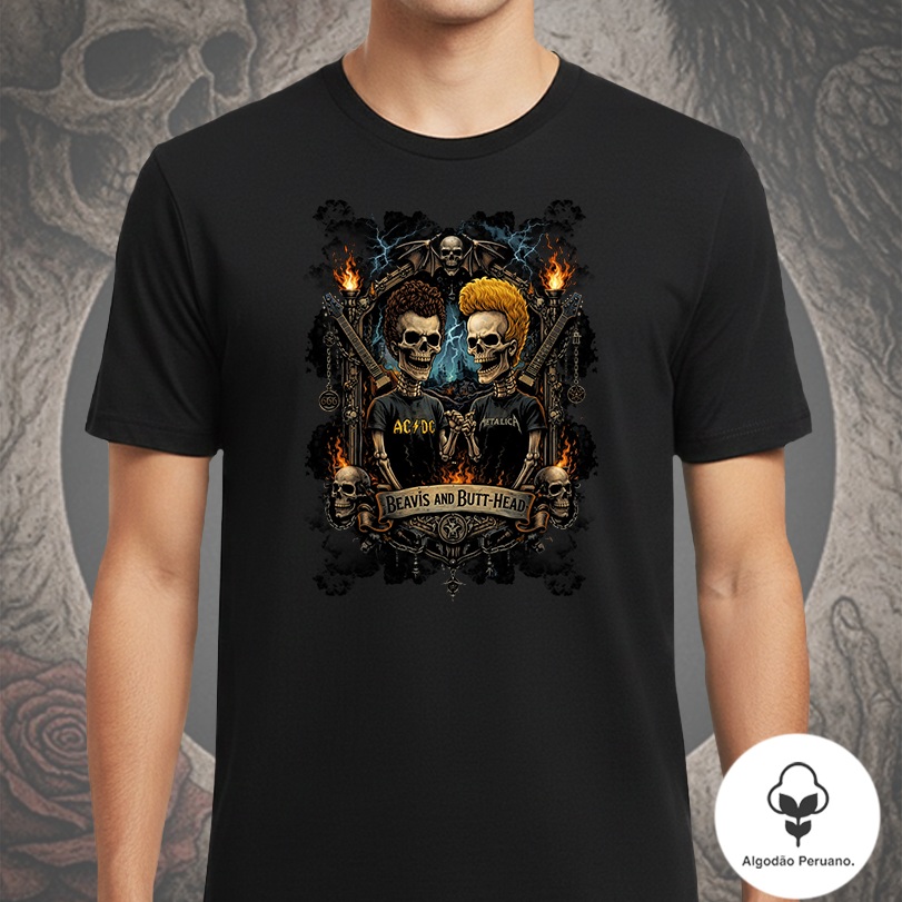 Uma releitura sombria e irreverente de dois ícones da cultura rock underground. A camiseta Beavis and Butt-Head Dark Skulls traz a dupla Beavis and Butt-Head transformados em caveiras estilosas, integradas a um brasão totalmente criado em Dark Art Rock, com atmosfera pesada, contraste forte e atitude provocadora.