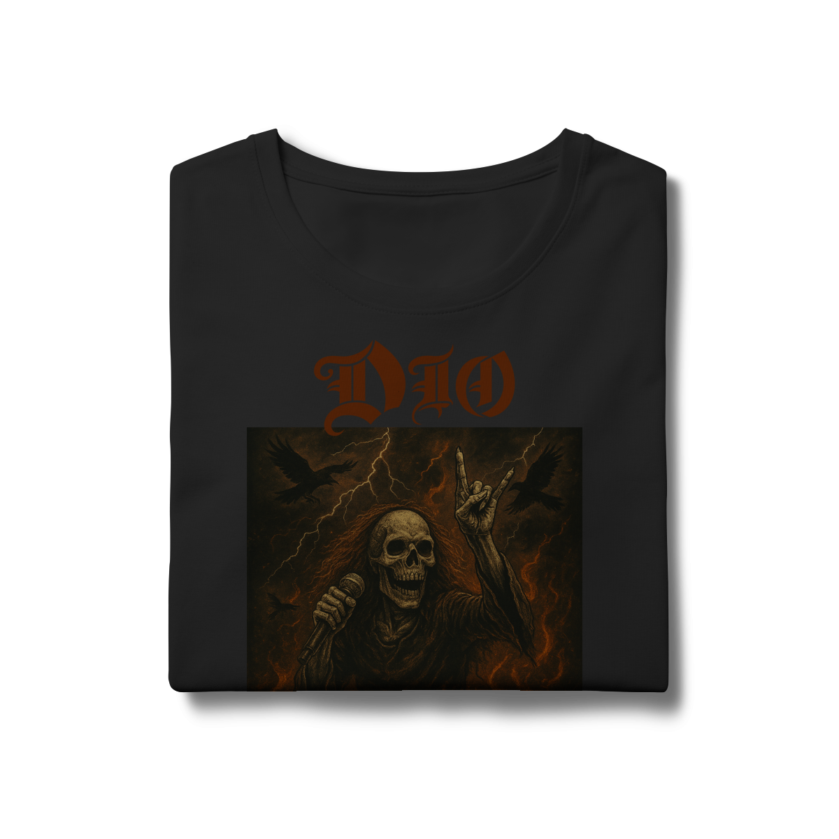 Uma homenagem eterna ao mestre do metal! Essa estampa sombria e poderosa traz Ronnie James Dio como uma figura lendária no além, empunhando o microfone e fazendo o famoso sinal do rock em meio às chamas e trovões.