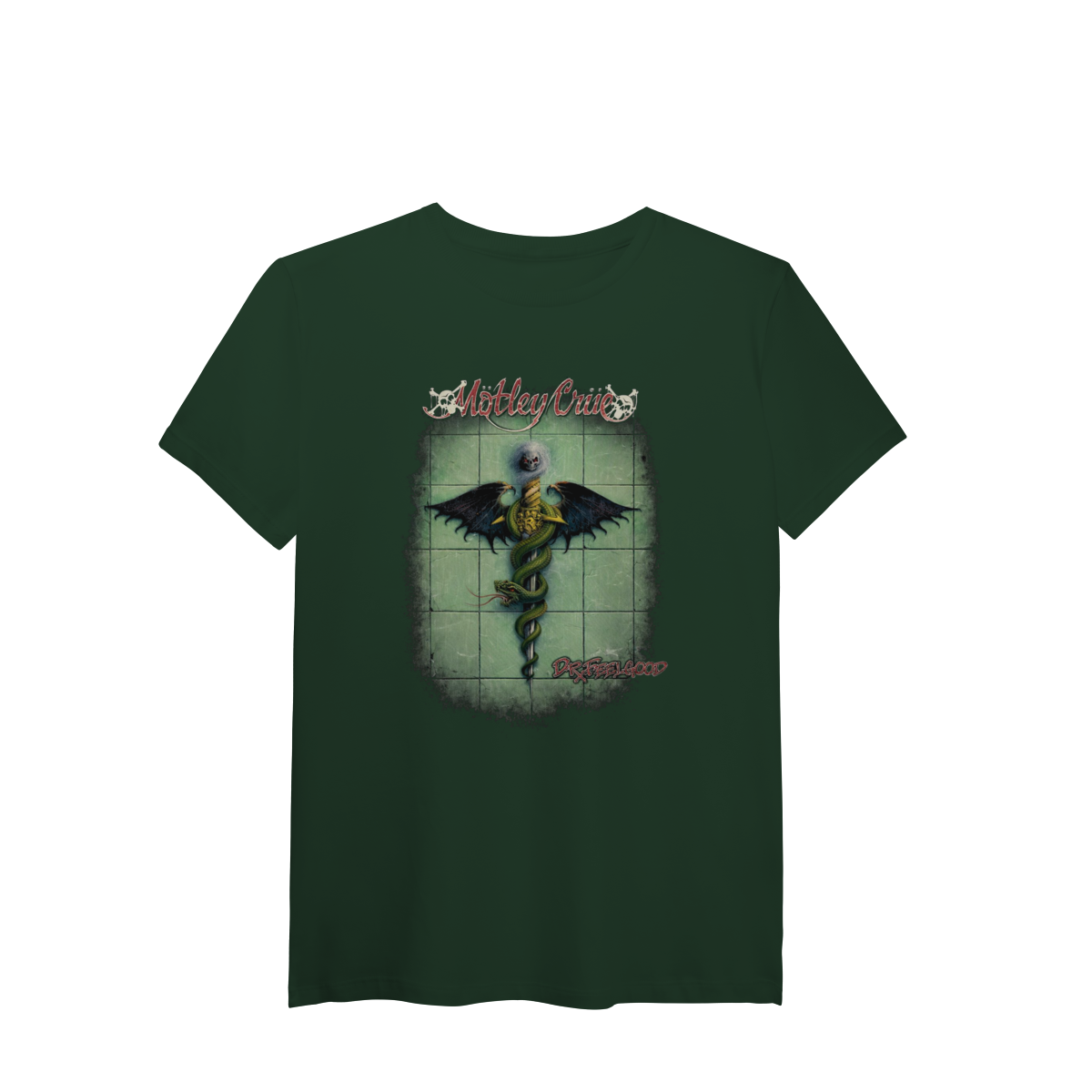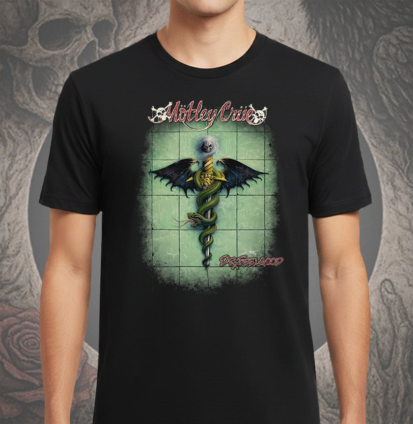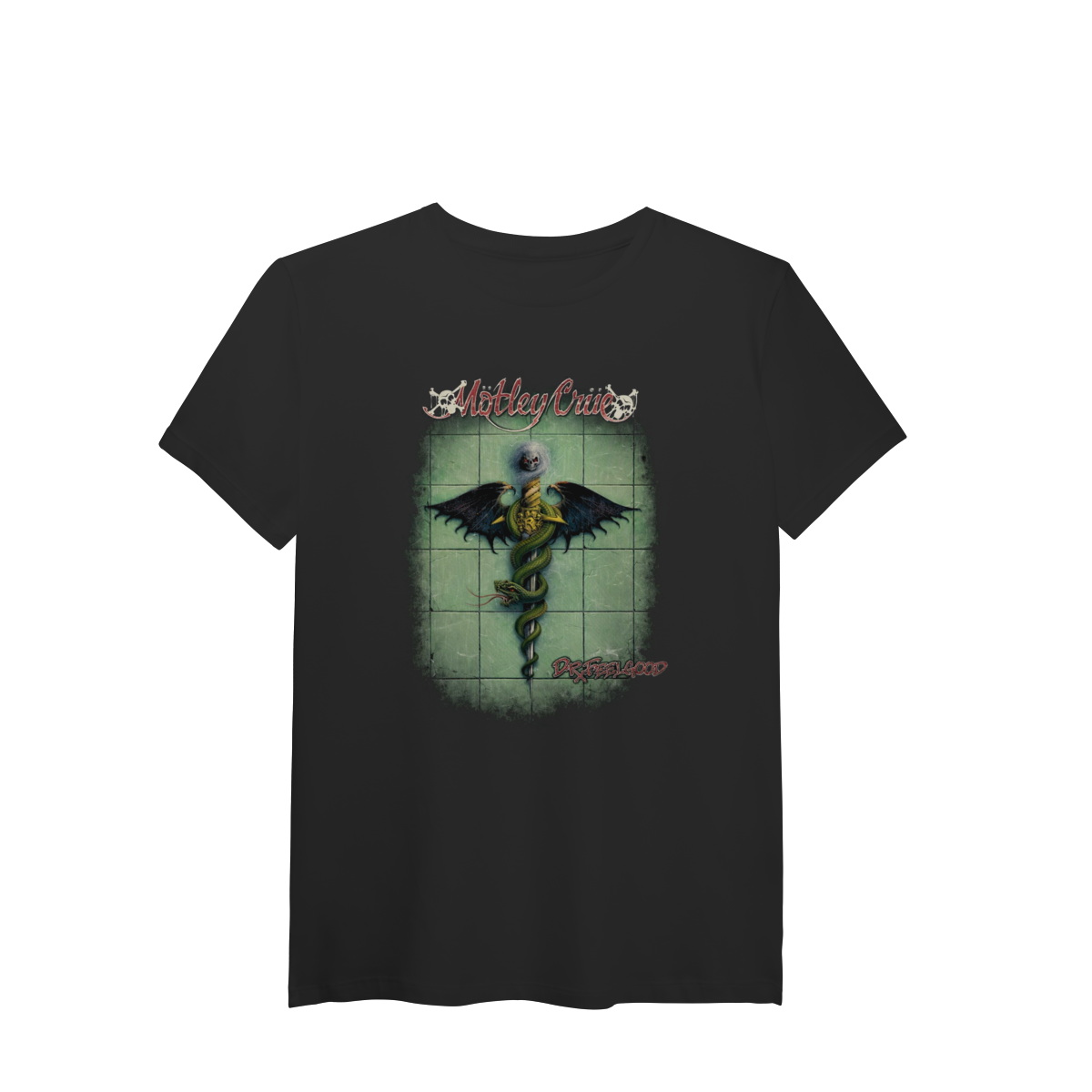 A estampa Dr. Feelgood traz a capa completa de um dos álbuns mais icônicos do Mötley Crüe, em uma versão full print que domina a camiseta e carrega toda a energia crua e decadente do rock dos anos 80.