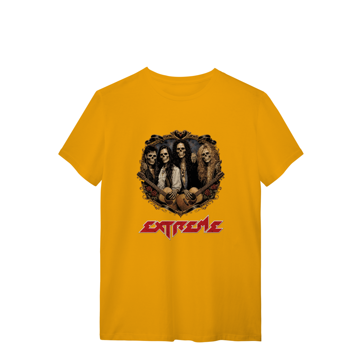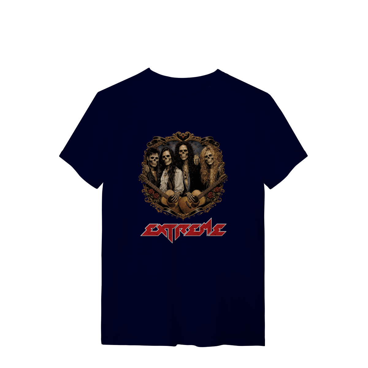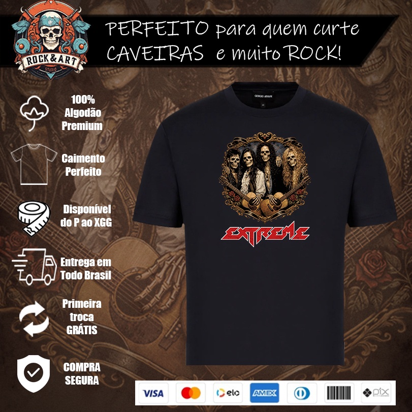 Uma releitura poderosa de uma das bandas mais marcantes do hard rock dos anos 90. A estampa Extreme Hard Skull apresenta a banda Extreme transformada em caveiras estilosas, reunidas dentro de um brasão trabalhado, com roupas, acessórios e símbolos que remetem diretamente ao auge da banda e à estética da década.