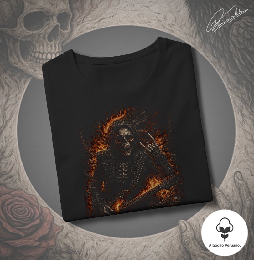 Uma estampa criada para representar o lado mais pesado e visceral do rock e do metal. A camiseta Heavy Skull Metal traz uma caveira vestindo jaqueta e roupas de couro, segurando uma guitarra, cercada por crânios, correntes e uma aura flamejante, tudo construído dentro da estética Dark Art Rock.