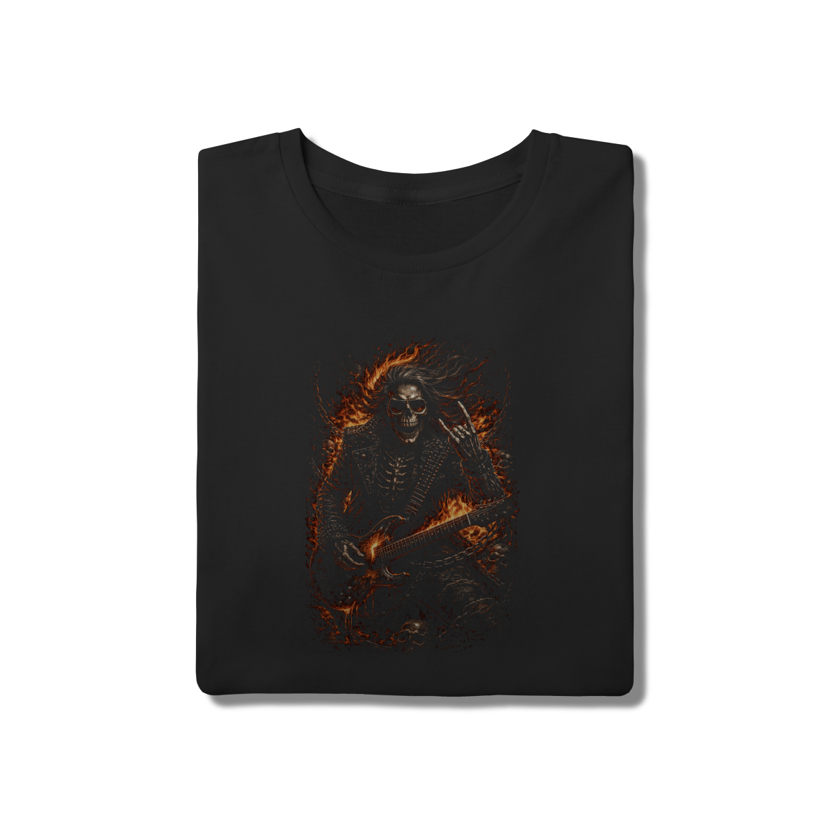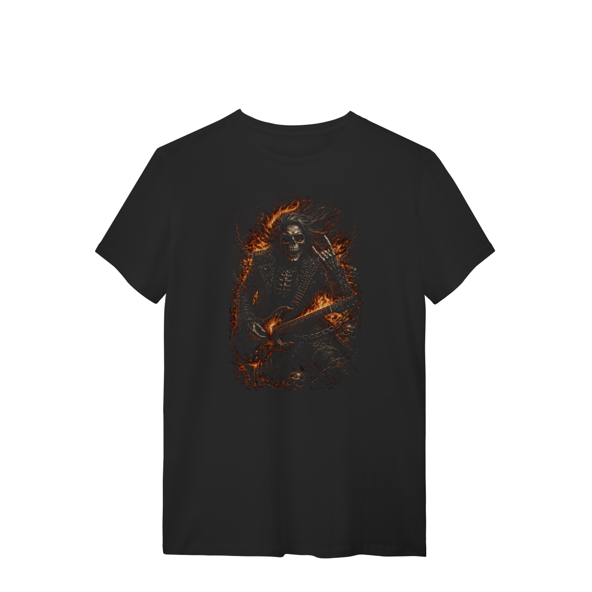 Uma estampa criada para representar o lado mais pesado e visceral do rock e do metal. A camiseta Heavy Skull Metal traz uma caveira vestindo jaqueta e roupas de couro, segurando uma guitarra, cercada por crânios, correntes e uma aura flamejante, tudo construído dentro da estética Dark Art Rock.