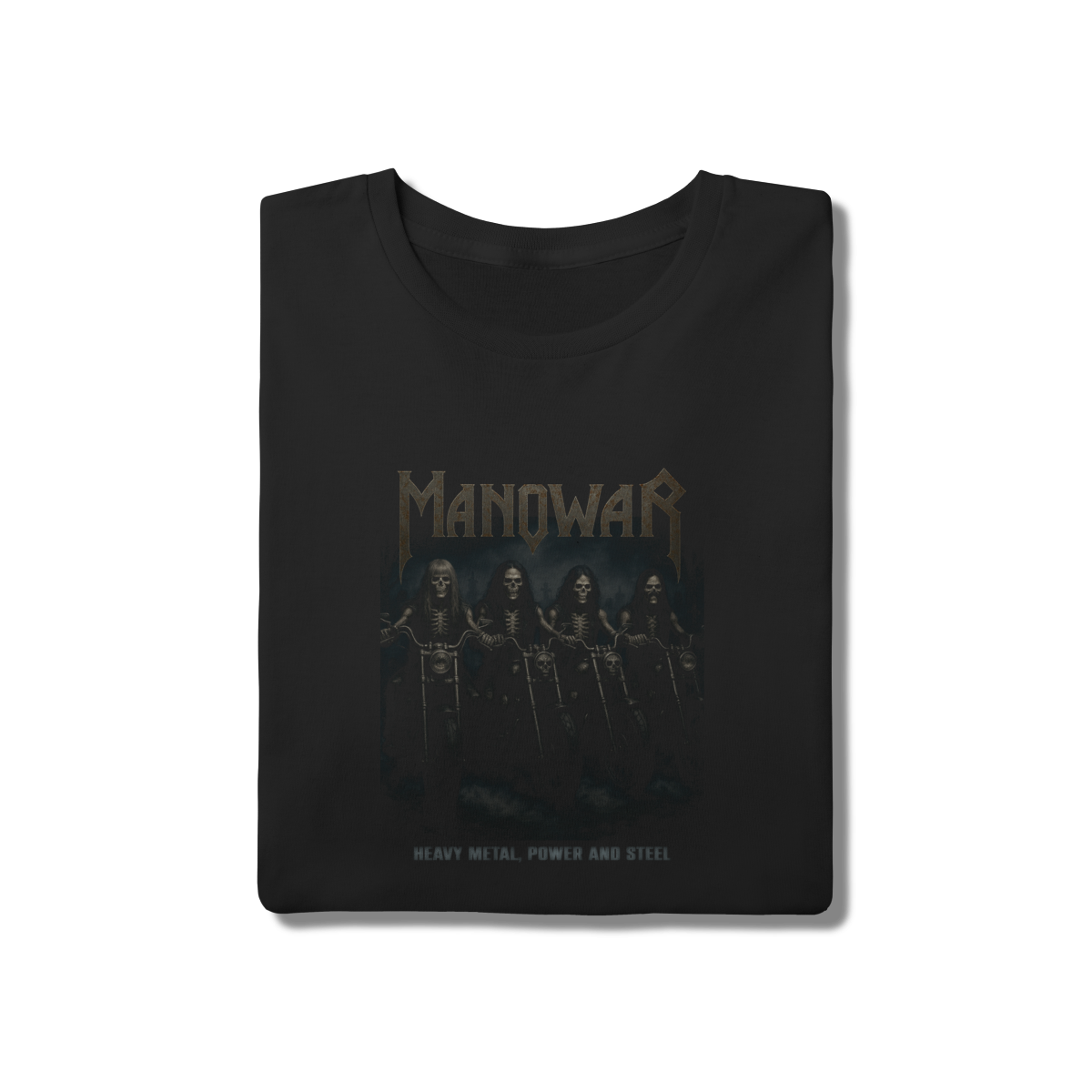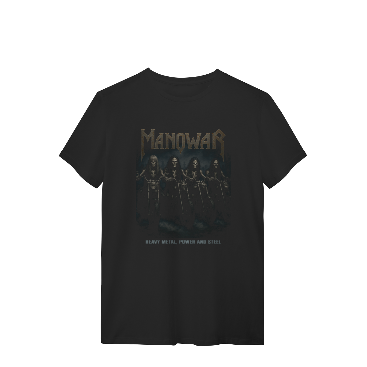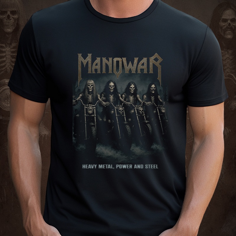 A fúria do verdadeiro Heavy Metal ganha forma nesta estampa épica! Inspirada na força e na atitude da lendária banda Manowar, essa camiseta traz os guerreiros do metal como caveiras motoqueiras, prontos para dominar a estrada do som pesado.