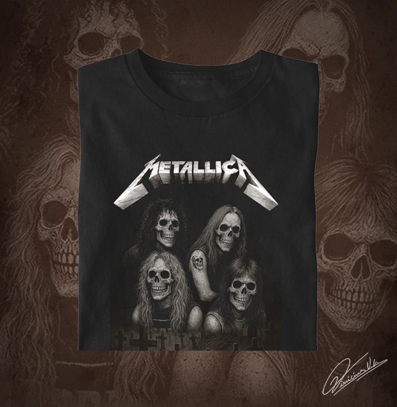 Uma viagem sombria ao auge do thrash metal! A era Master of Puppets nunca esteve tão viva (ou morta?) quanto nessa arte insana com os membros do Metallica em versão caveira — direto do cemitério do rock pesado!