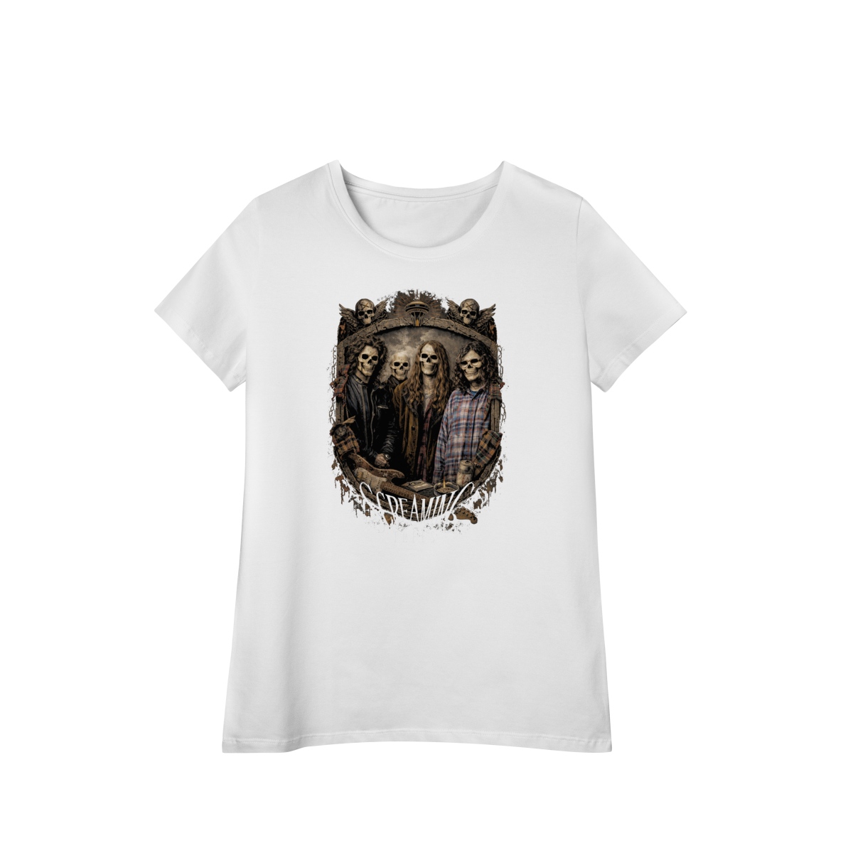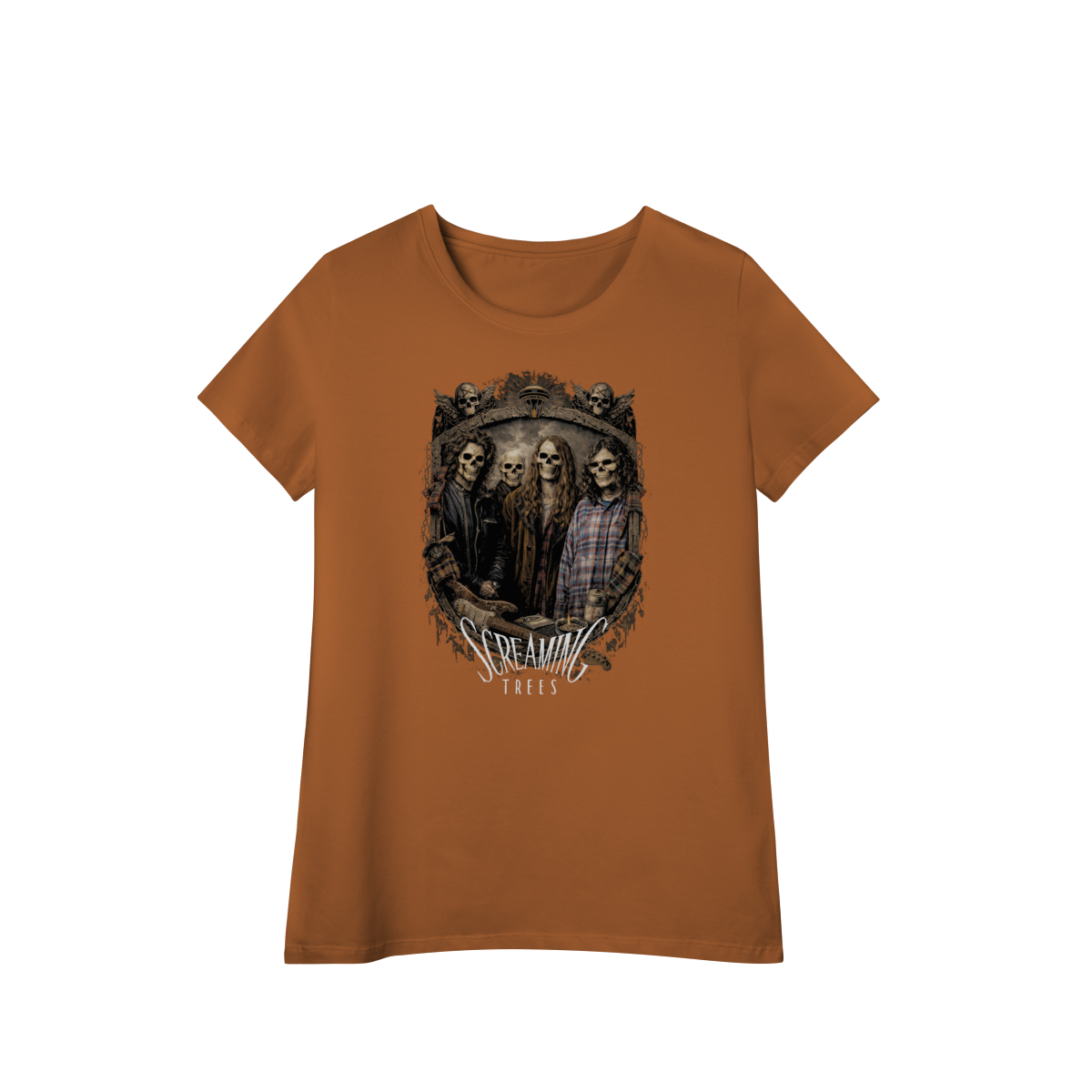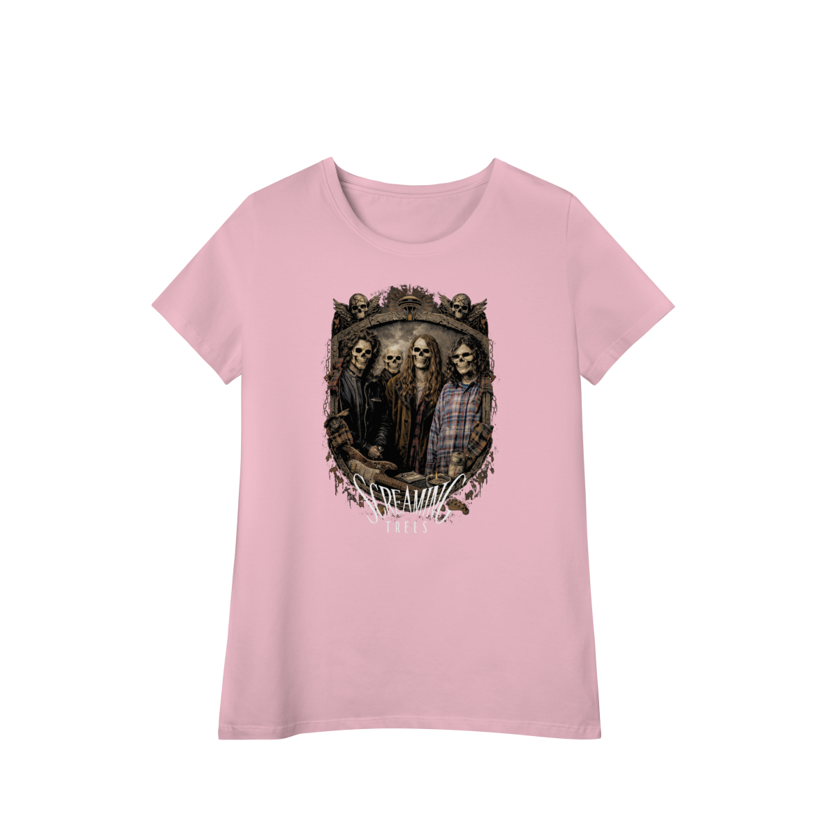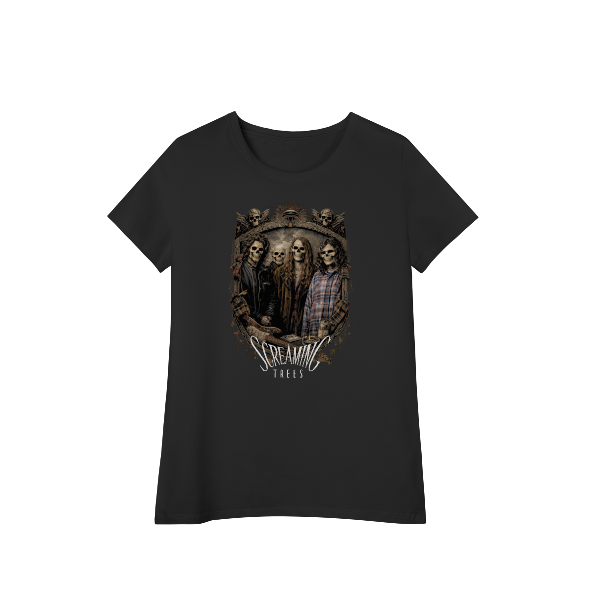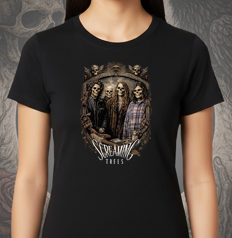 Uma homenagem sombria e intensa a uma das bandas mais autênticas do movimento grunge. A camiseta Screaming Trees Grunge Skulls traz a banda Screaming Trees transformada em caveiras estilosas, reunidas dentro de um brasão grunge pesado, com textura crua e atitude underground.