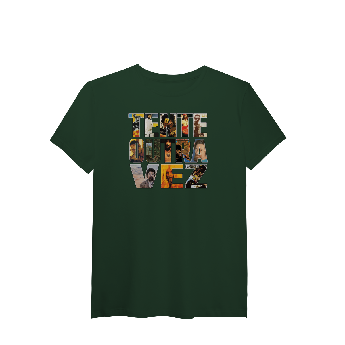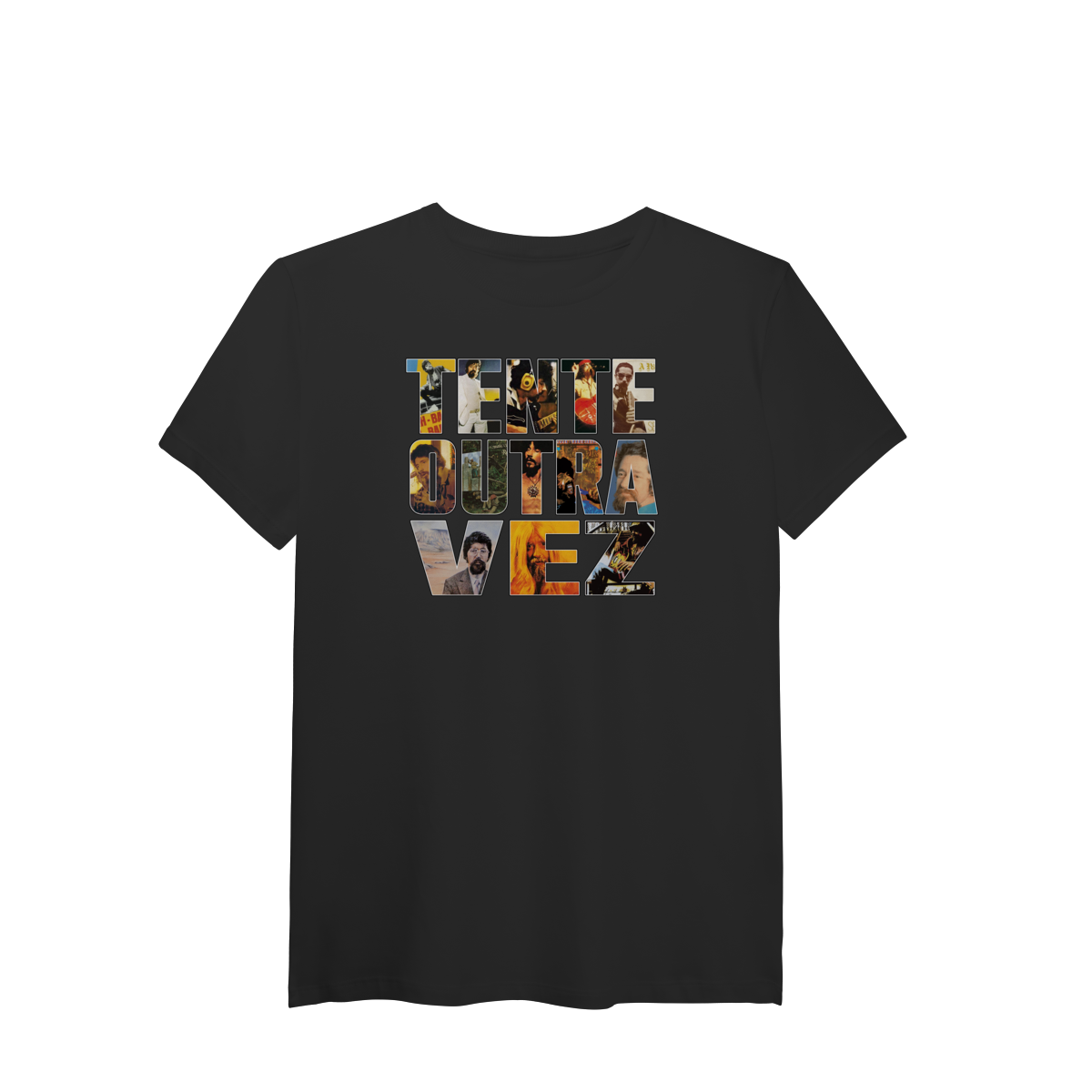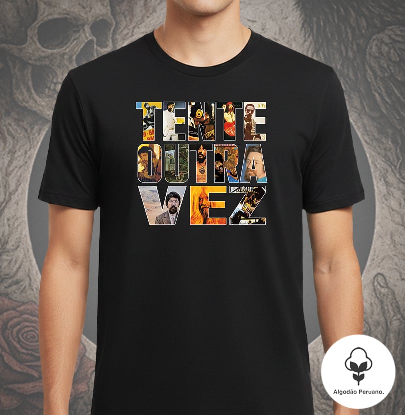 A camiseta Tente Outra Vez traz a frase “Tente outra vez”, onde cada letra é ilustrada com referências aos álbuns de Raul Seixas, formando uma única composição visual que convida a conhecer — ou relembrar — a trajetória desse artista eterno.
