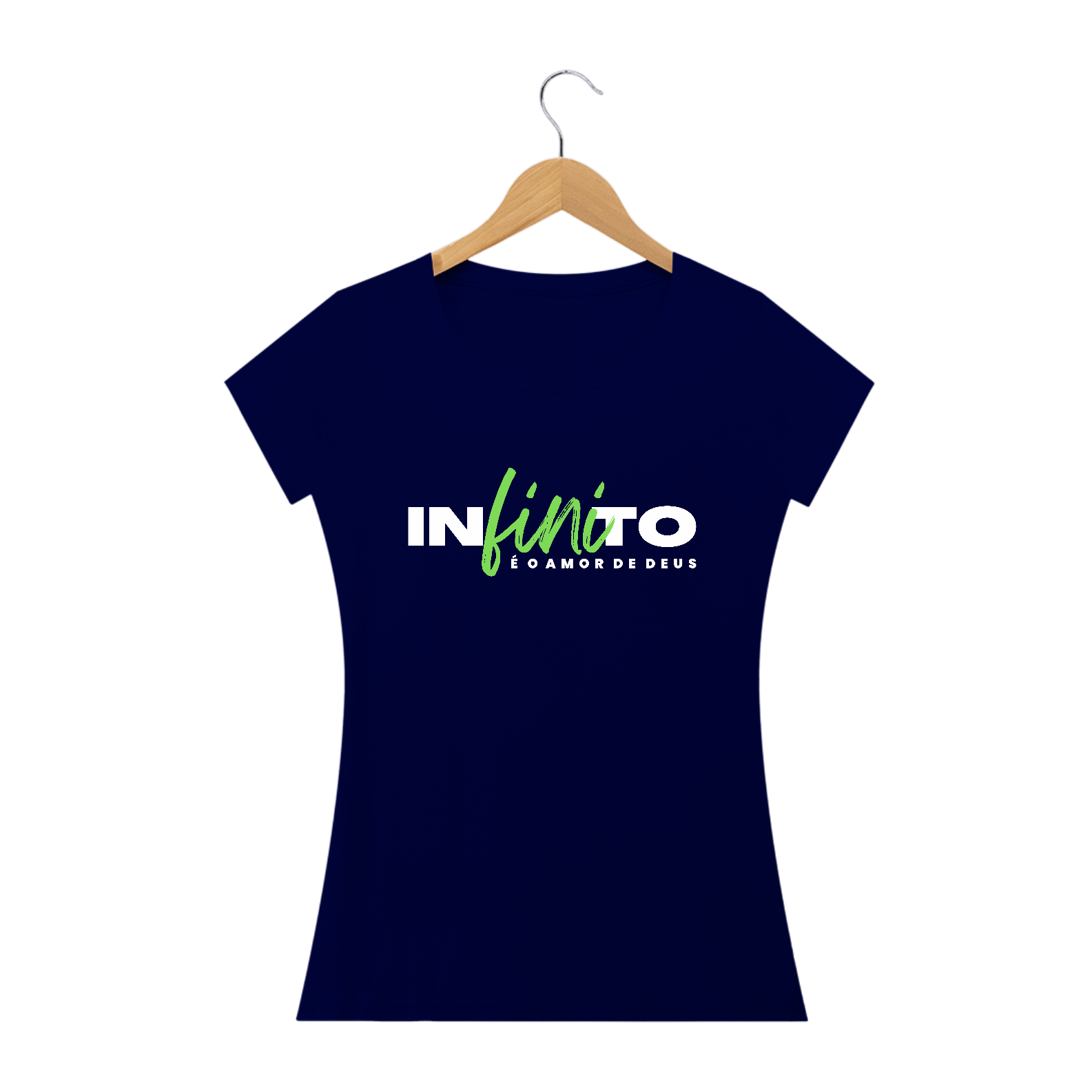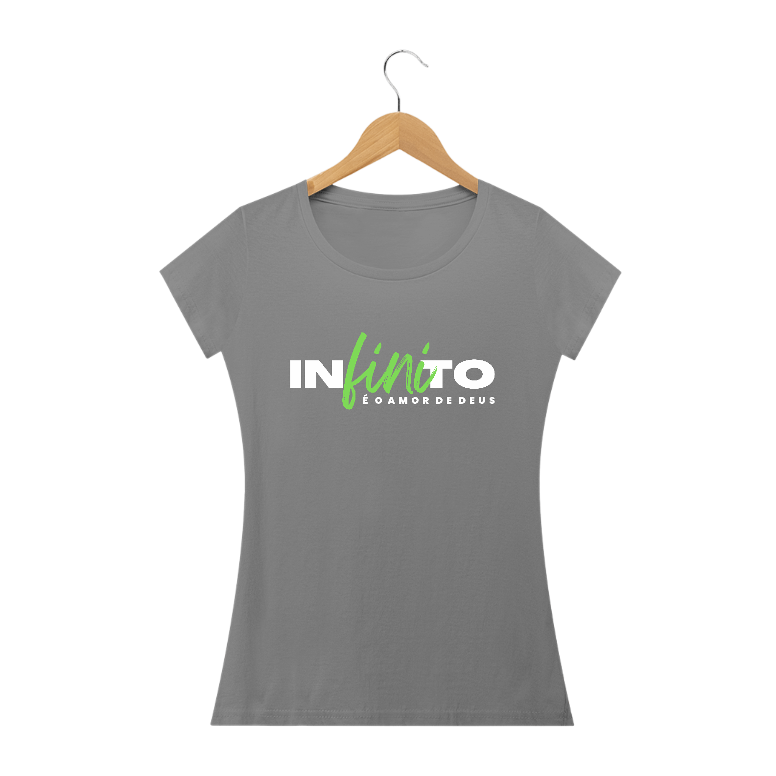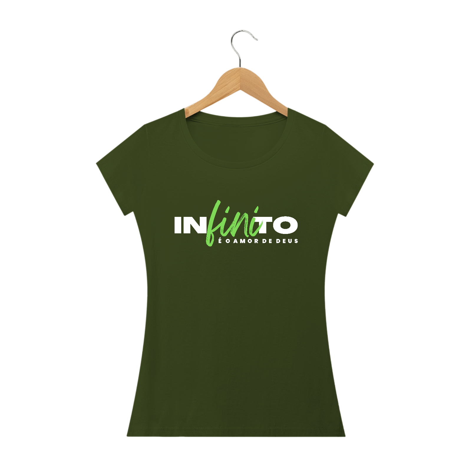 Camiseta Malha Cem por Cento Algodão, com estampa ''Infinito é o amor de Deus'' nas cores branco e verde.