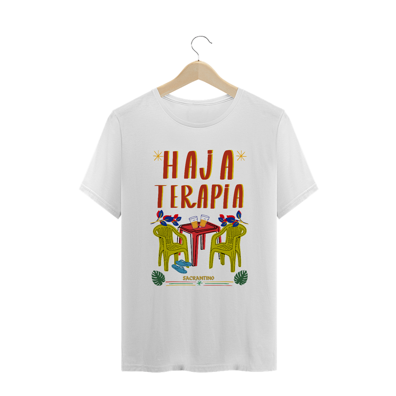 Camiseta plus size 100% algodão, modelo unissex com estampa Silk Digital, "Haja Terapia", coleção original Sacrantino latinidades 2025.