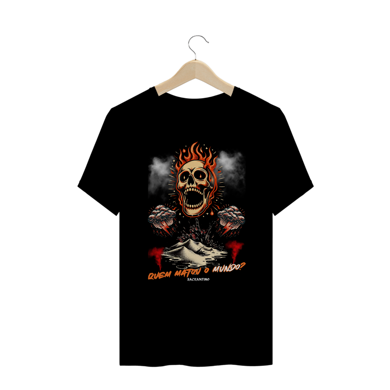Camiseta plus size 100% algodão, modelo unissex com estampa Silk Digital, "Quem matou o Mundo?", coleção original Sacrantino.