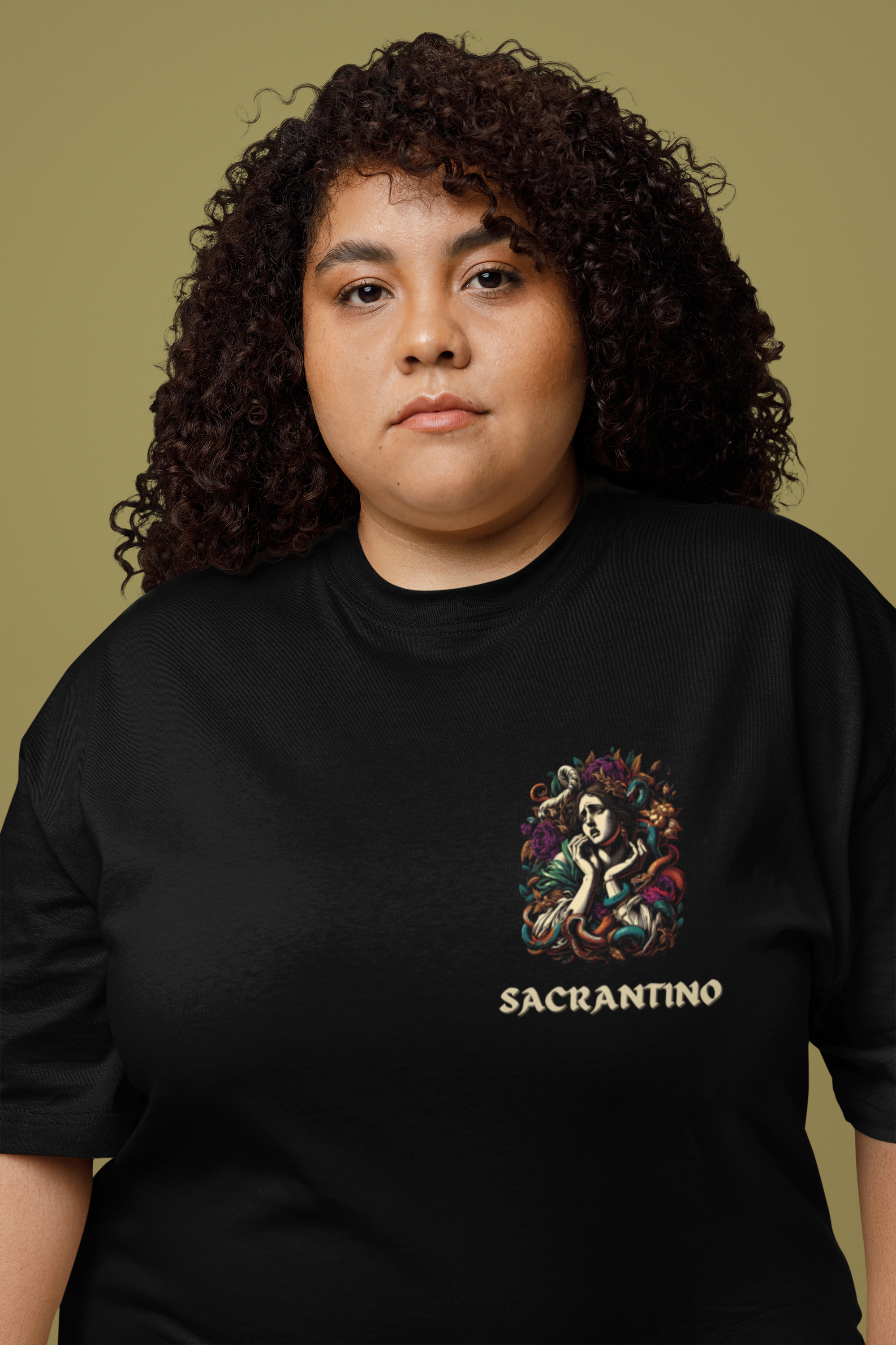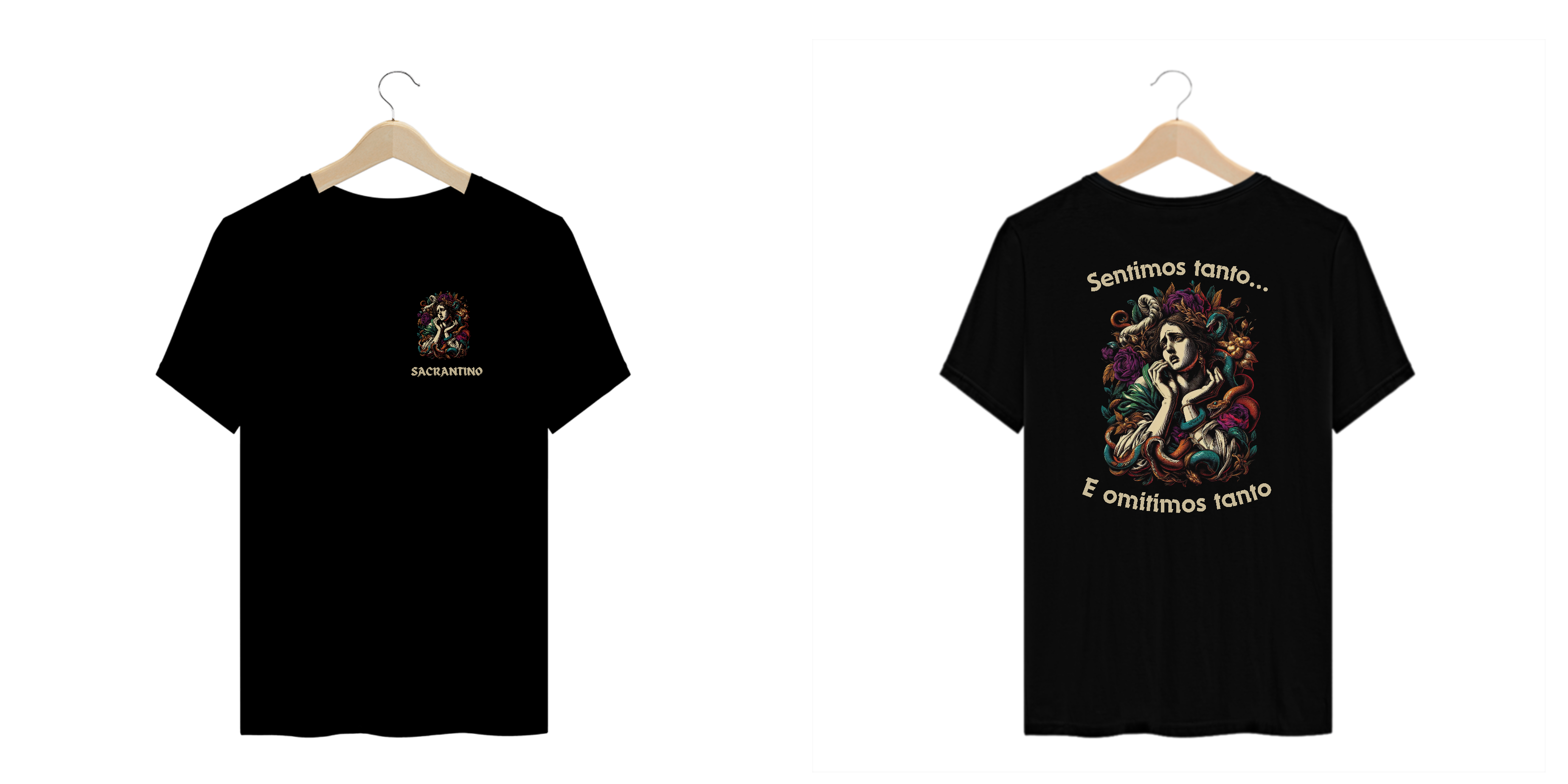 Camiseta 100% algodão, modelo unissex com estampa Silk Digital, "Sentimos tanto... E omitimos tanto", coleção original Sacrantino.