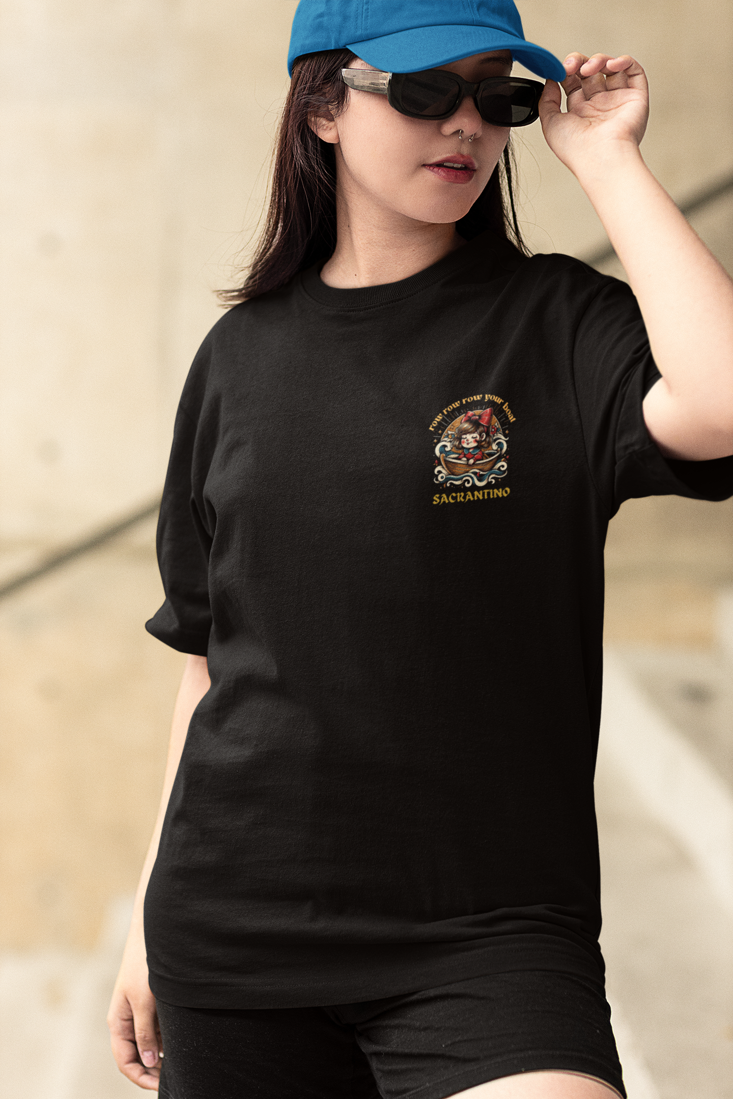 Camiseta 100% algodão, modelo unissex com estampa Silk Digital, "Row Your Boat",coleção original Sacrantino.