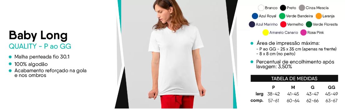Composição: 100% algodão, meia malha penteada, costura reforçada, gola em ribana, 165g, fio 30.1.