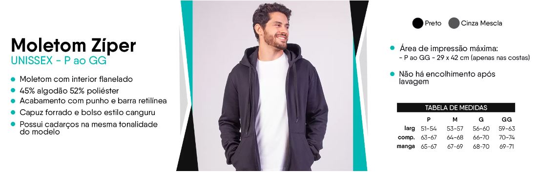 Material: Moletom 2 cabos, gramatura de 260g/m², proporcionando toque macio e aconchegante, ideal para dias frios.