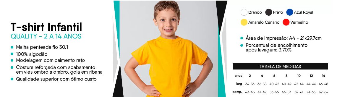 Composição: 100% algodão, meia malha penteada, costura reforçada, gola em ribana, 165g, fio 30.1.