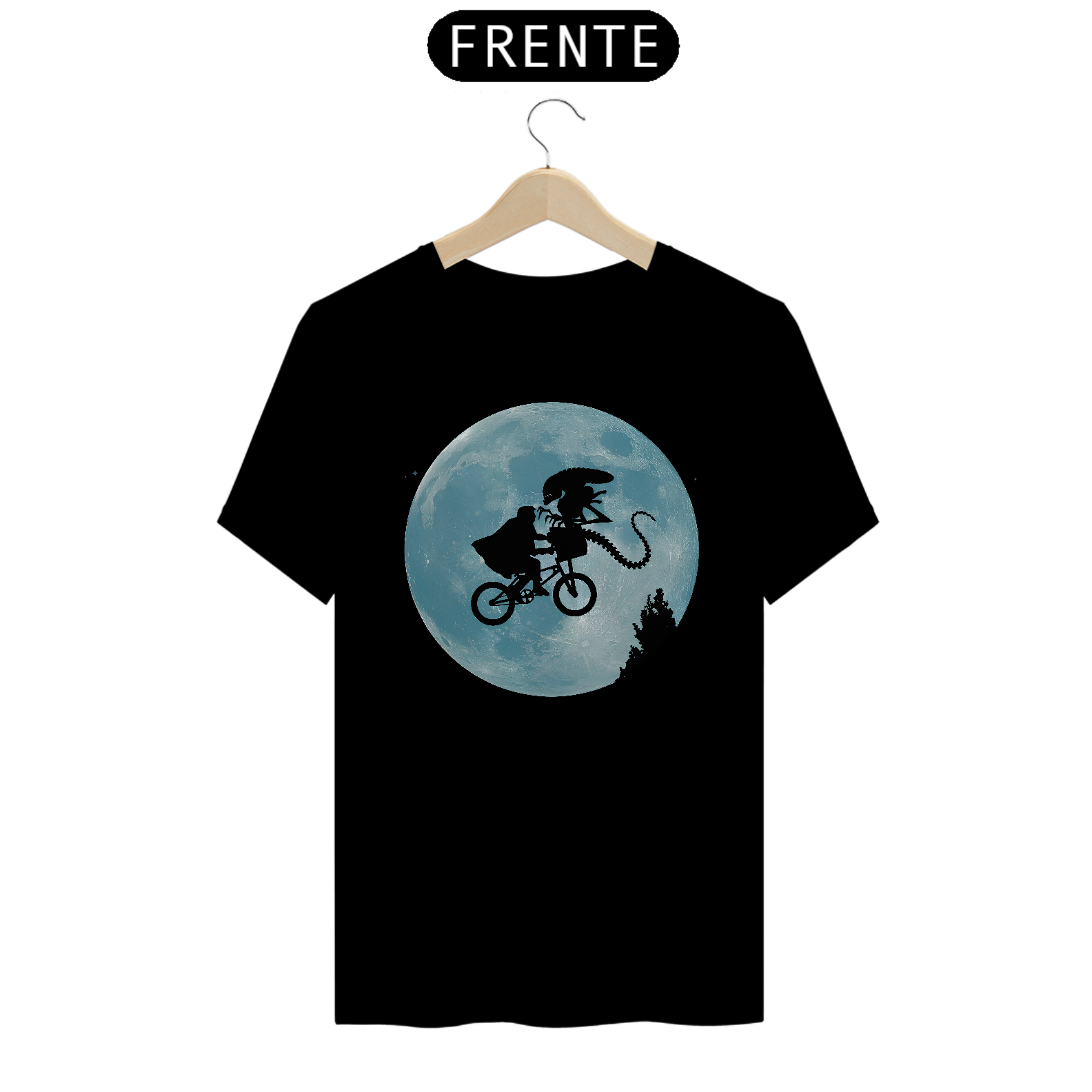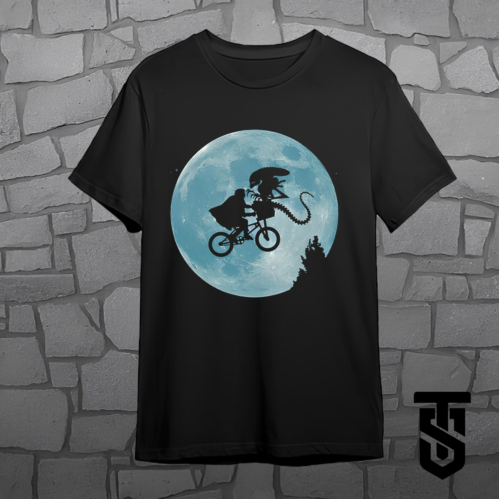"Leve a nostalgia e a diversão intergaláctica para o seu guarda-roupa com nossa camiseta 'Oitavo Passageiro Lunar'. Inspirada na cena icônica do filme 'ET - O Extraterrestre', esta camiseta apresenta uma divertida reviravolta, substituindo o clássico ET na bicicleta por um alienígena da franquia 'Alien - O Oitavo Passageiro', sendo levado na cesta pelo protagonista. Com detalhes vibrantes e uma estampa de alta qualidade, esta camiseta é uma escolha perfeita para os fãs de ficção científica que apreciam uma pitada de humor cósmico. Seja para um dia casual ou uma maratona de filmes, esta camiseta é garantia de estilo e conversa garantida!"