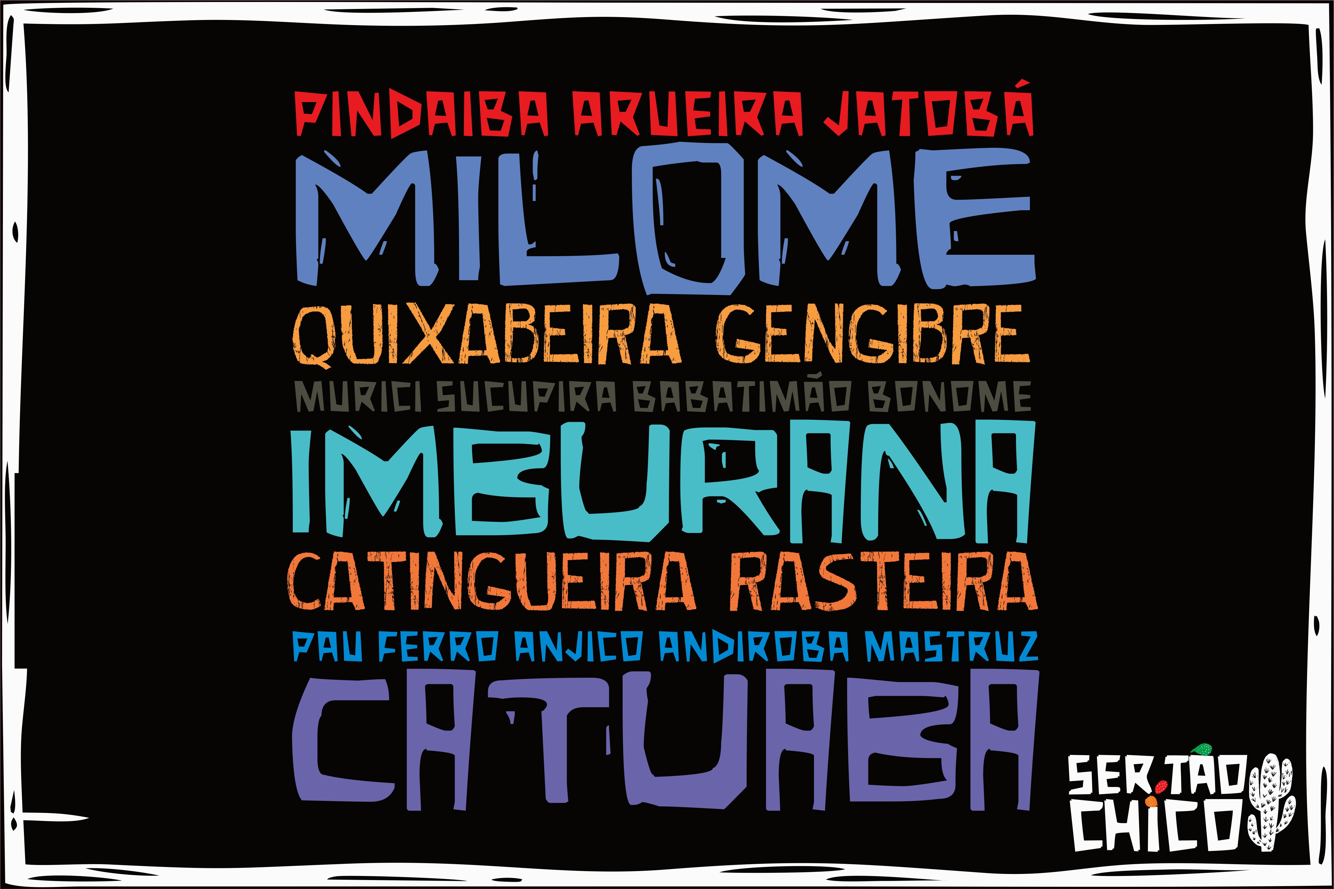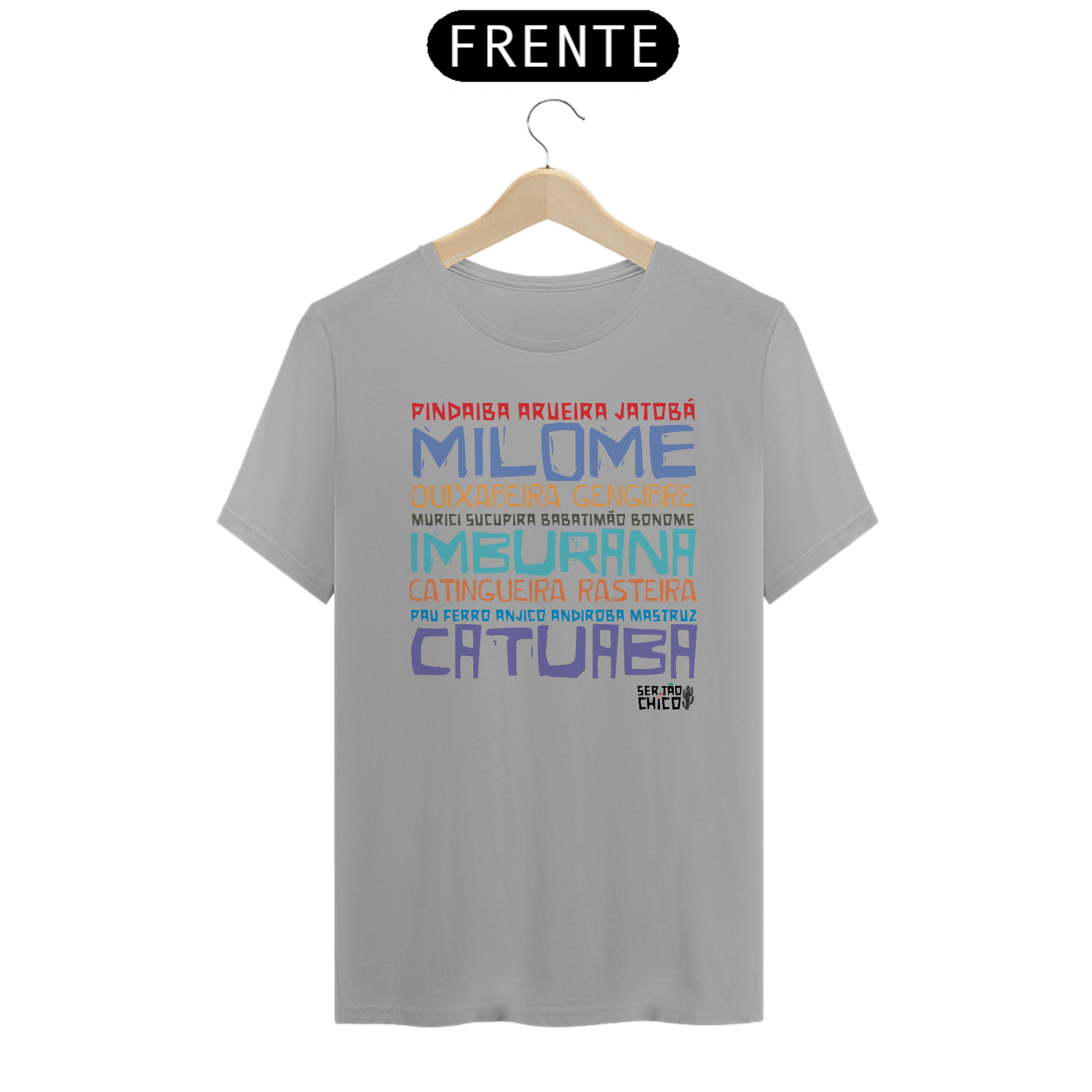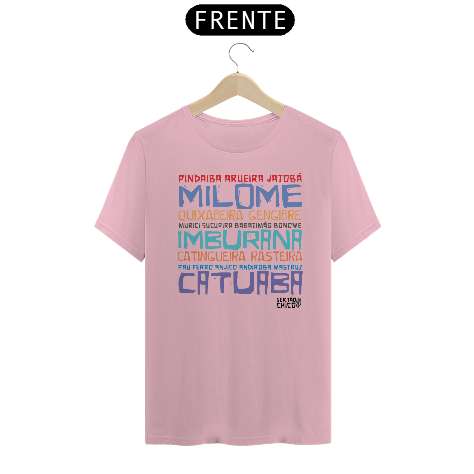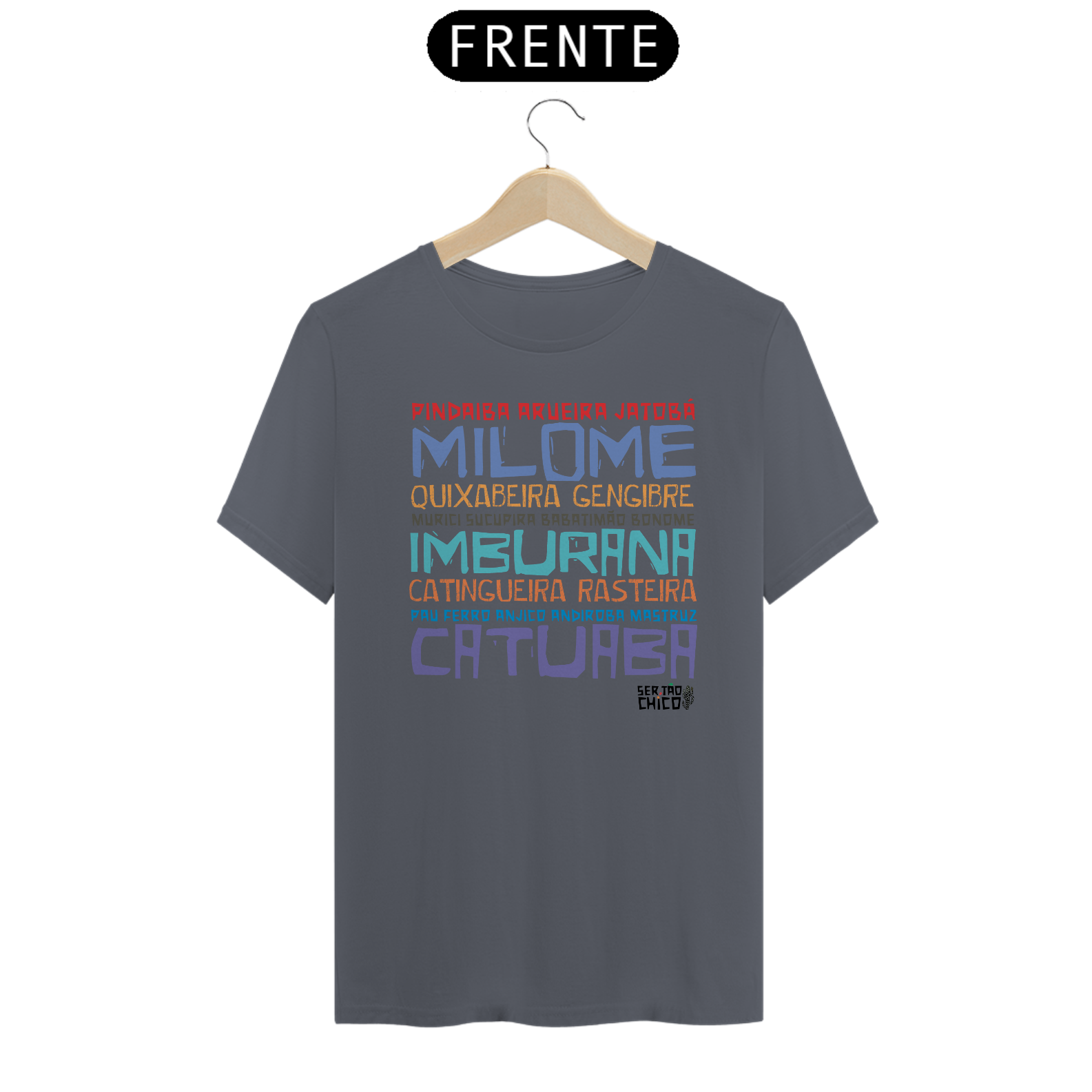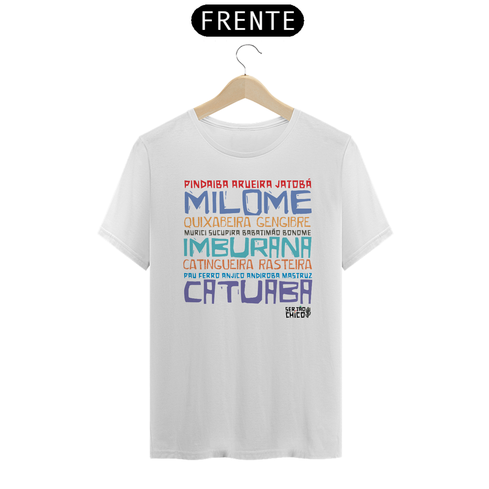 Camiseta em malha 100% algodão com lista de cachaças temperadas encontradas pelo sertão afora